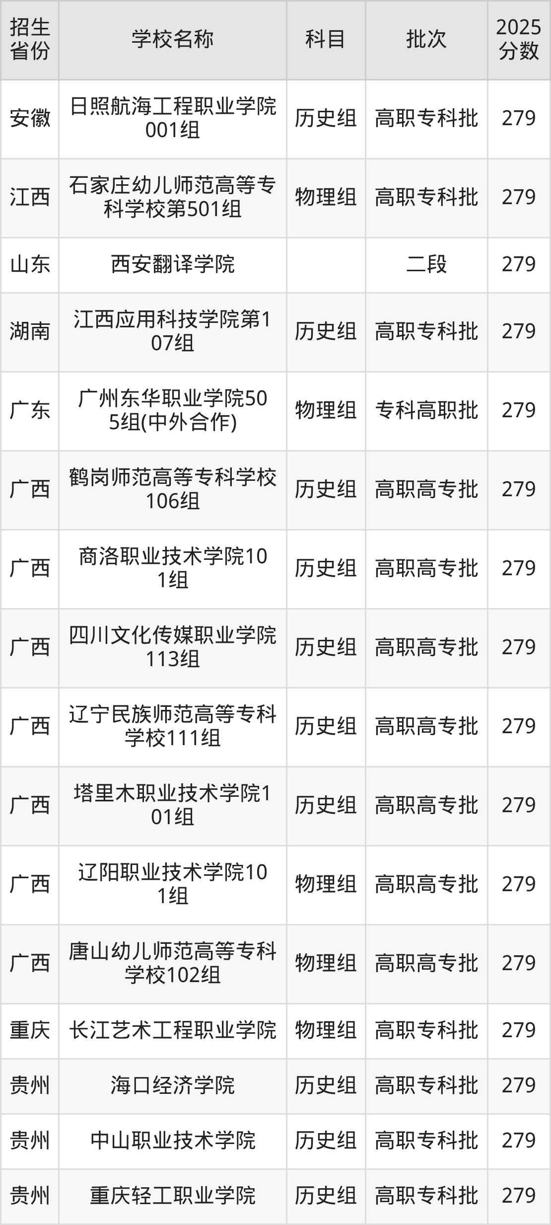 安徽省历史组分数线是279分的文科大学有:广东艺术职业学院、日照航海工程职业学院。