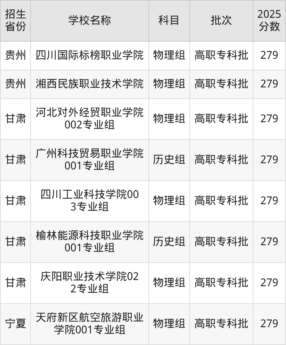 贵州省物理组分数线是279分的文科大学有:四川国际标榜职业学院、湘西民族职业技术学院。