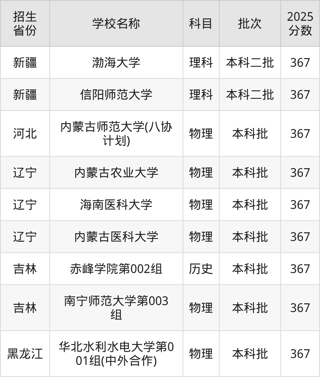 筛选全国各省2025年录取分数线为367分的一本大学如下: