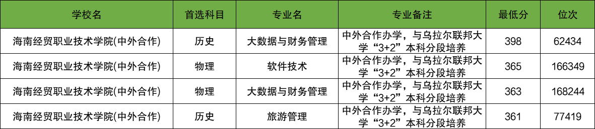贵州历史组3+2专本贯通录取分数线最低是361分,录取分数线最低的学校为海南经贸职业技术学院旅游管理专业。最难考的则是海南经贸职业技术学院大数据与财务管理专业,2024年最低分是398分。