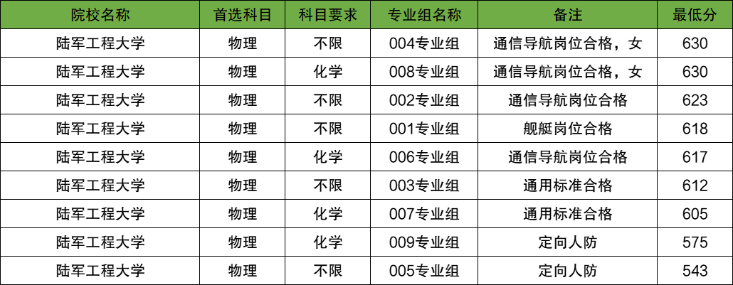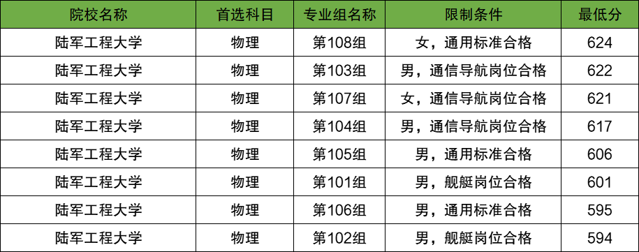 在物理类中共有8个专业组招生,最高分专业组为第108组(通用标准合格),要求只限女生报考,分数线为624分;最低分专业组为第102组(舰艇岗位合格),要求只限男生报考,需要在594分。