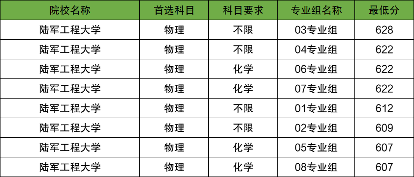 在物理类中共有8个专业组招生,最高分专业组需要628分,再选科目不限;最低分专业组607分,再选科目要求选择化学。