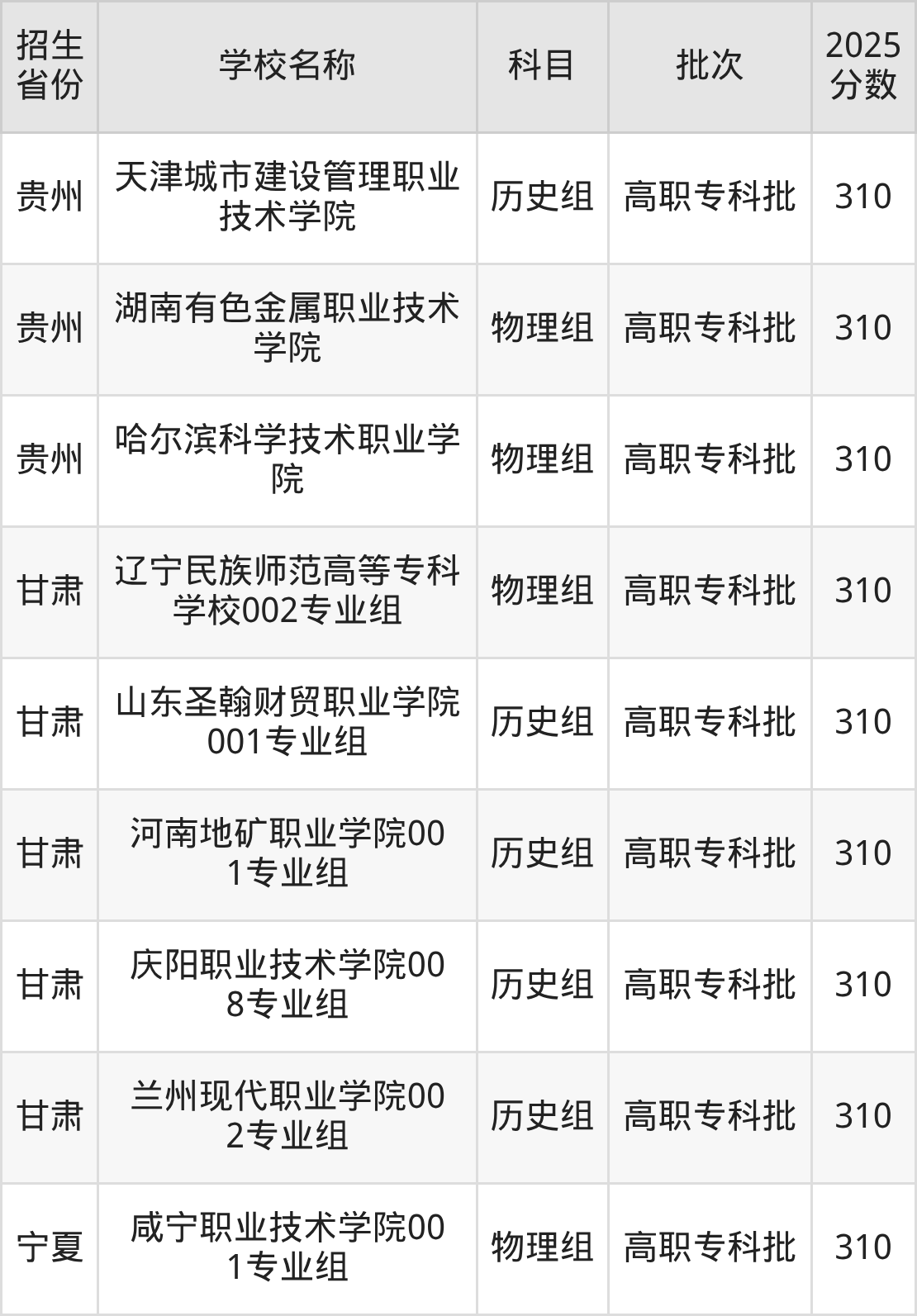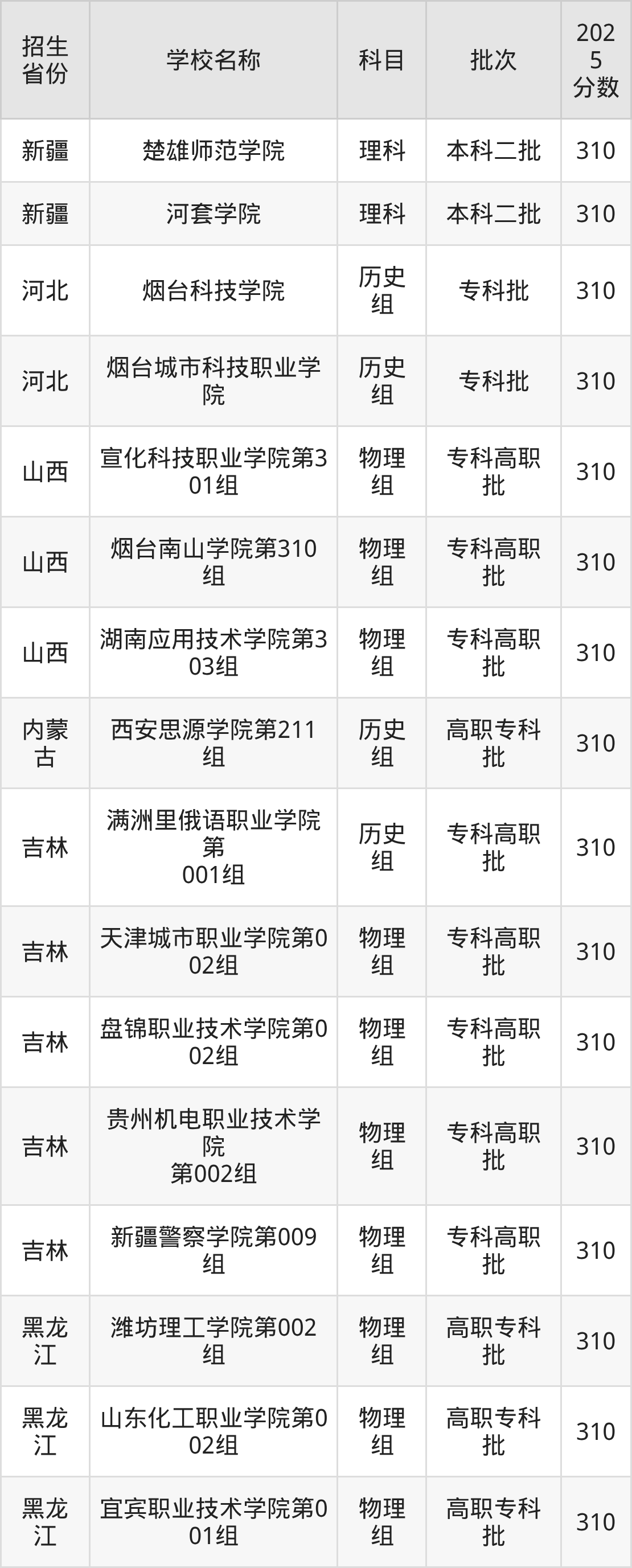 筛选全国各省2025年录取分数线为310分的文科大学如下: