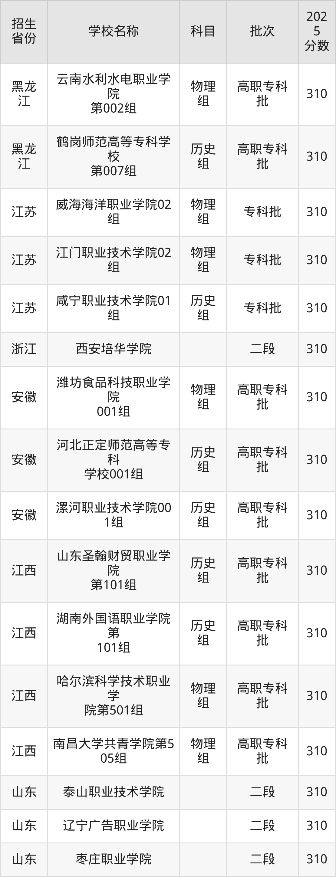 江西省历史组分数线是310分的文科大学有:山东圣翰财贸职业学院、湖南外国语职业学院。