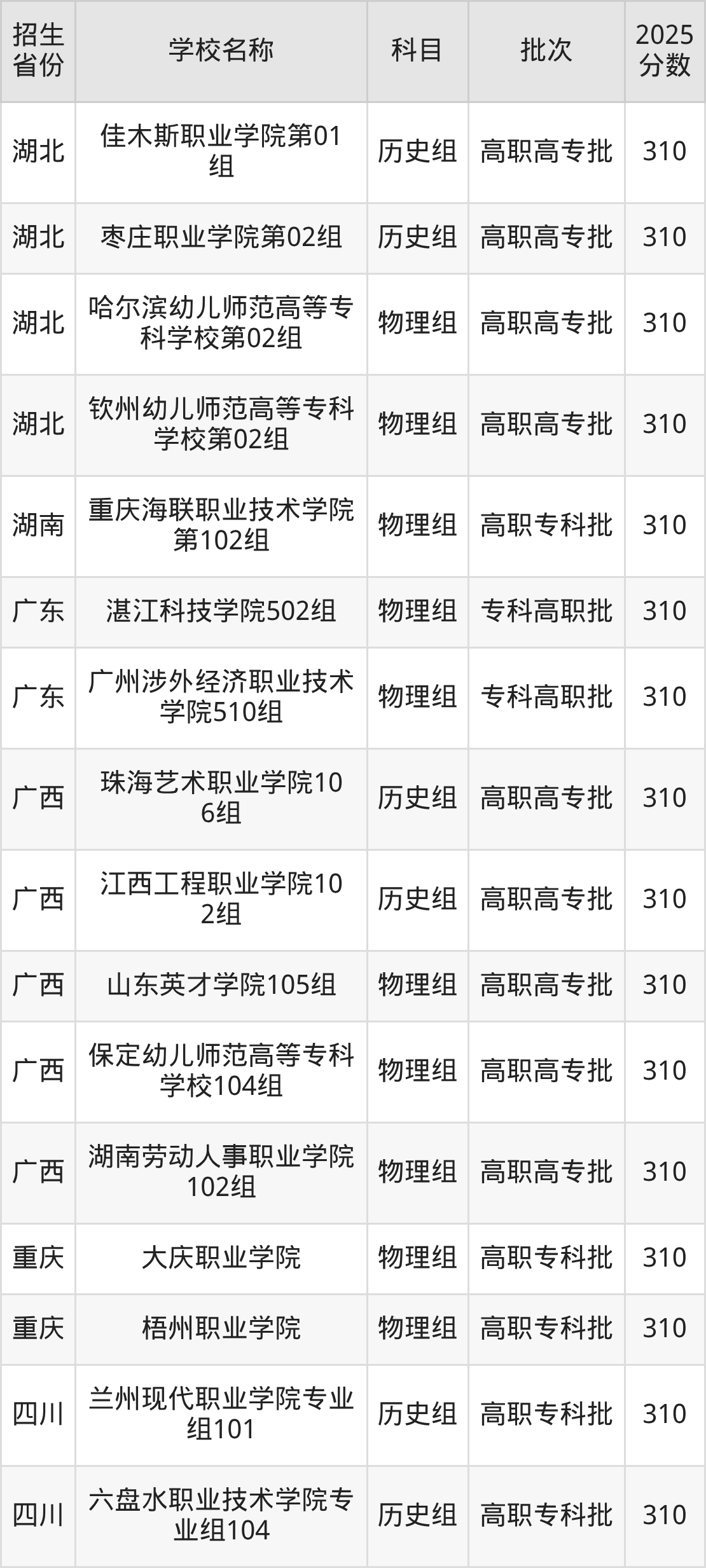 湖北省历史组分数线是310分的文科大学有:佳木斯职业学院、枣庄职业学院。