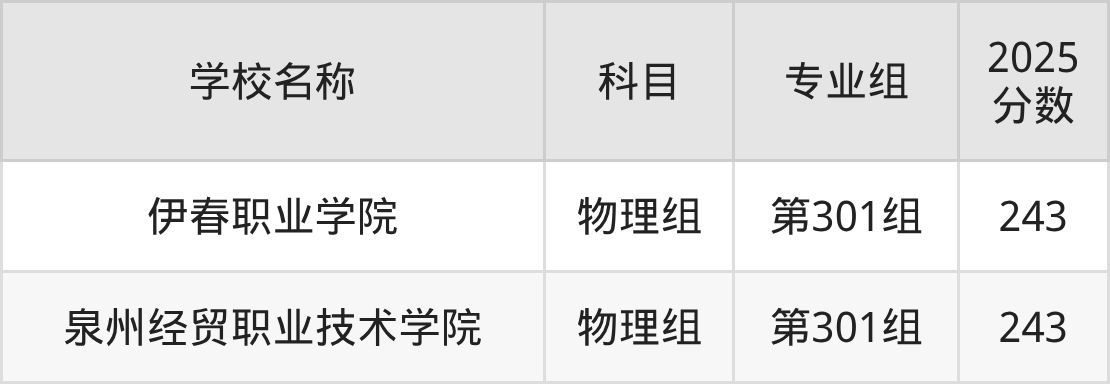 山西高考录取分数线在243分左右的公办院校专业组一共有2个,其中物理组有:伊春职业学院(243分)、泉州经贸职业技术学院(243分)。