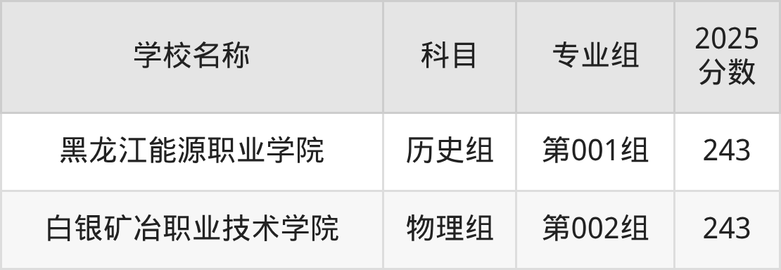 内蒙古高考录取分数线在243分左右的公办院校专业组一共有2个,其中历史组有:黑龙江能源职业学院(243分),物理组有:白银矿冶职业技术学院(243分)。