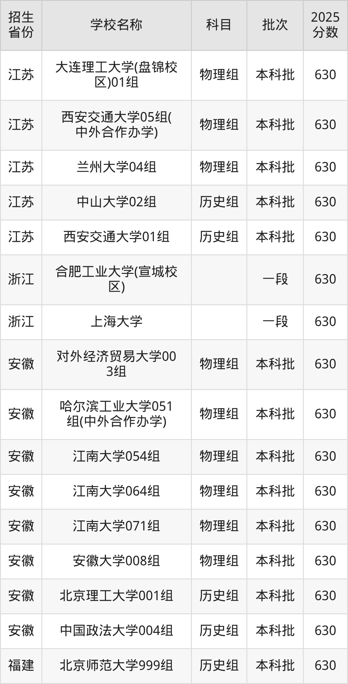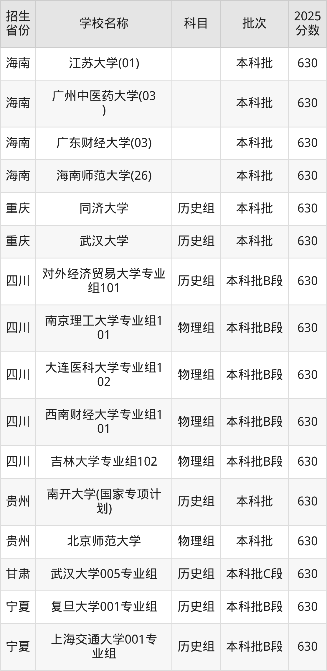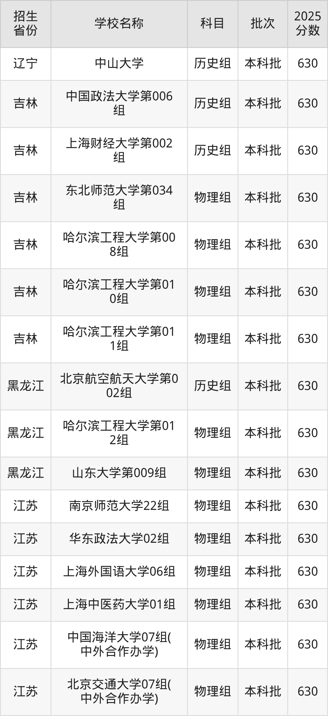 筛选全国各省2025年录取分数线为630分的重点大学如下: