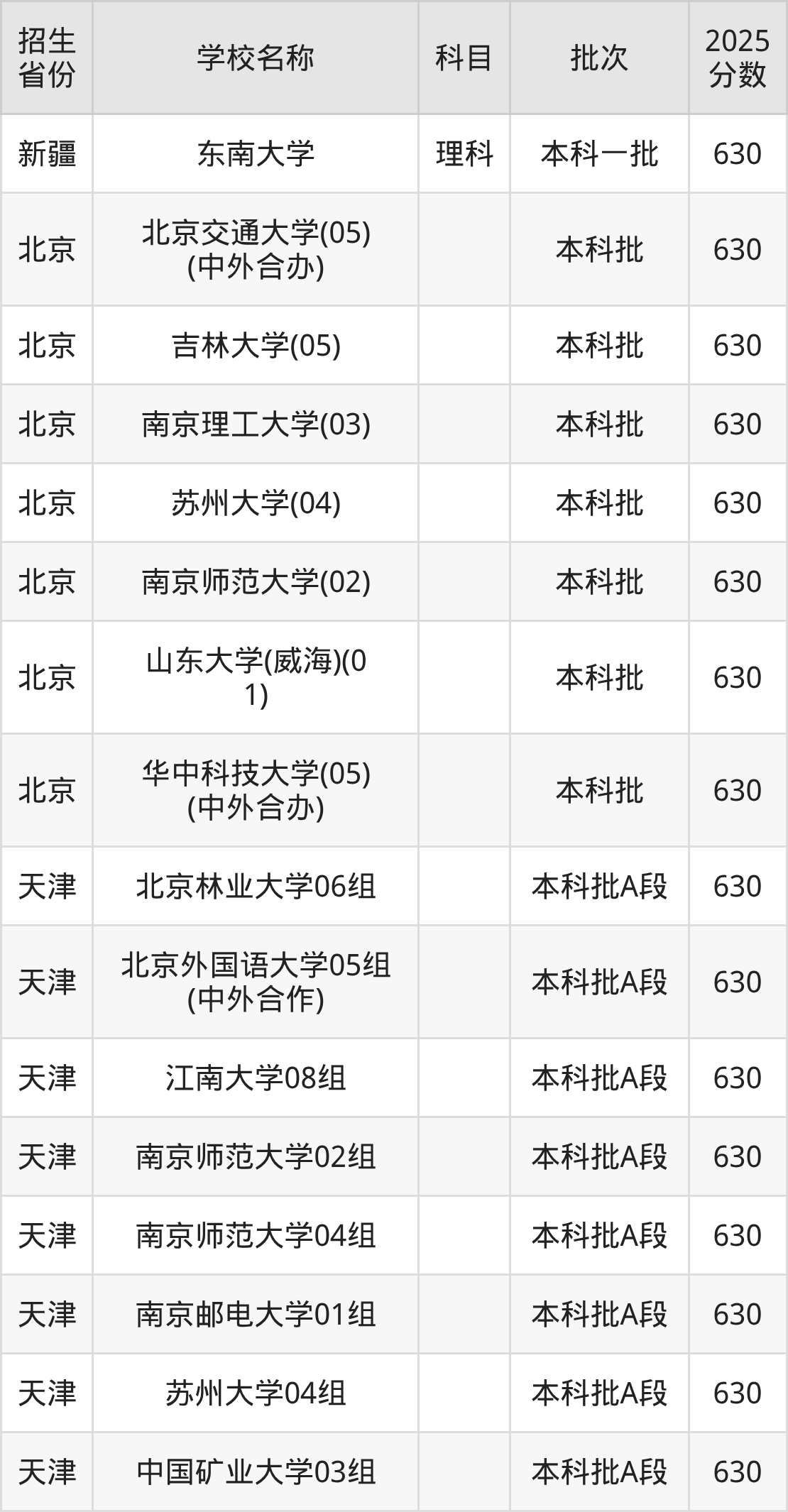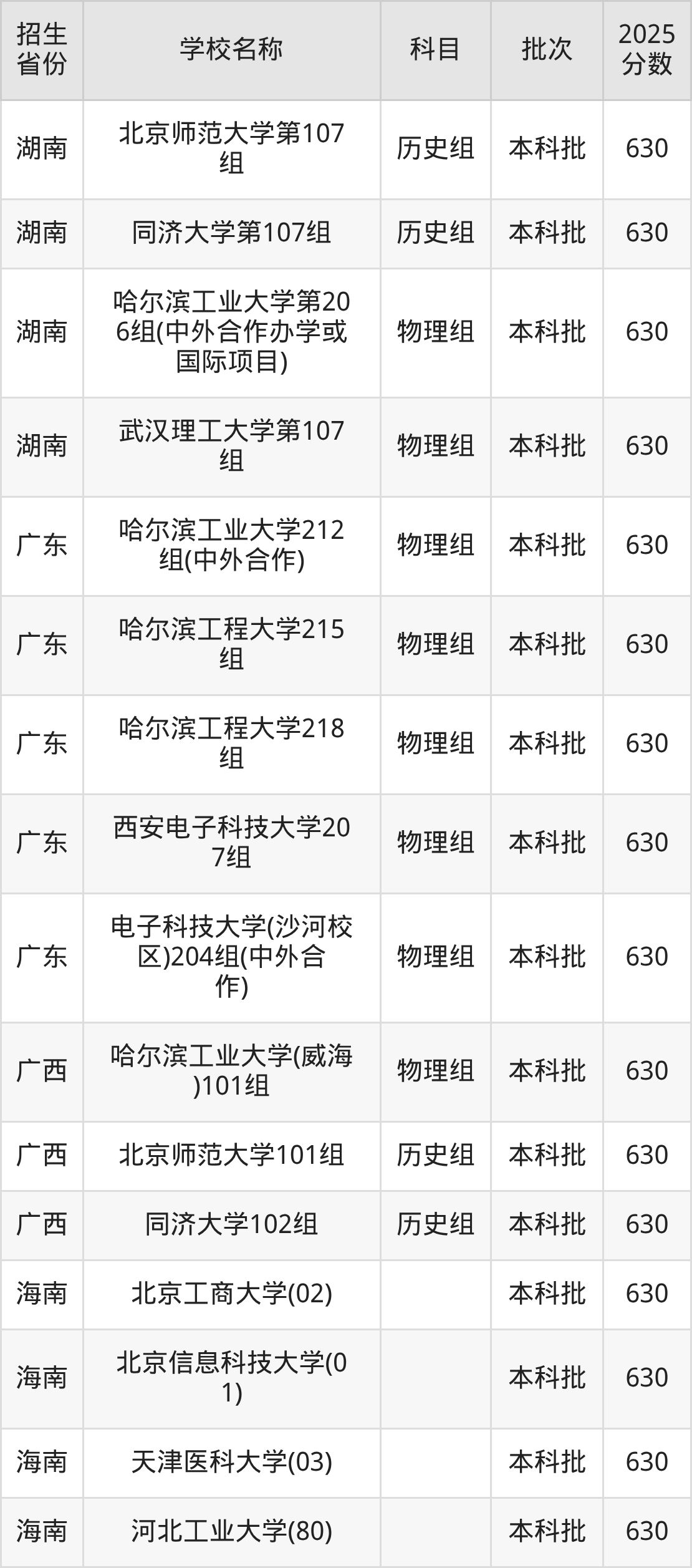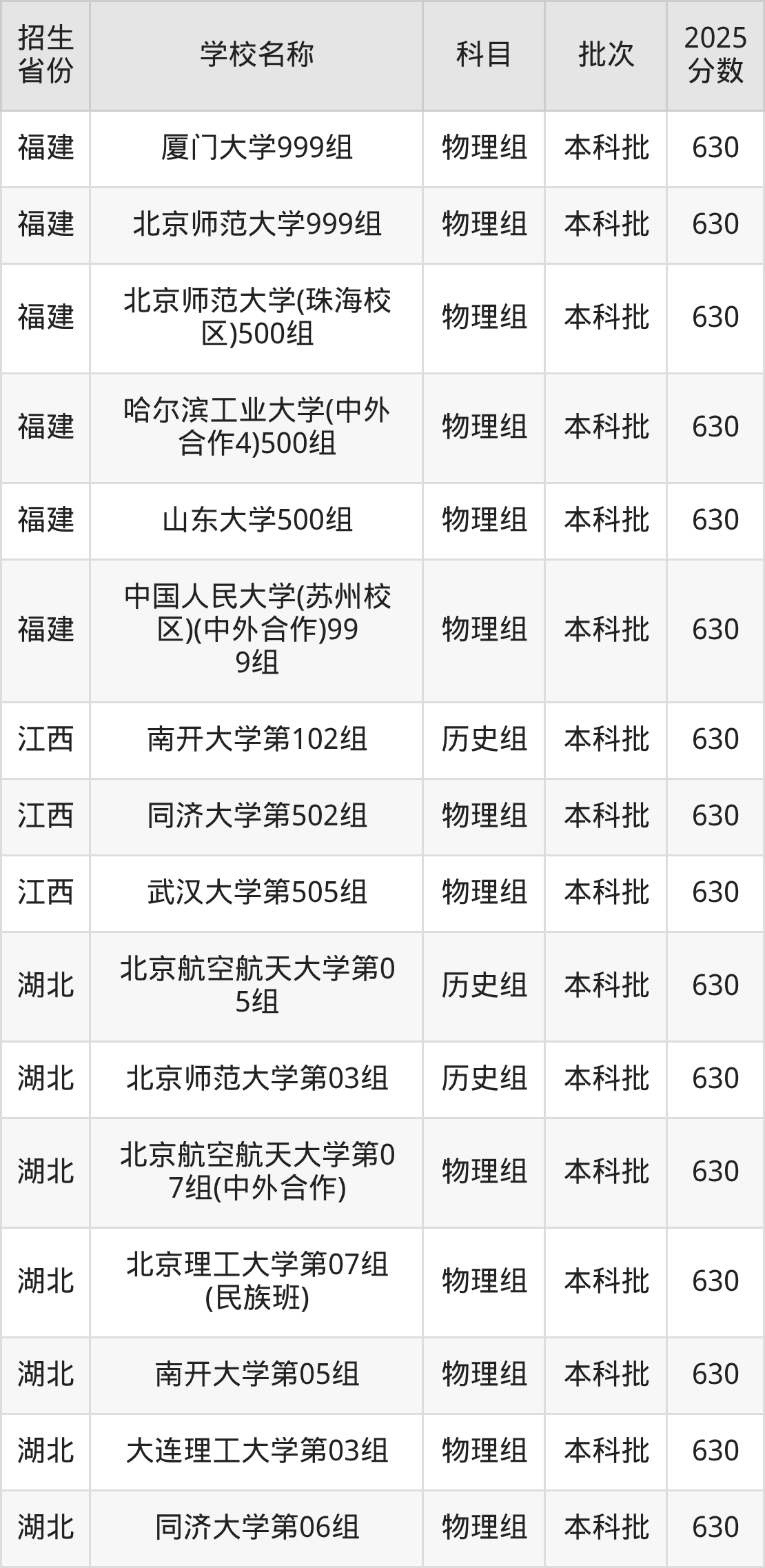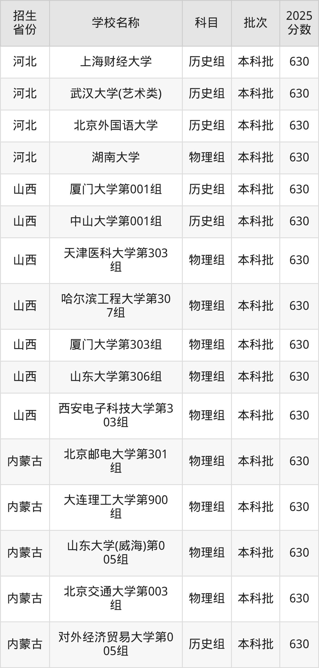 筛选全国各省2025年录取分数线为630分的重点大学如下: