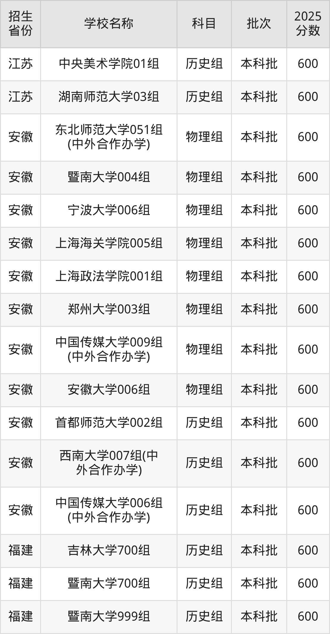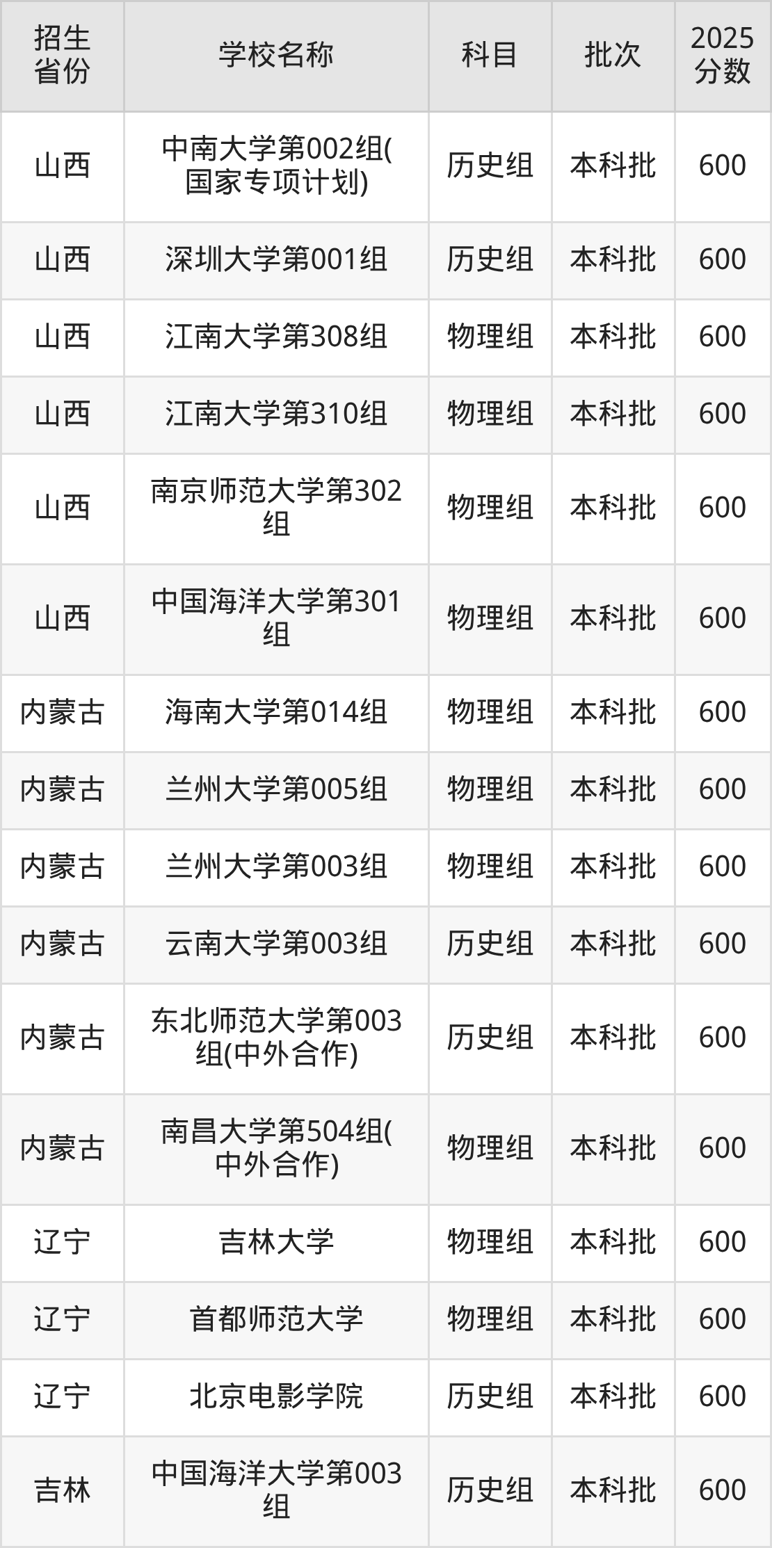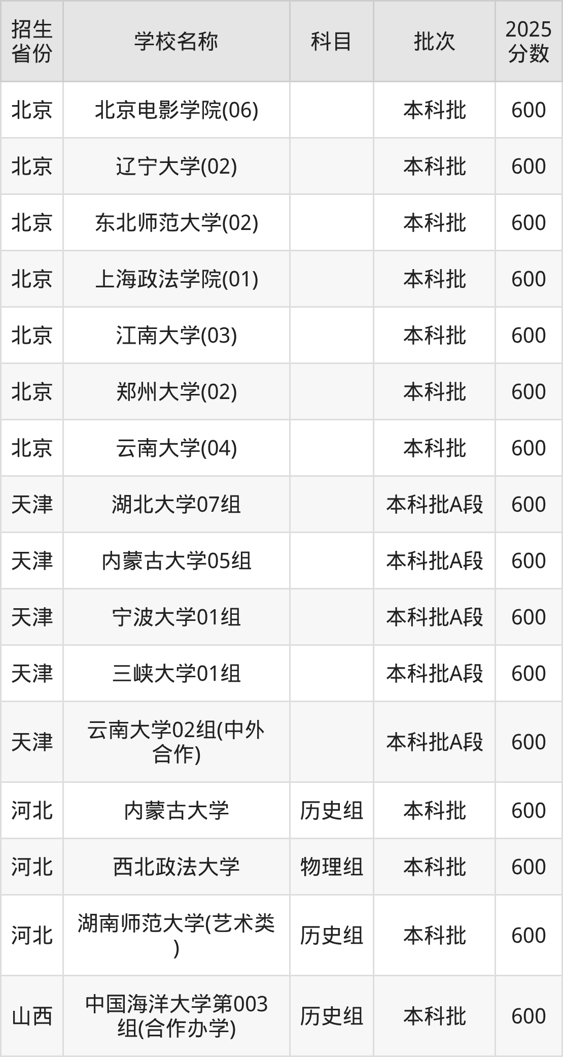 筛选全国各省2025年录取分数线为600分的文科大学如下: