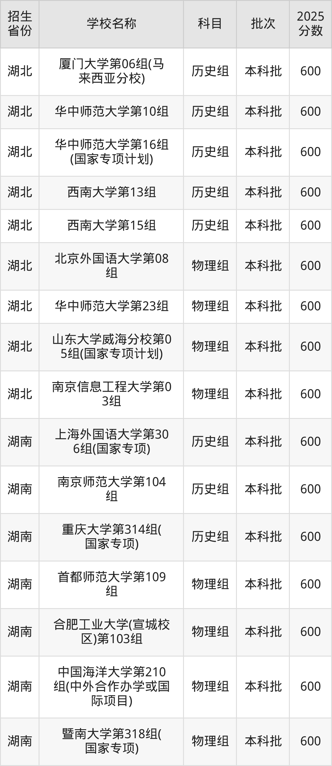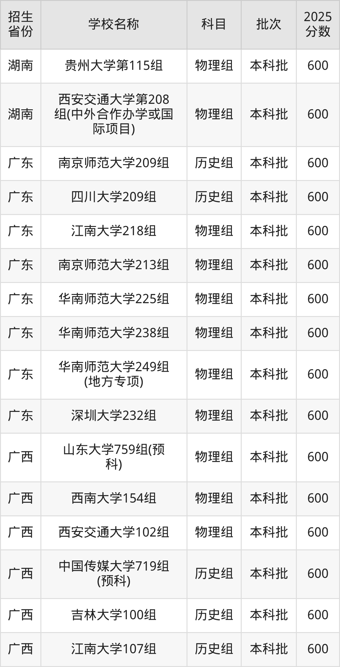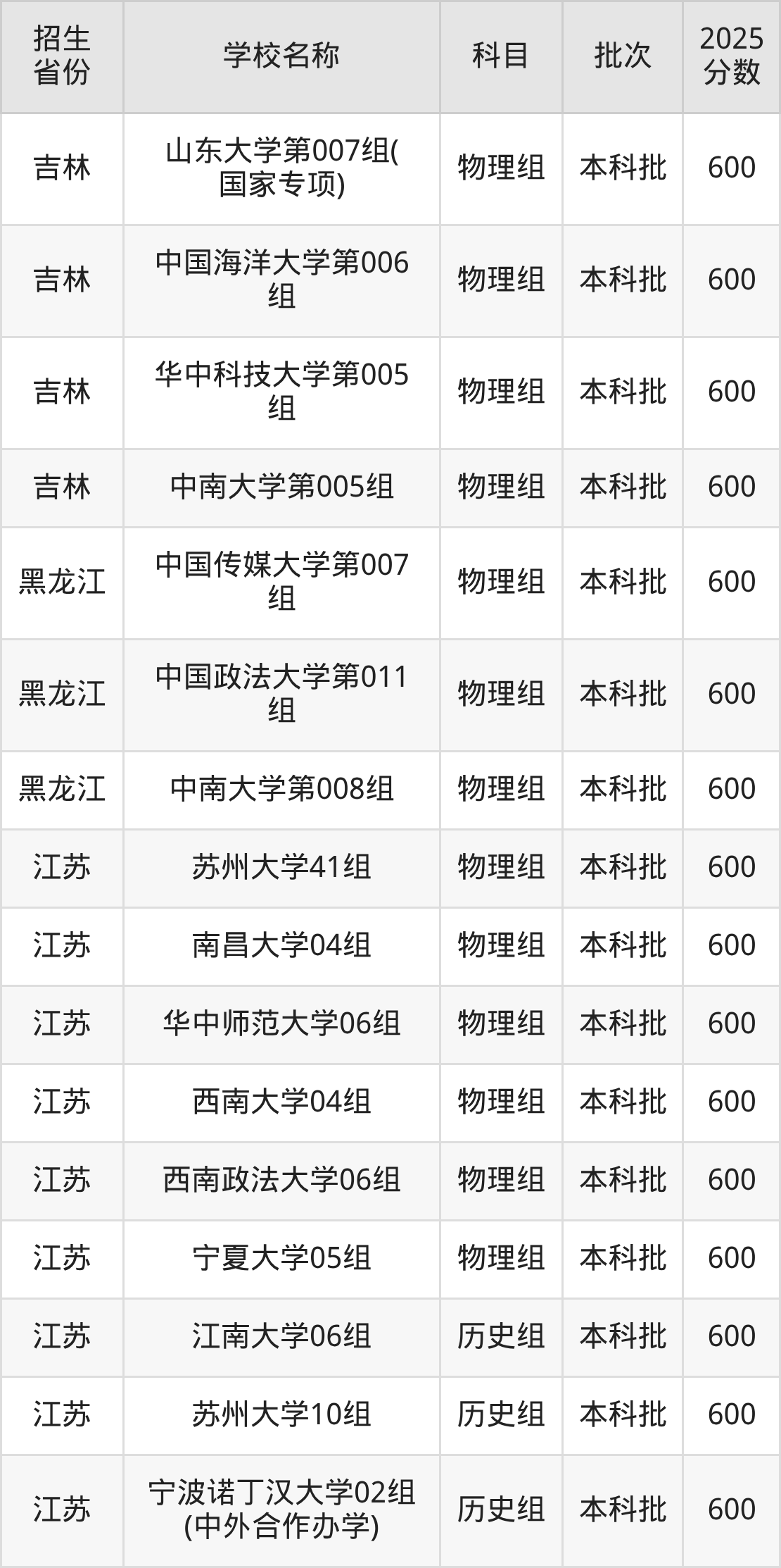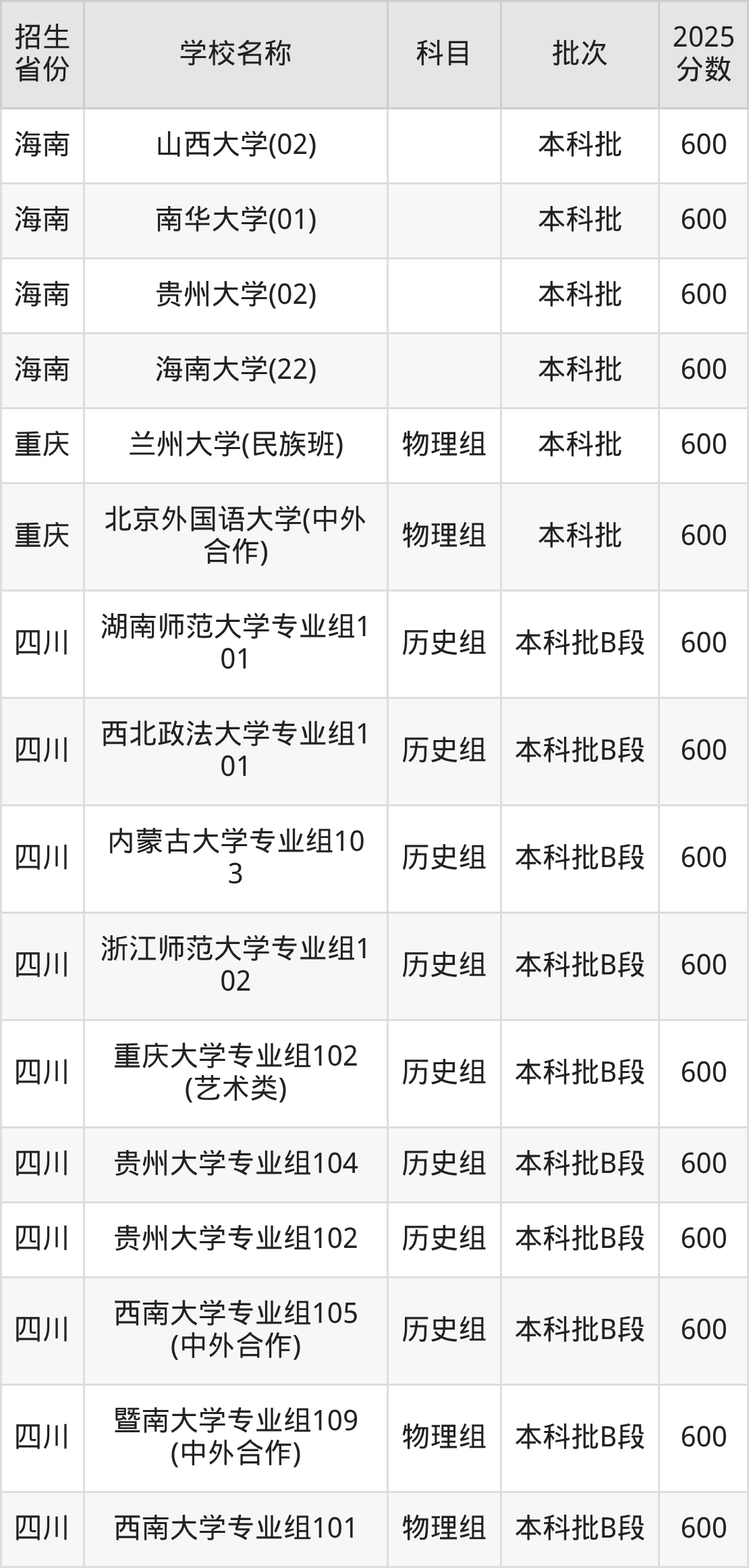 筛选全国各省2025年录取分数线为600分的文科大学如下: