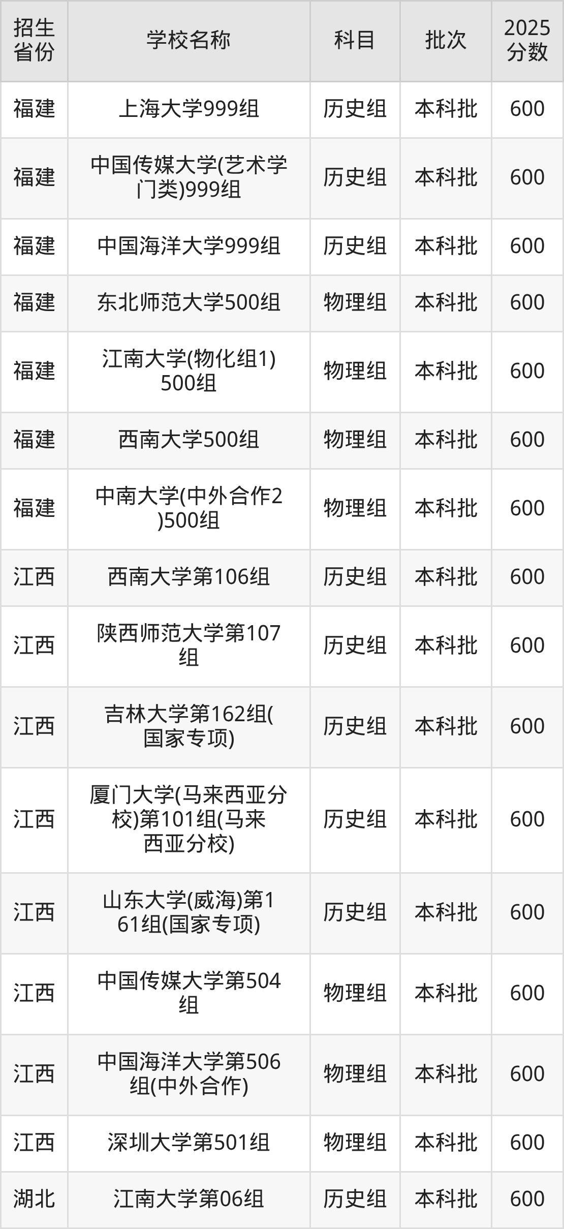 福建省物理组分数线是600分的文科大学有:东北师范大学、江南大学(物化组1)、西南大学、中南大学(中外合作2)。