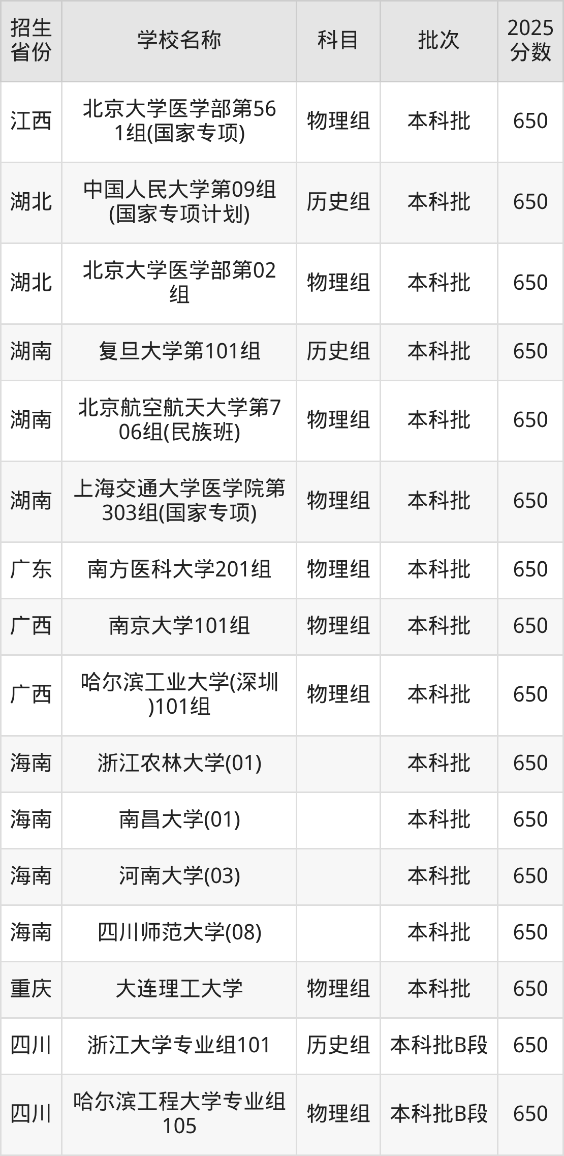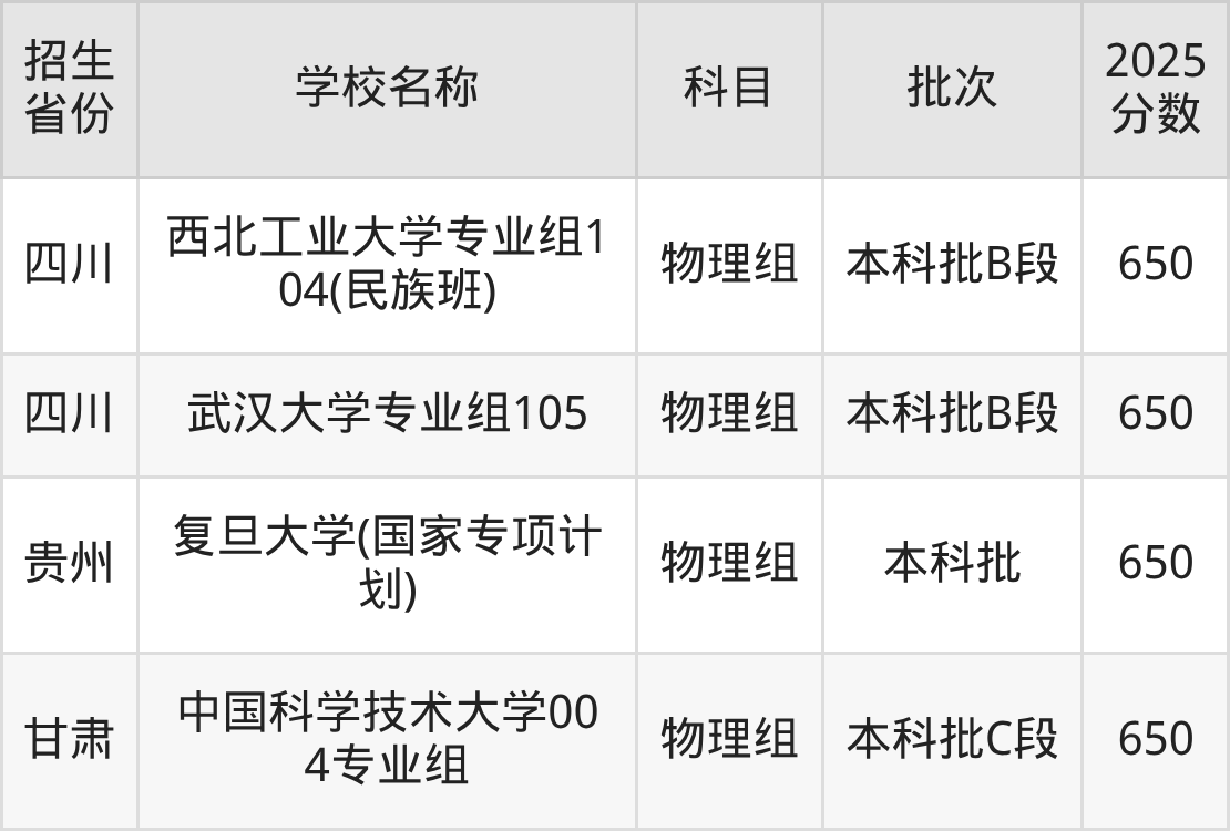 筛选全国各省2025年录取分数线为650分的重点大学如下: