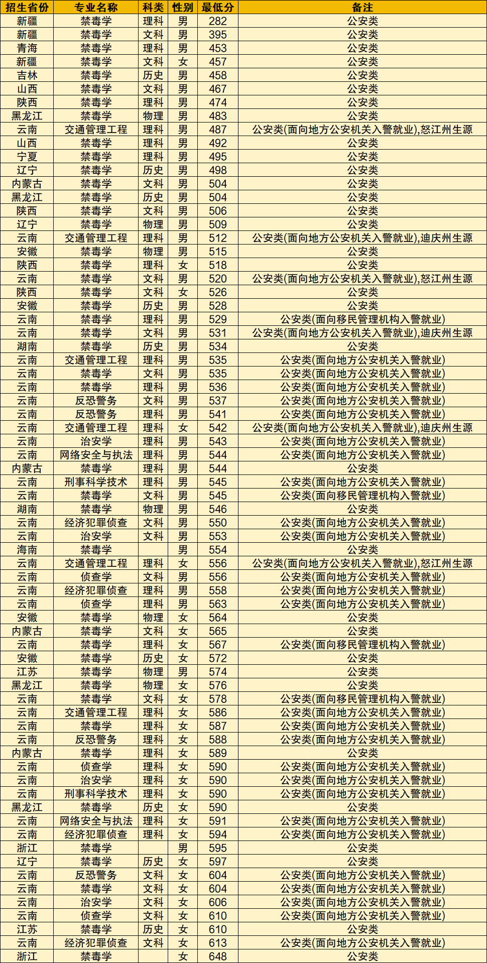下面是其公安类专业2024年在云南本科的录取分数情况: