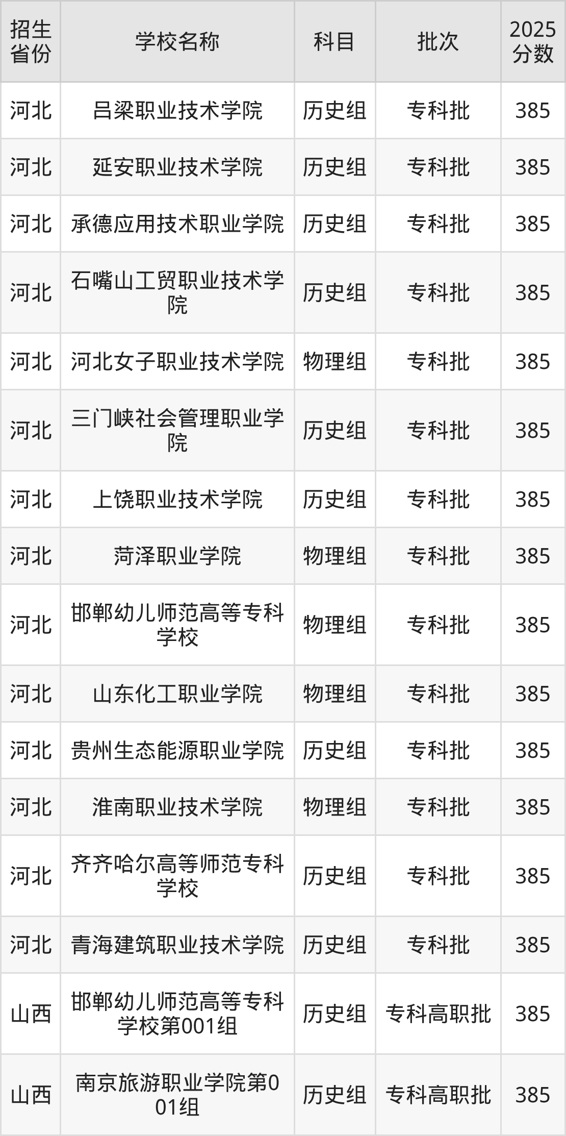 河北省历史组分数线是385分的公办专科大学有:吕梁职业技术学院、延安职业技术学院、承德应用技术职业学院、石嘴山工贸职业技术学院、三门峡社会管理职业学院、上饶职业技术学院、贵州生态能源职业学院、齐齐哈尔高等师范专科学校、青海建筑职业技术学院。