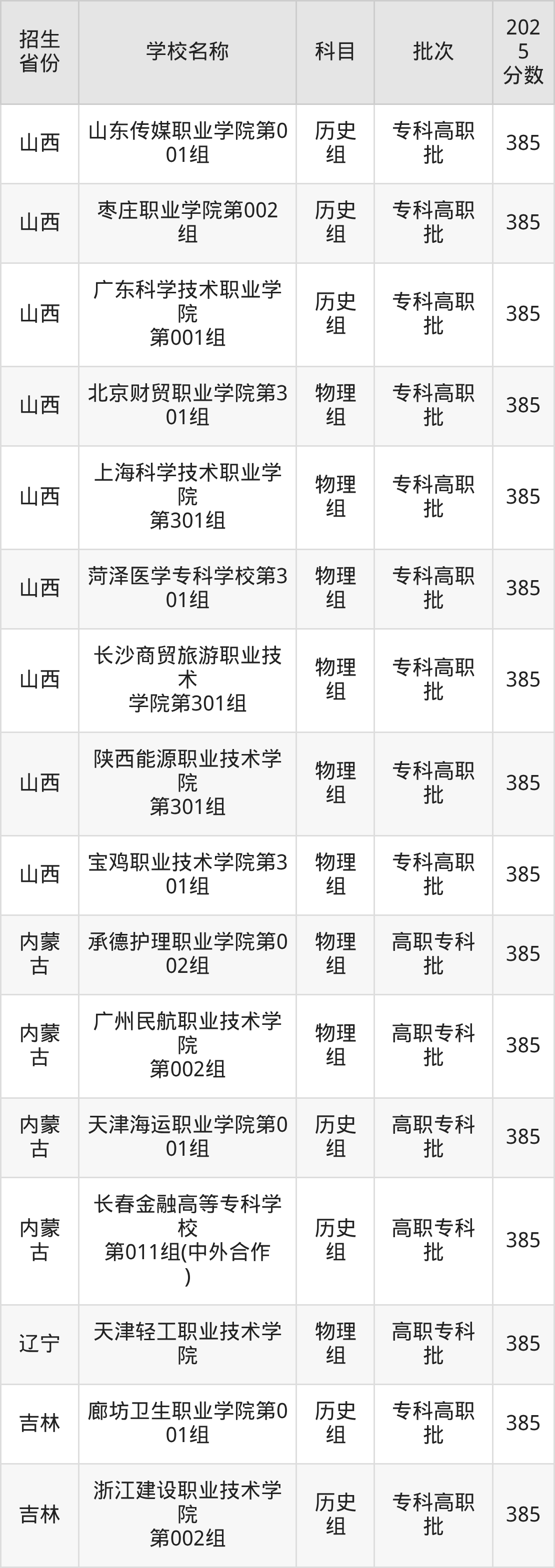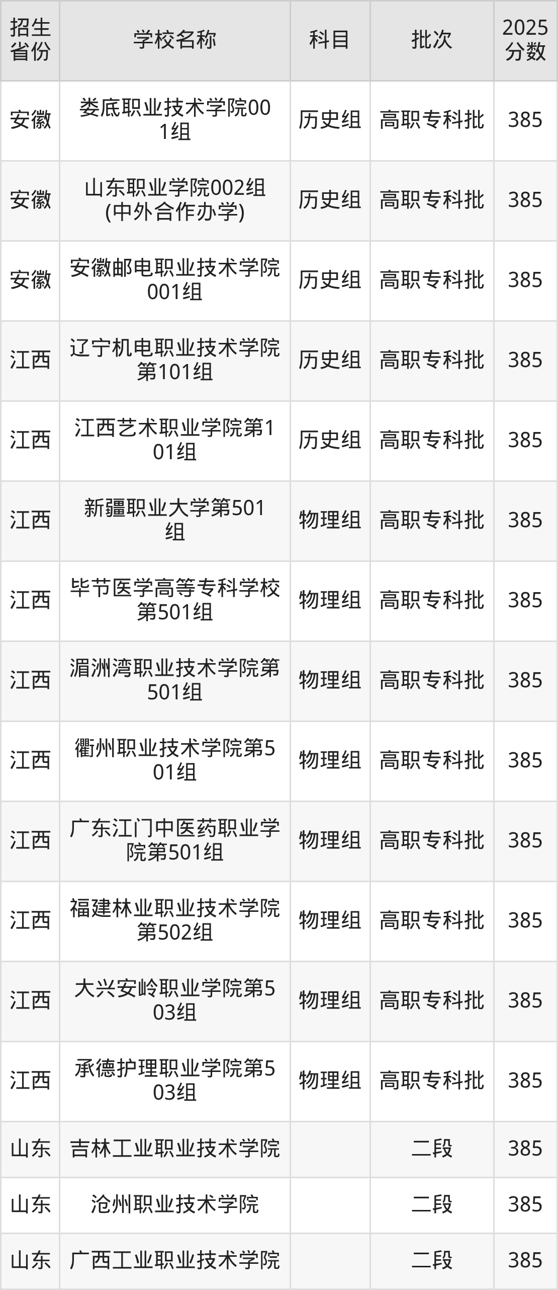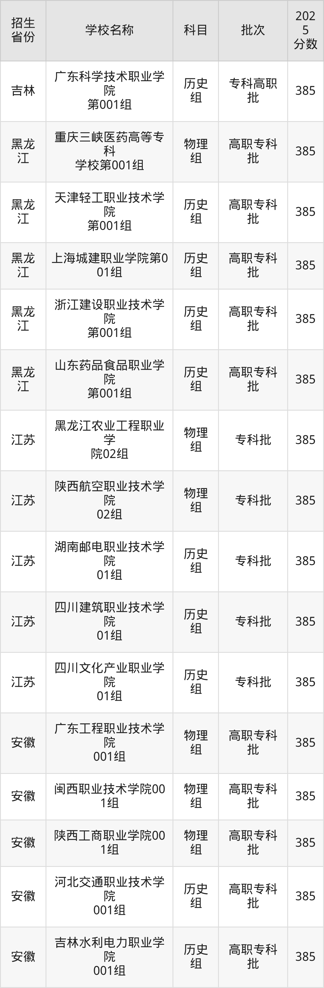 二、各省385分的公办专科大学名单