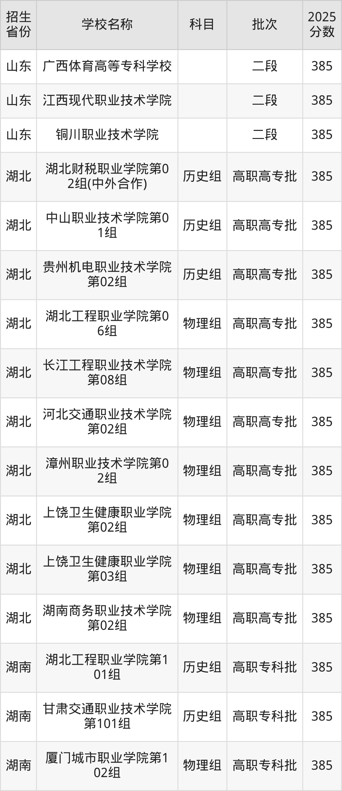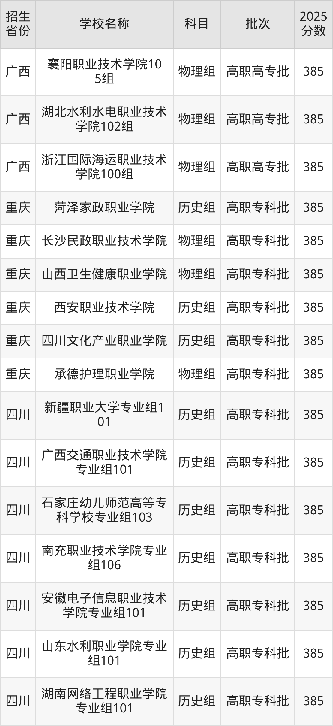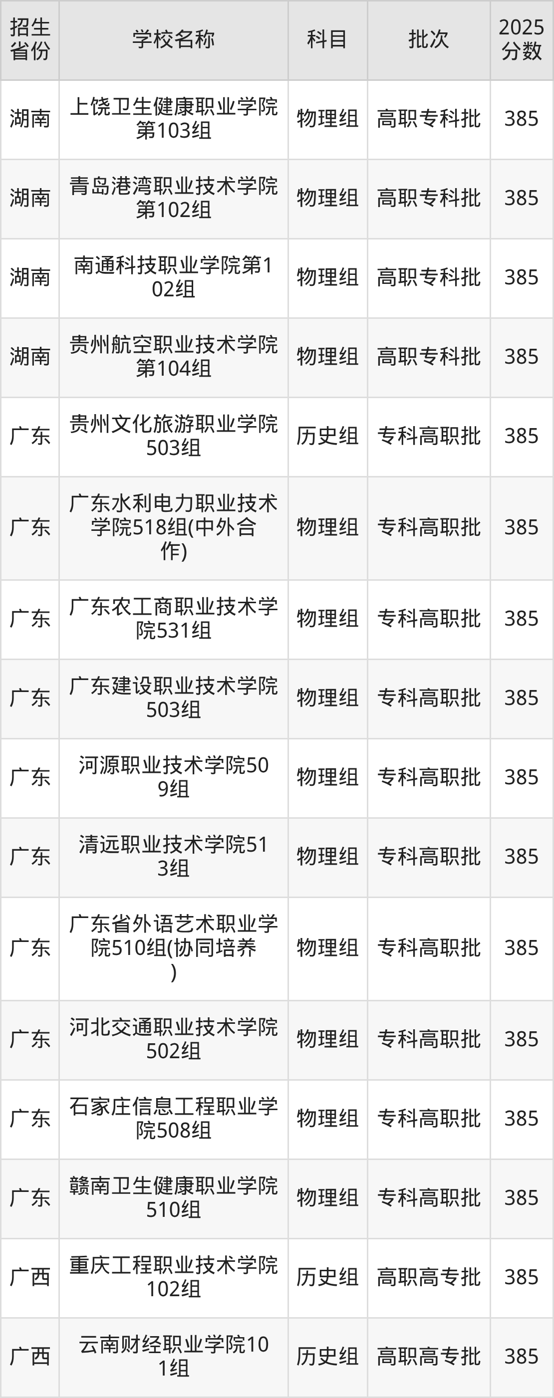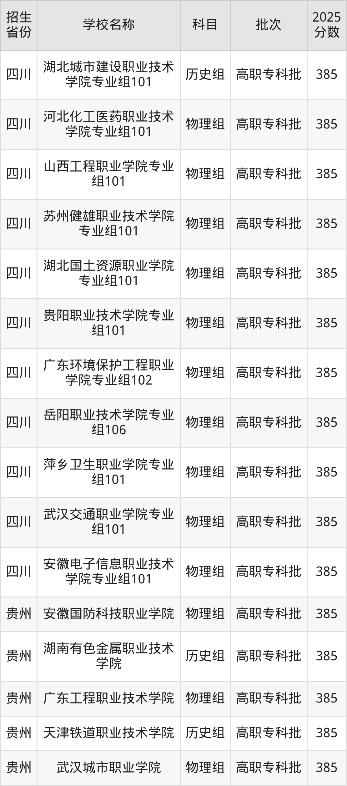 二、各省385分的公办专科大学名单