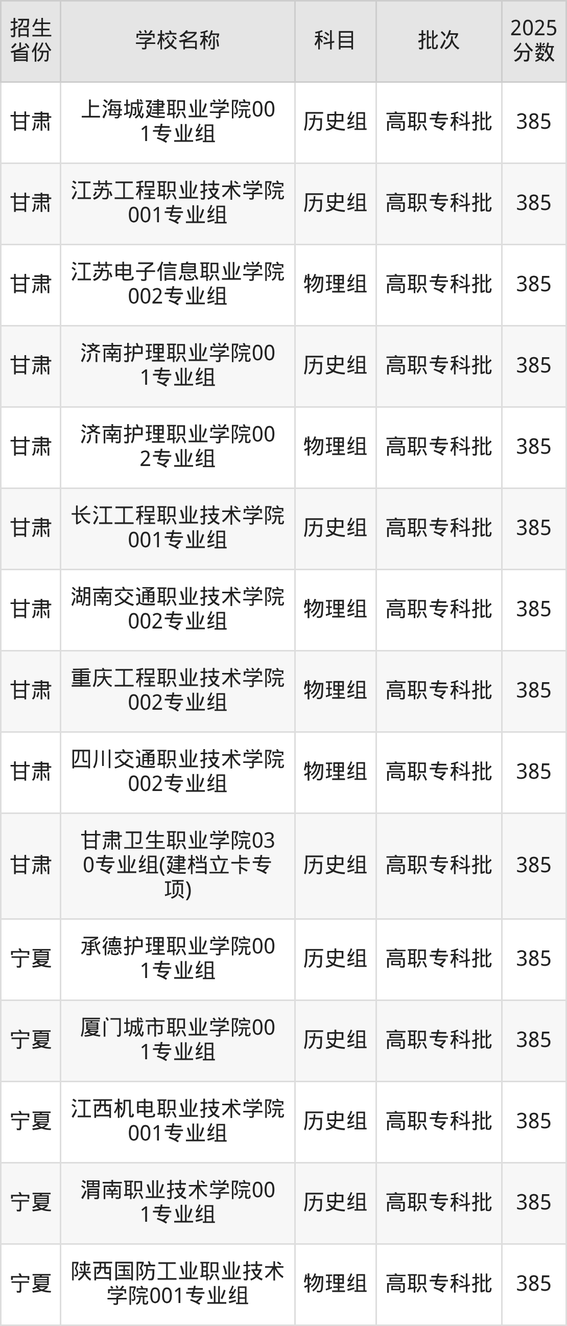 甘肃省历史组分数线是385分的公办专科大学有:上海城建职业学院、江苏工程职业技术学院、济南护理职业学院、长江工程职业技术学院、甘肃卫生职业学院。