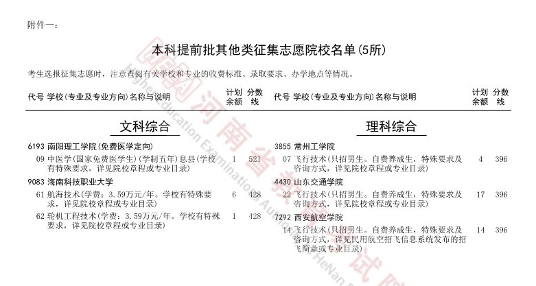 本科提前批征集志愿的院校有滨州学院(招飞)、南阳理工学院(医学定向)、西安航空学院(招飞)、中央司法警官学院、武警特种警察学院、郑州师范学院、洛阳师范学院、南阳师范学院、河南师范大学(后四所都属于地方公费师范生)。