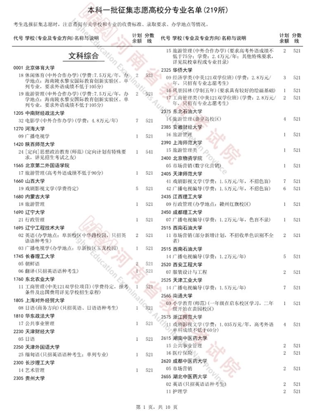 本科一批进行征集志愿的院校有北京体育大学、东北财经大学、东北石油大学、黑龙江大学、新乡医学院、西南交通大学、石家庄铁道大学、沈阳农业大学、湘潭大学、西安建筑科技大学。
