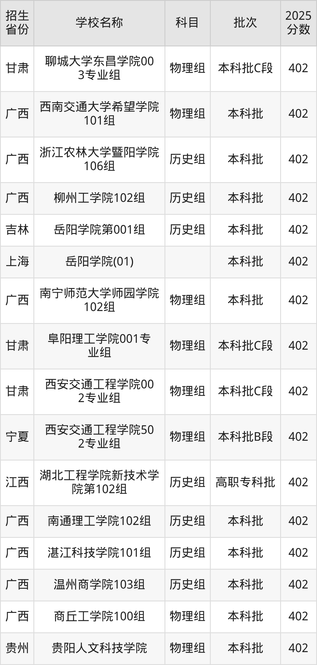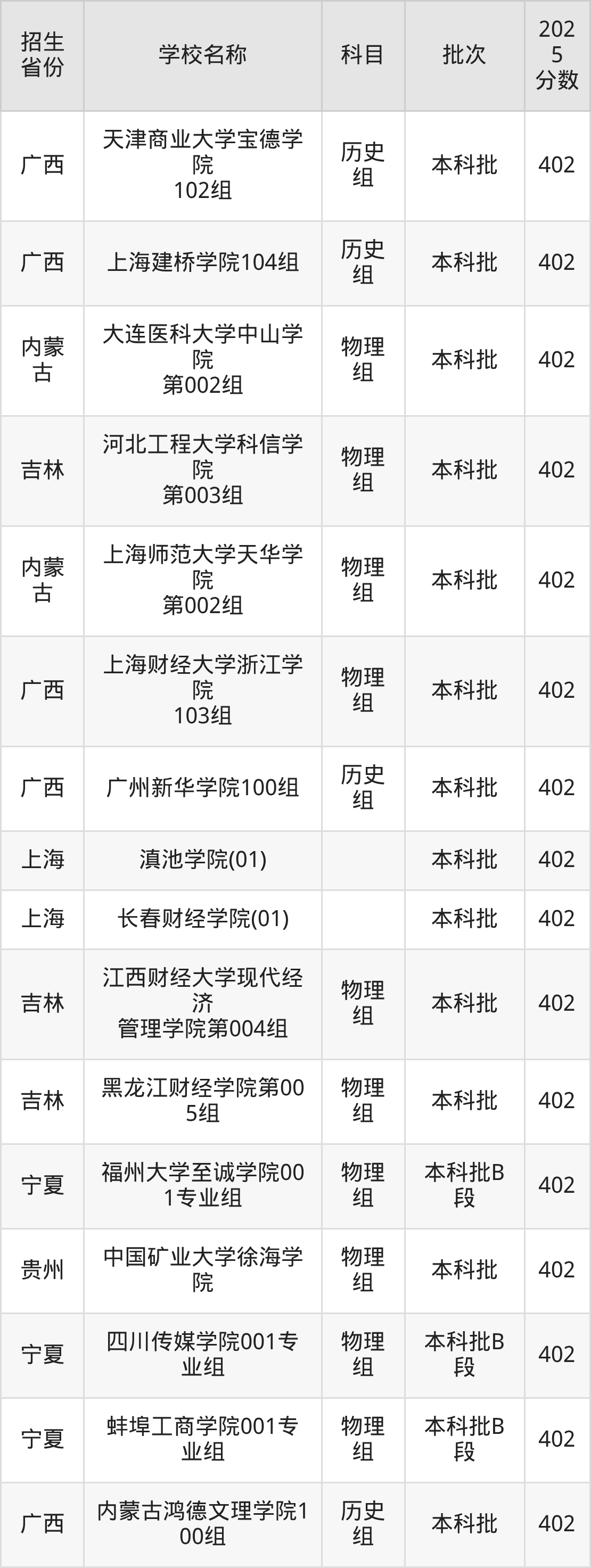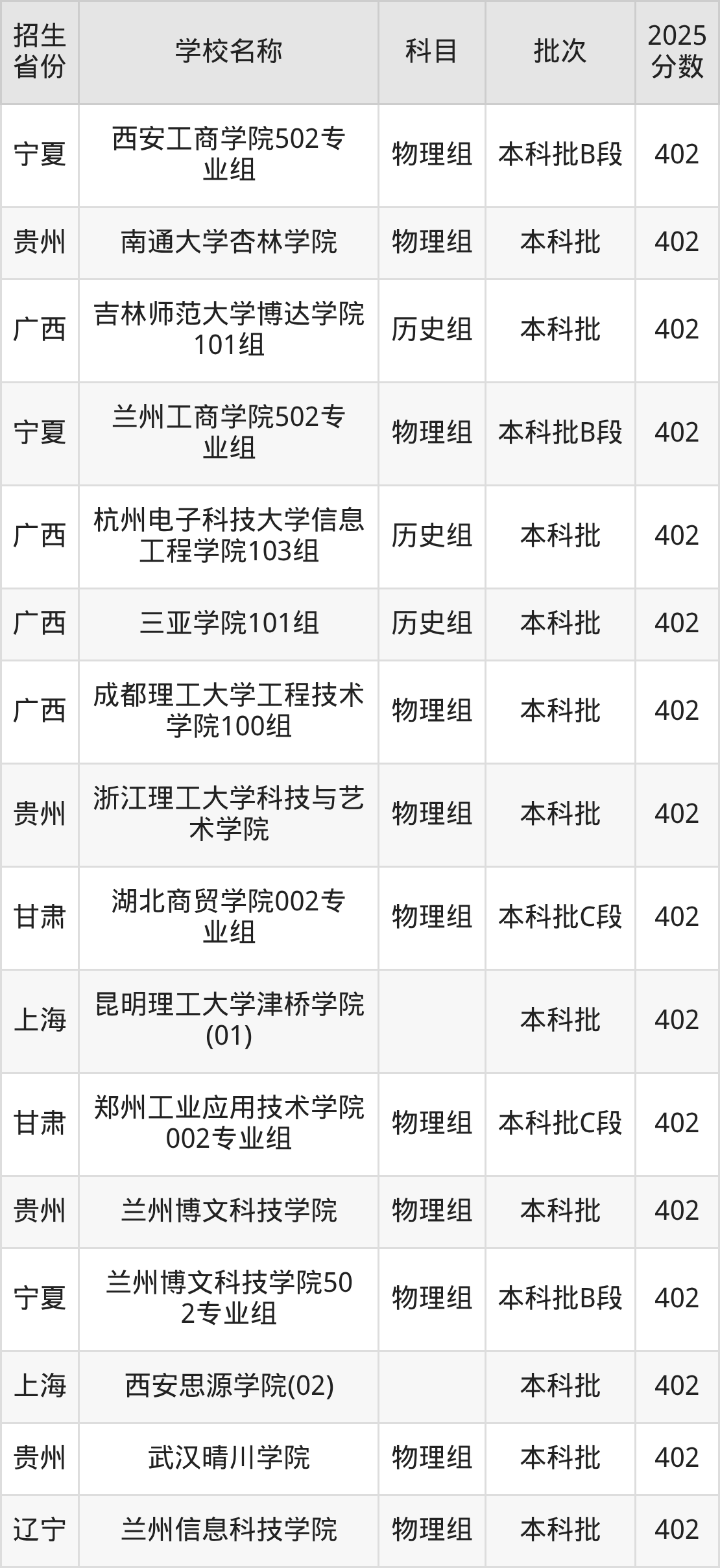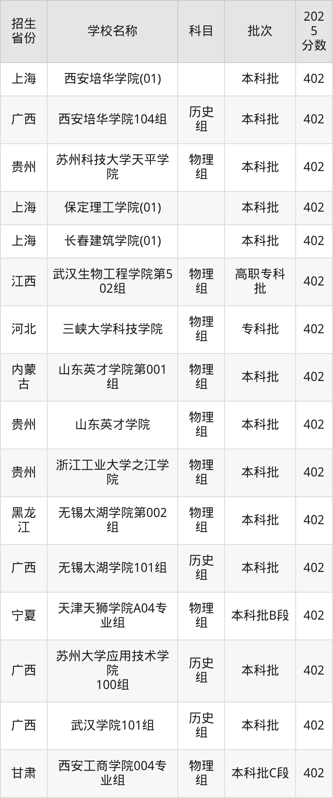 筛选全国各省2025年录取分数线为402分的二本民办大学如下: