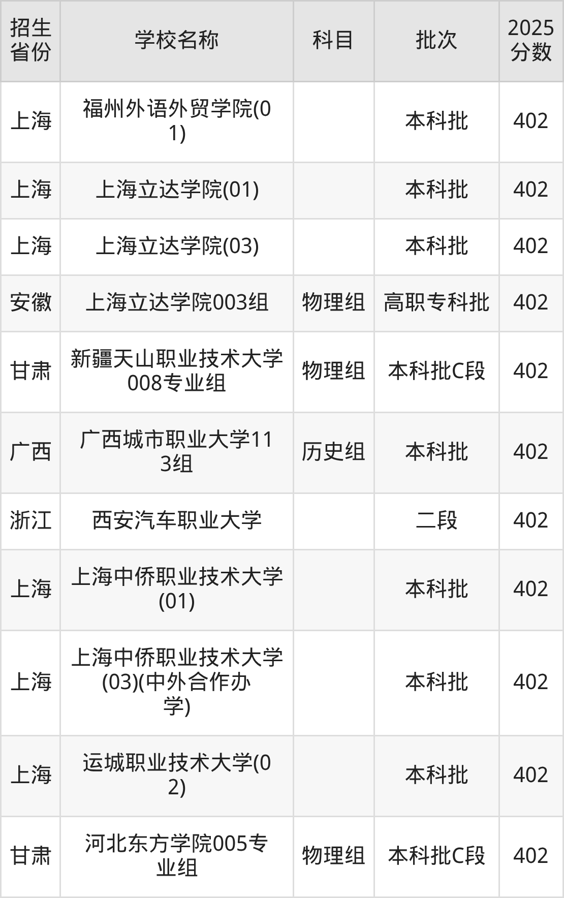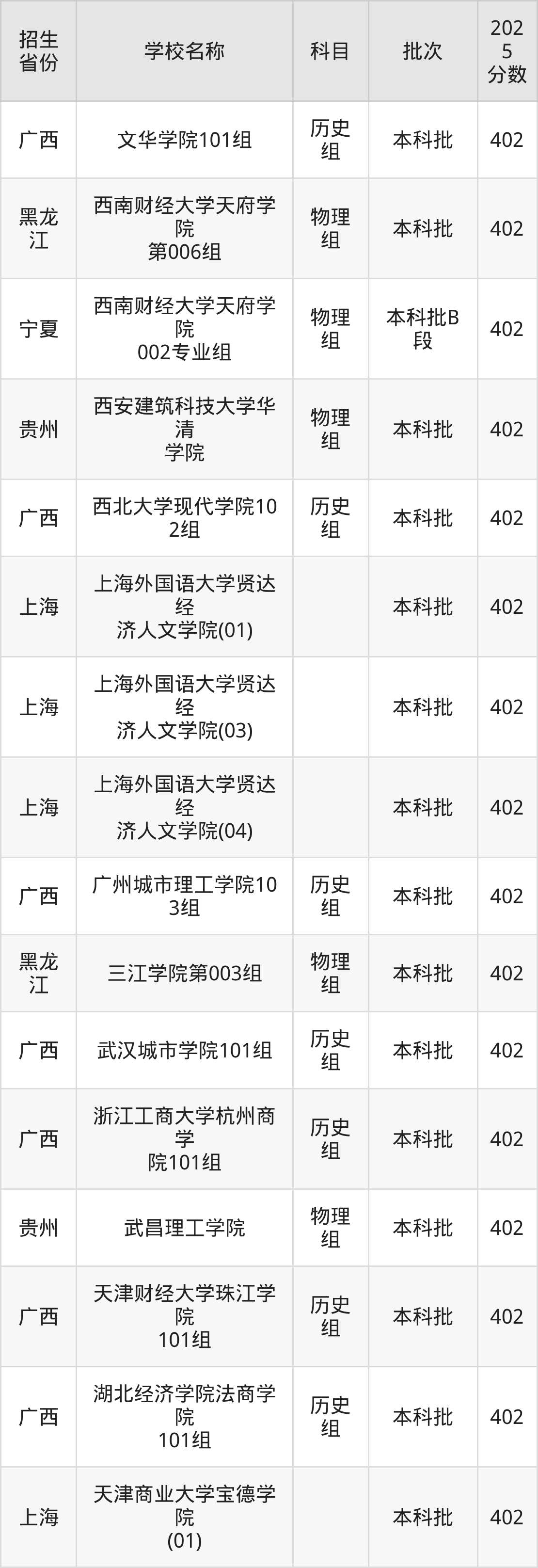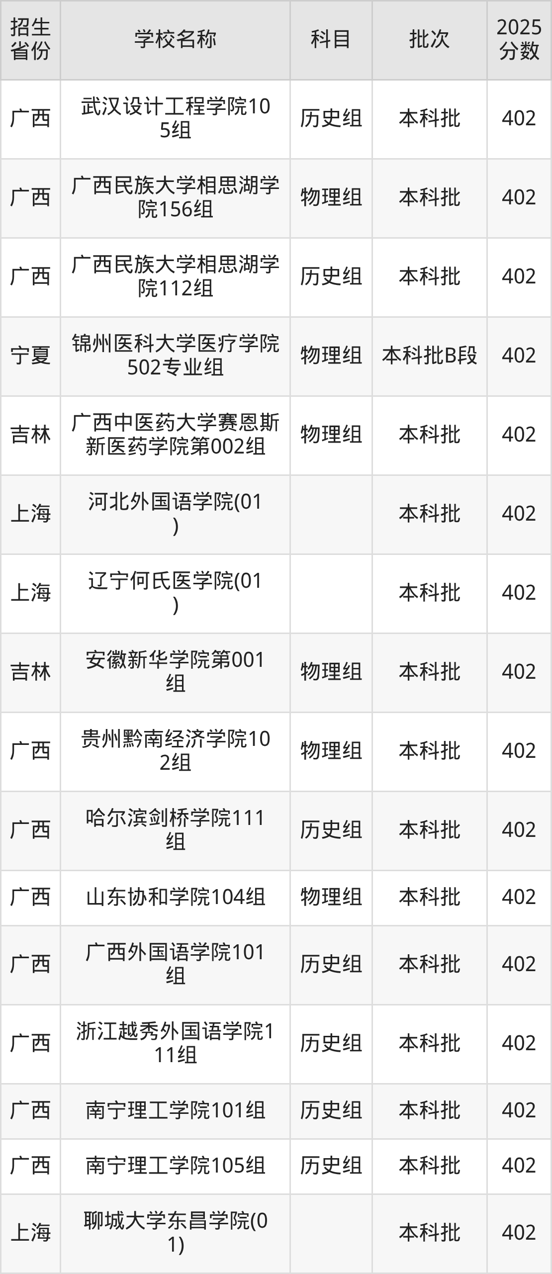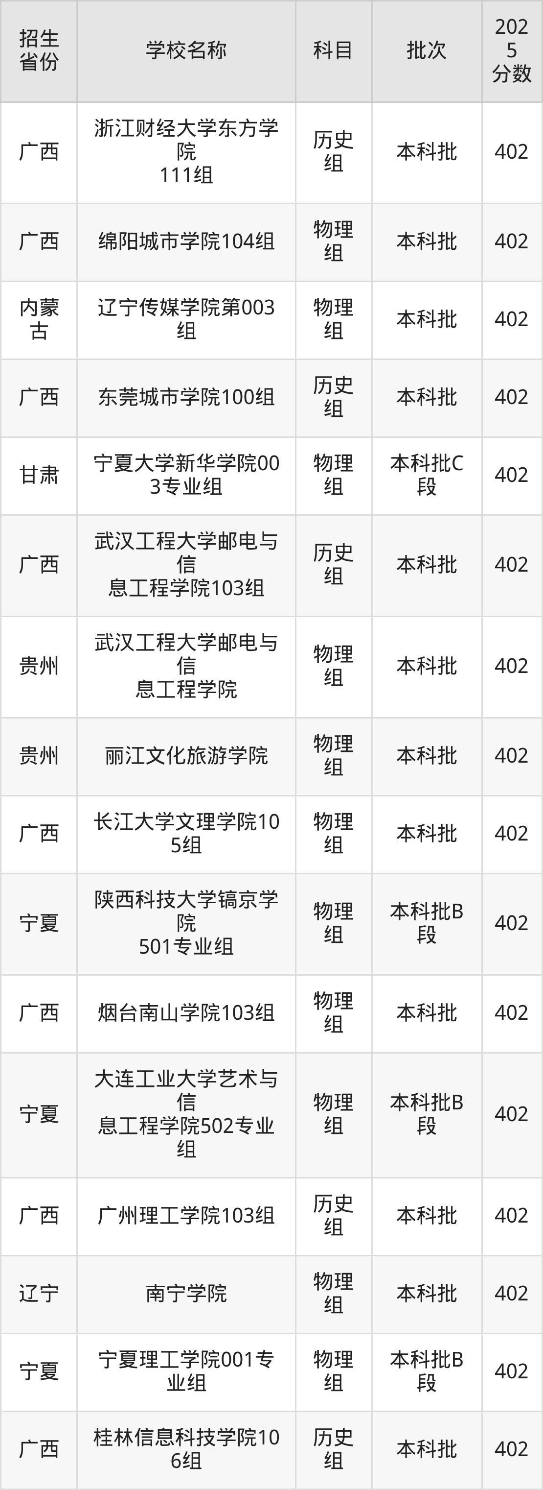 筛选全国各省2025年录取分数线为402分的二本民办大学如下: