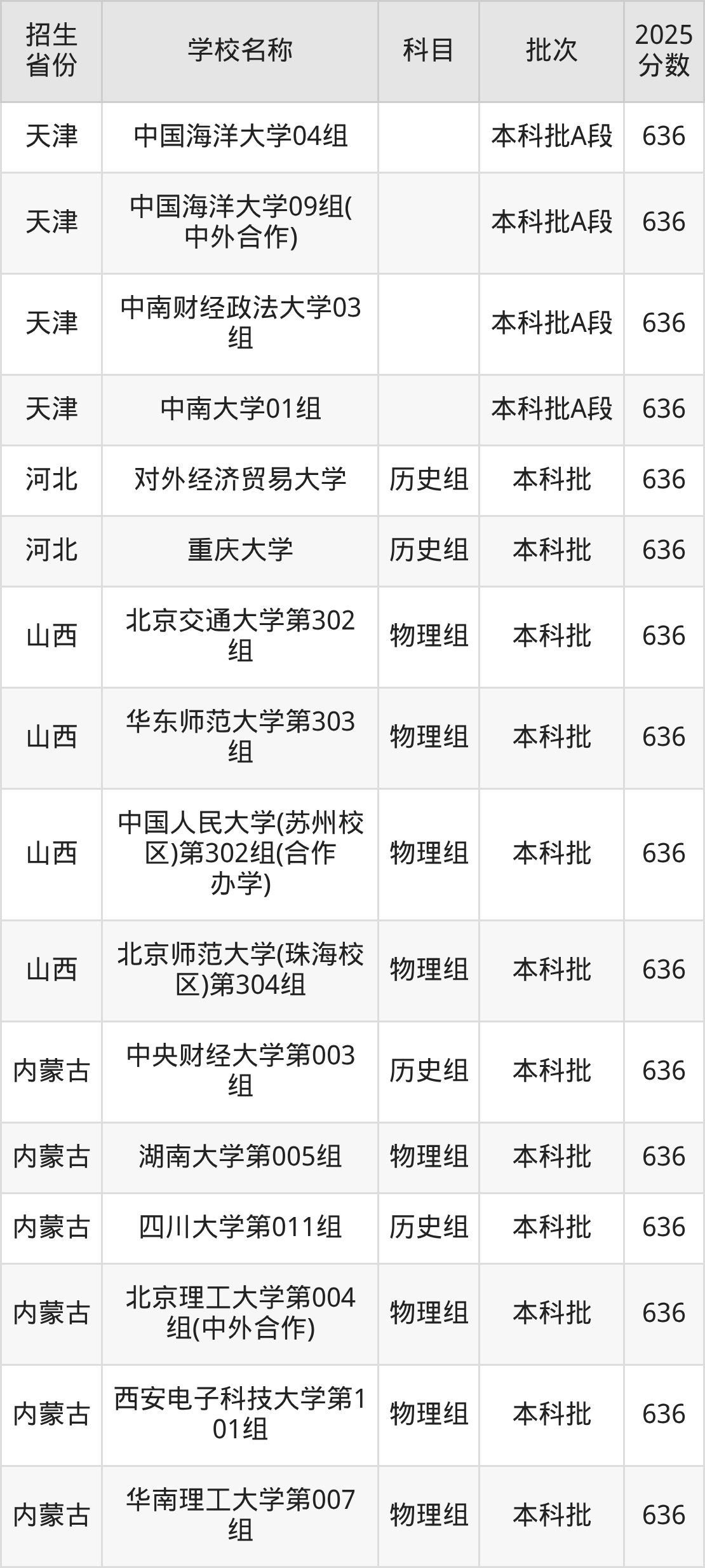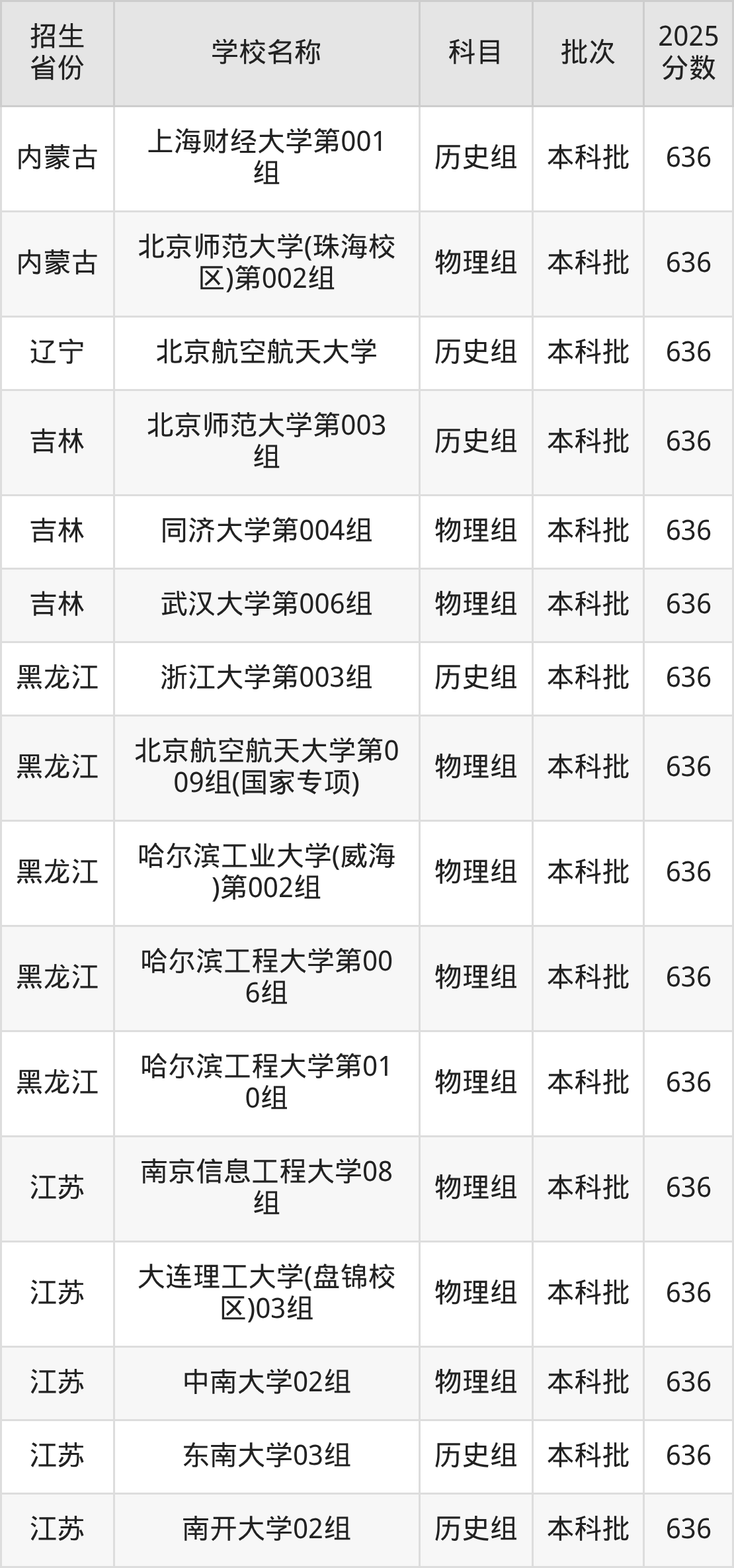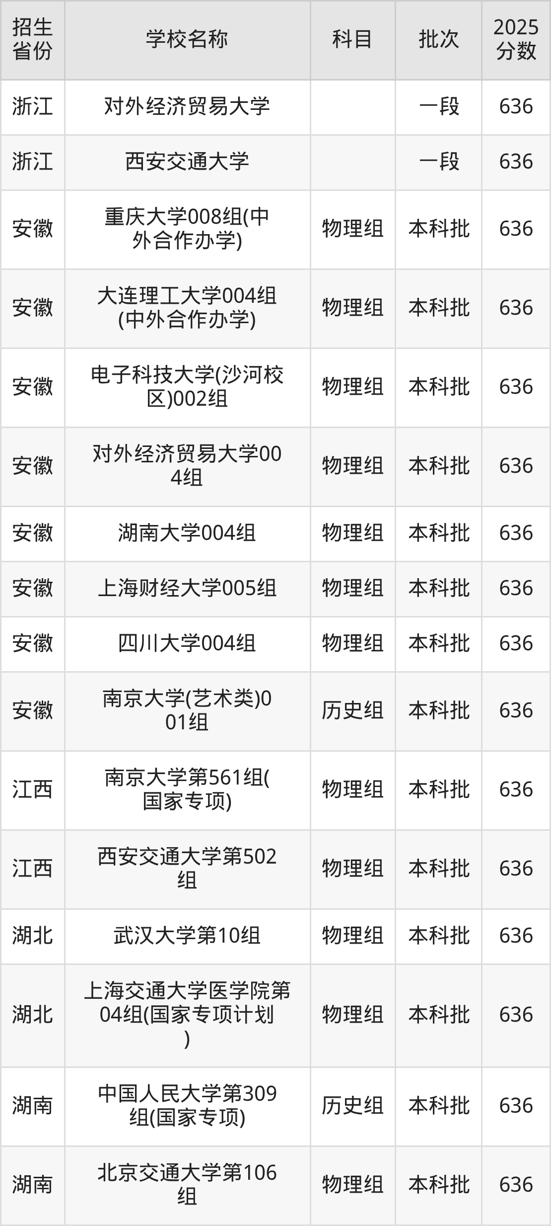 筛选全国各省2025年录取分数线为636分的一本大学如下: