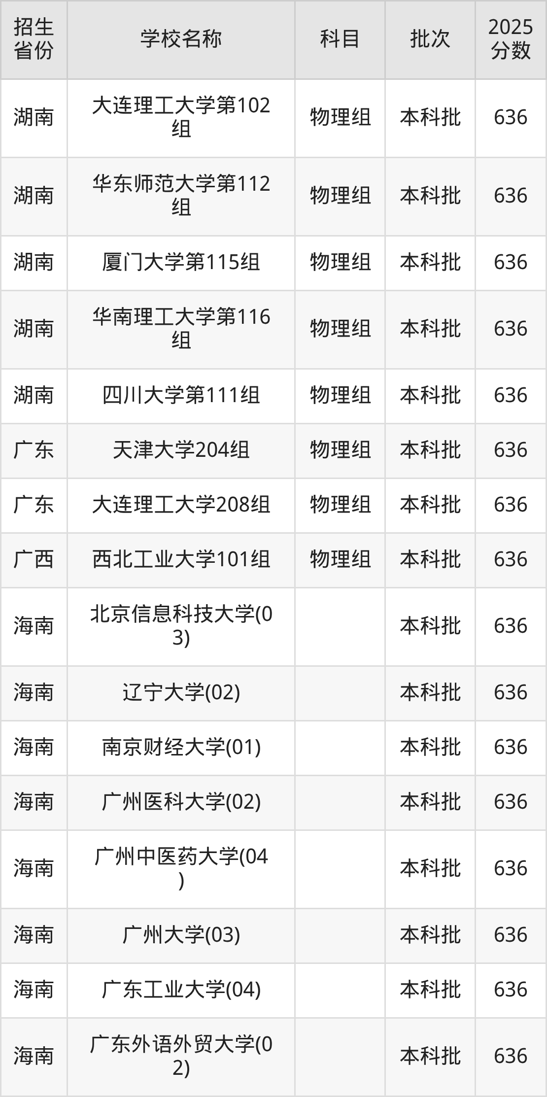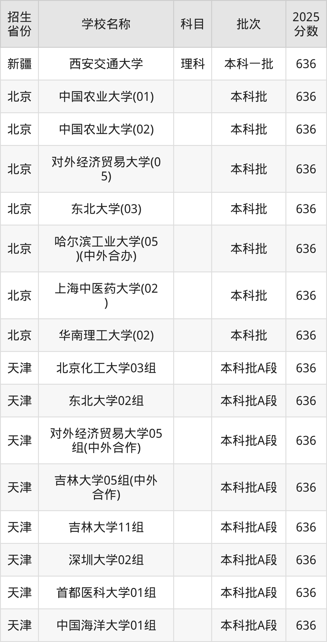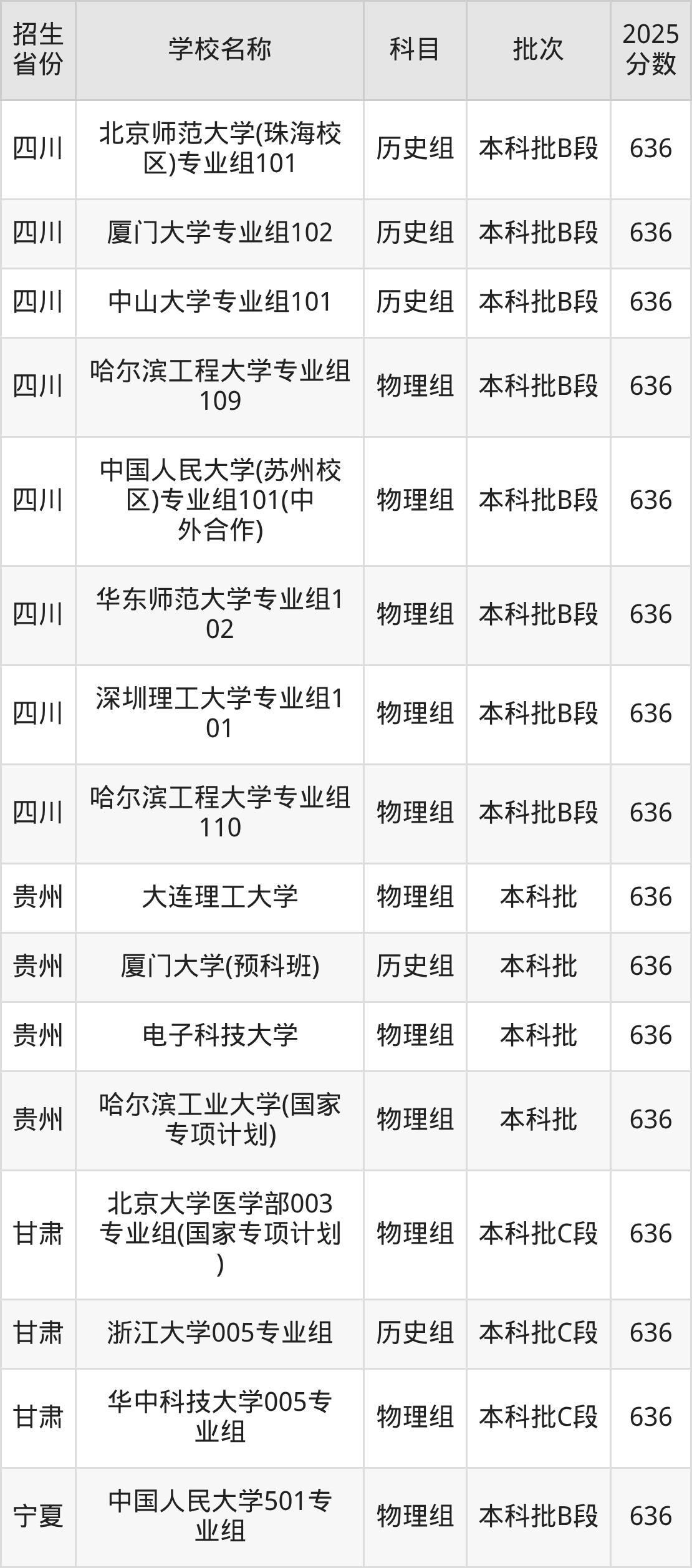 筛选全国各省2025年录取分数线为636分的一本大学如下: