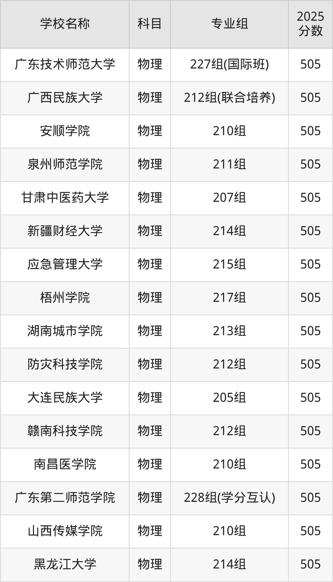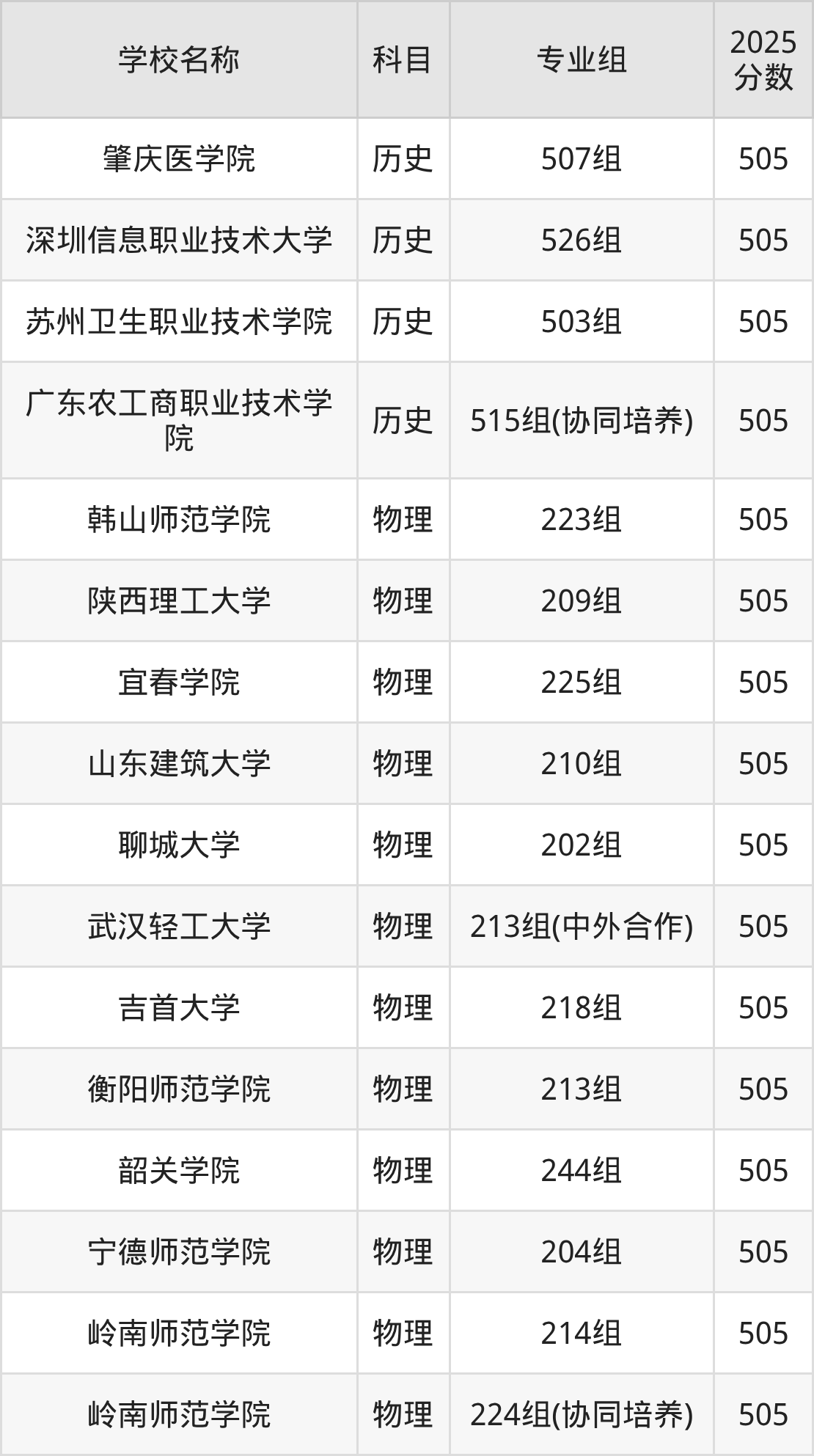 广东高考录取分数线在505分左右的公办院校专业组一共有35个,其中历史组有:肇庆医学院(505分)、深圳信息职业技术大学(505分)、苏州卫生职业技术学院(505分),物理组有:韩山师范学院(505分)、陕西理工大学(505分)、宜春学院(505分)。