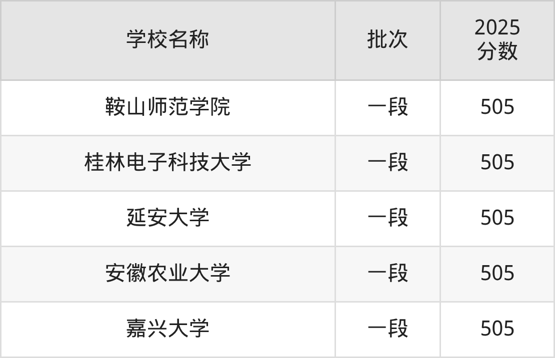 山东高考录取分数线在505分左右的公办大学一共有5所。分别是鞍山师范学院(505分)、桂林电子科技大学(505分)、延安大学(505分)