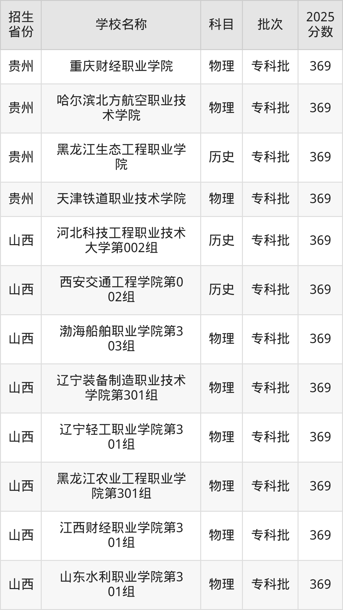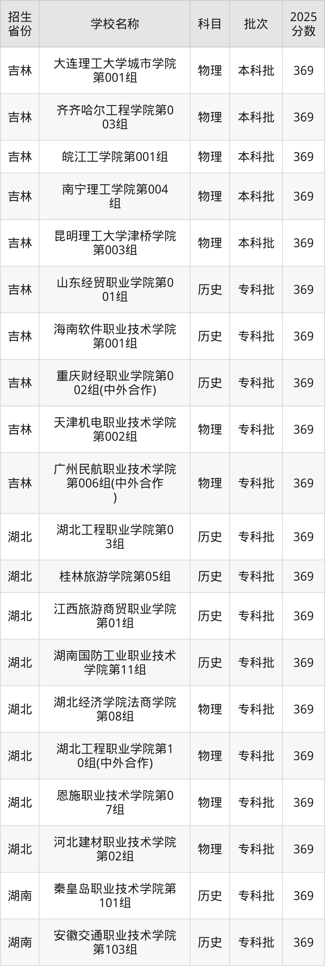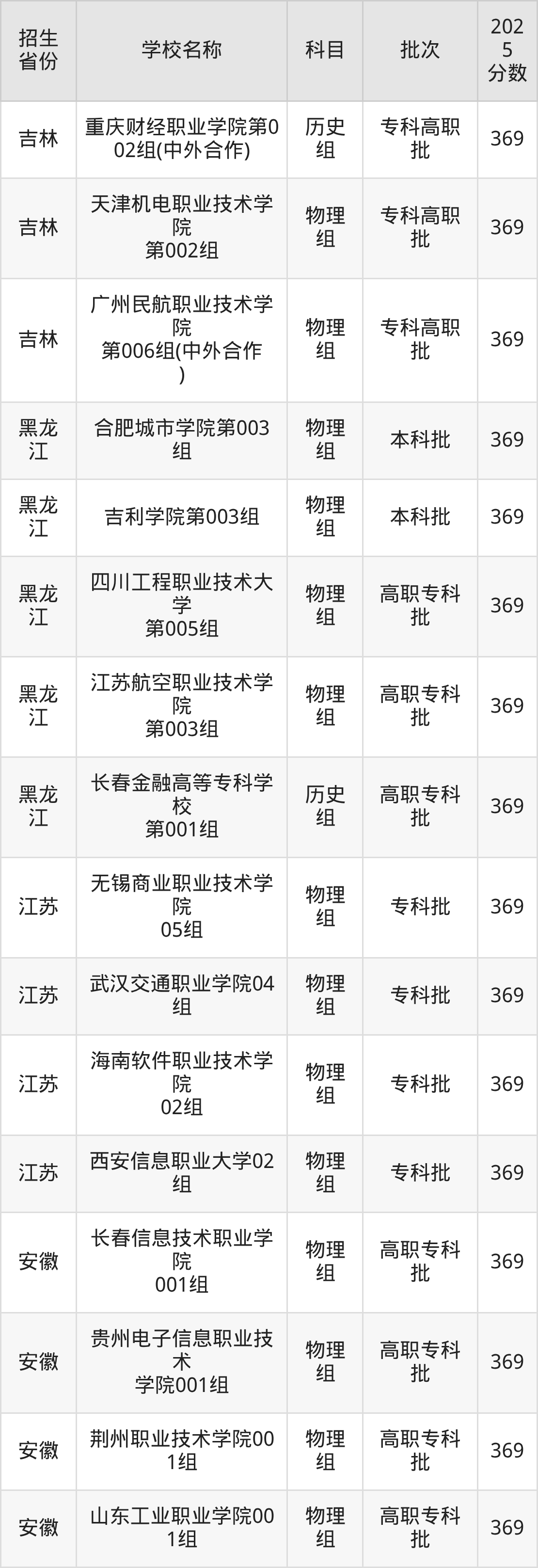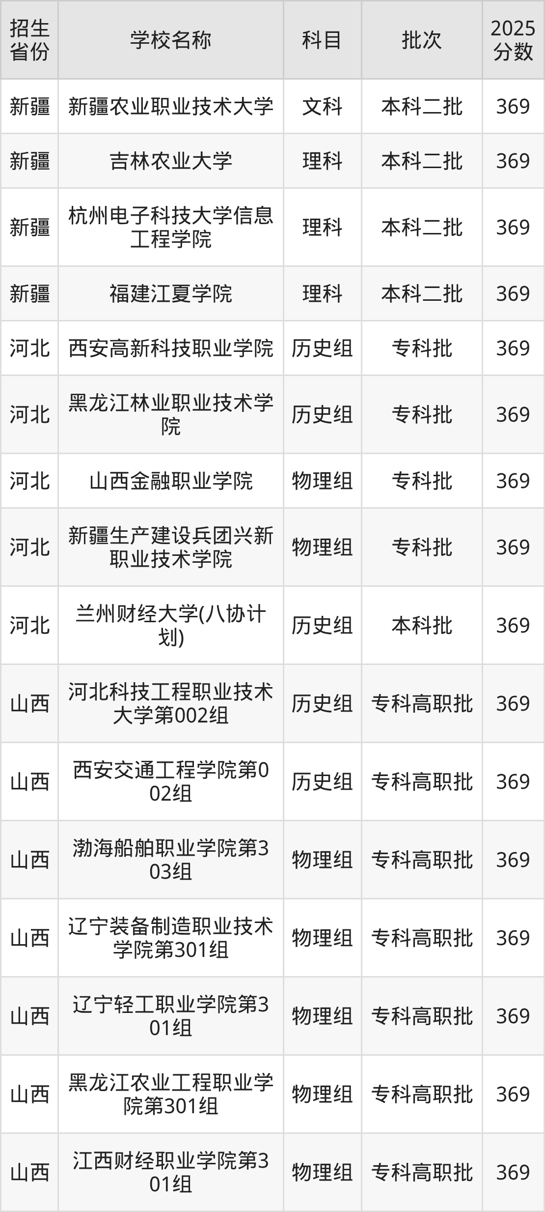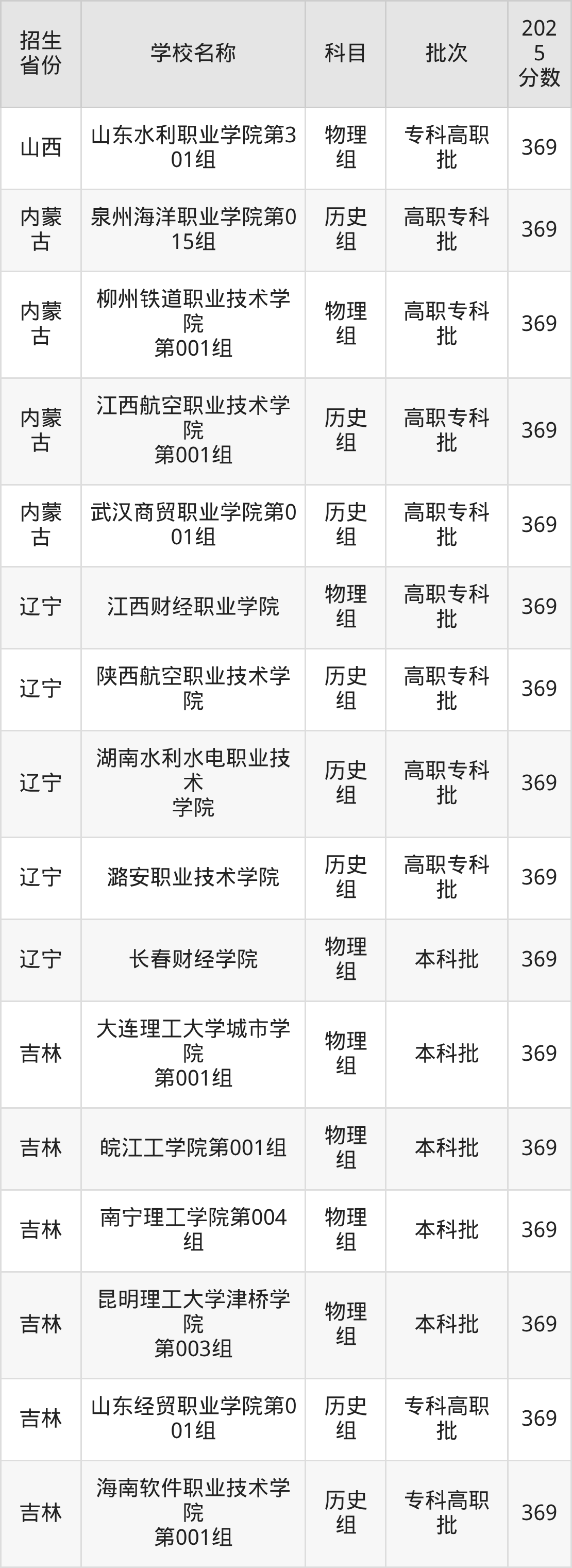 筛选全国各省2025年录取分数线为369分的理科大学如下:
