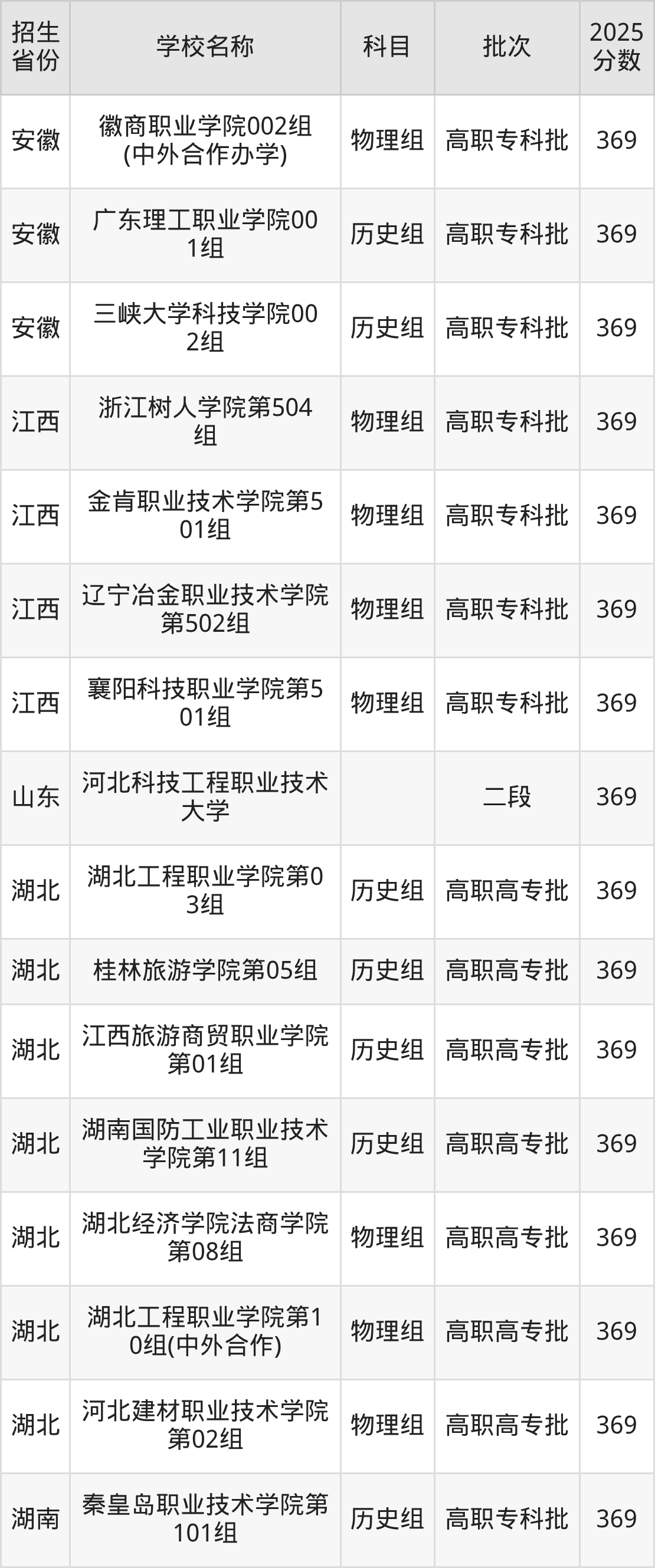 湖北省历史组分数线是369分的理科大学有:湖北工程职业学院、桂林旅游学院、江西旅游商贸职业学院、湖南国防工业职业技术学院。