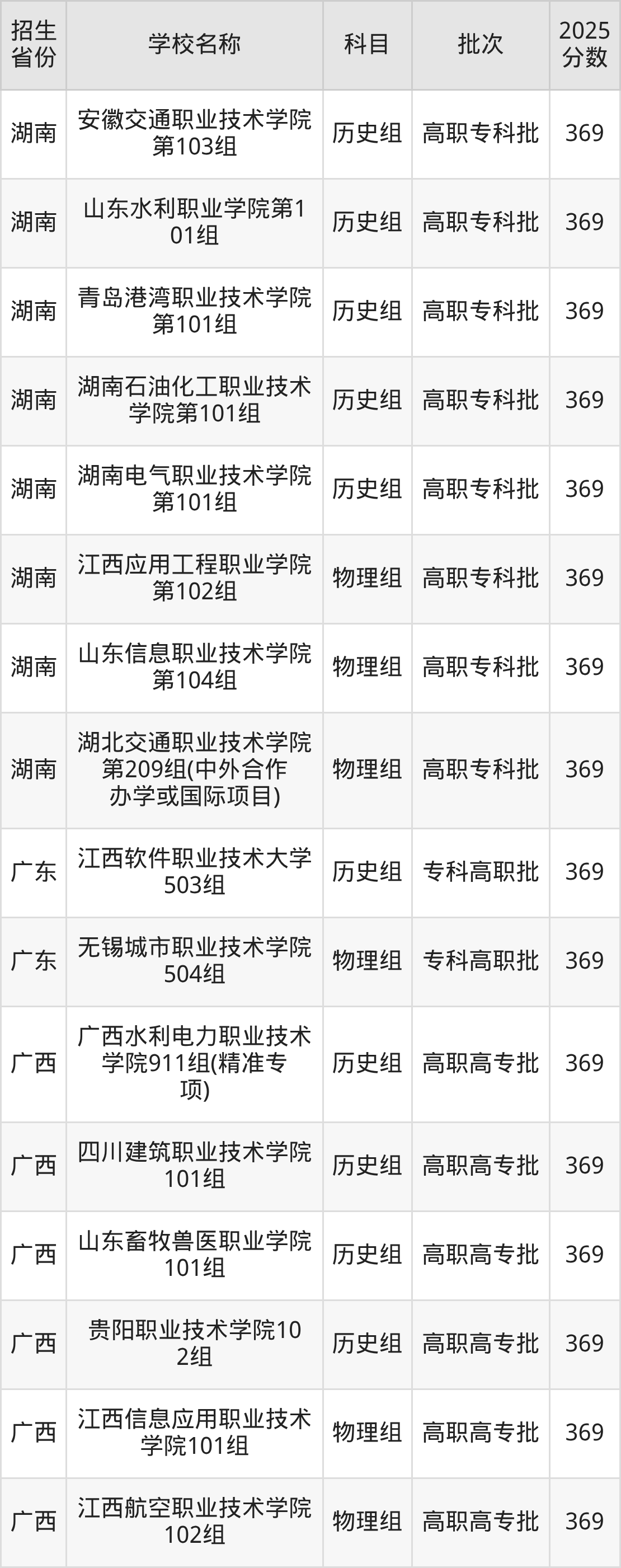 湖南省历史组分数线是369分的理科大学有:秦皇岛职业技术学院、安徽交通职业技术学院、山东水利职业学院、青岛港湾职业技术学院、湖南石油化工职业技术学院、湖南电气职业技术学院。