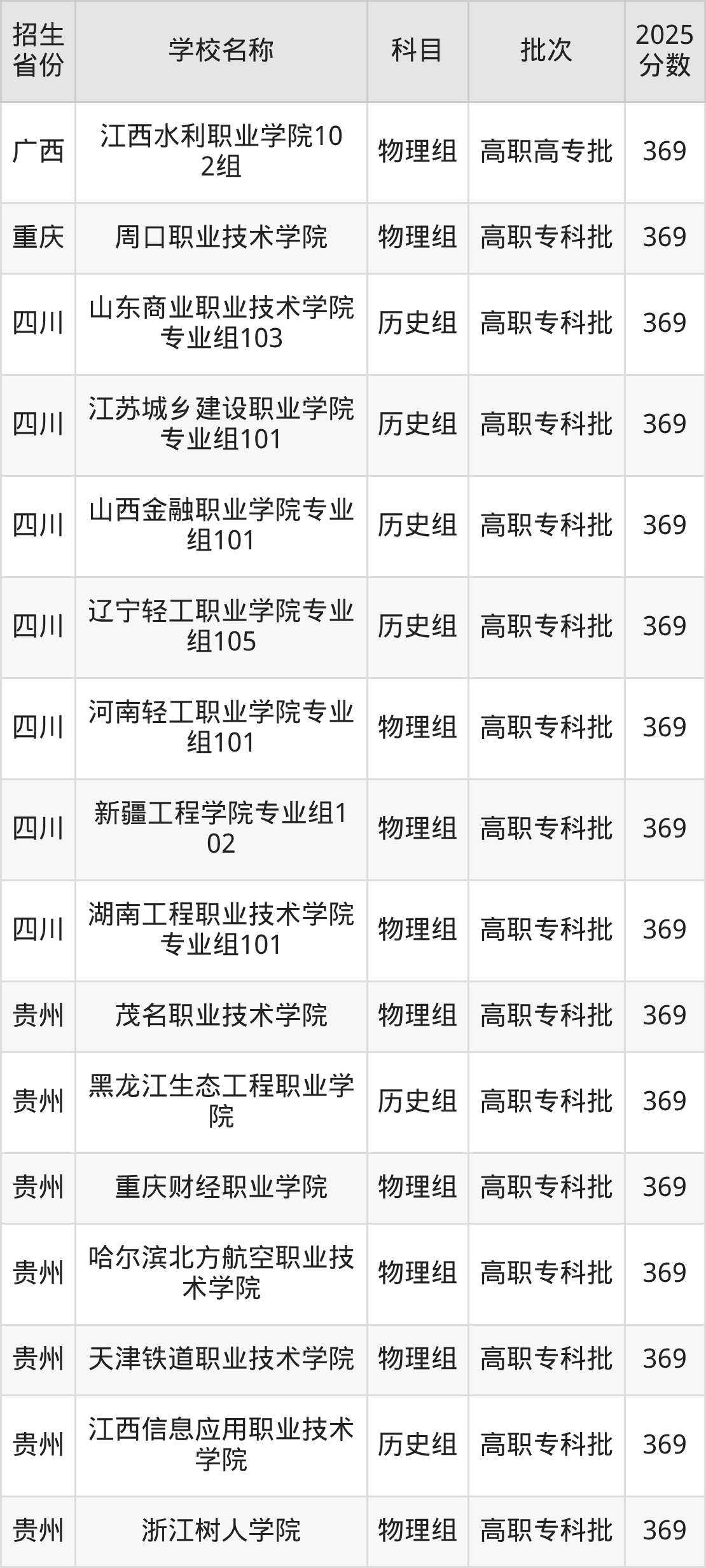 广西壮族自治区历史组分数线是369分的理科大学有:广西水利电力职业技术学院、四川建筑职业技术学院、山东畜牧兽医职业学院、贵阳职业技术学院。