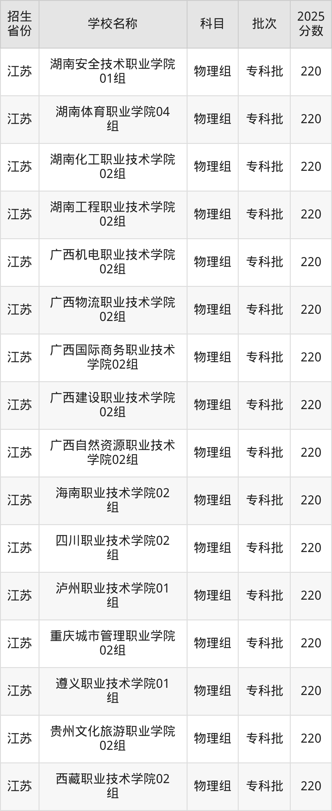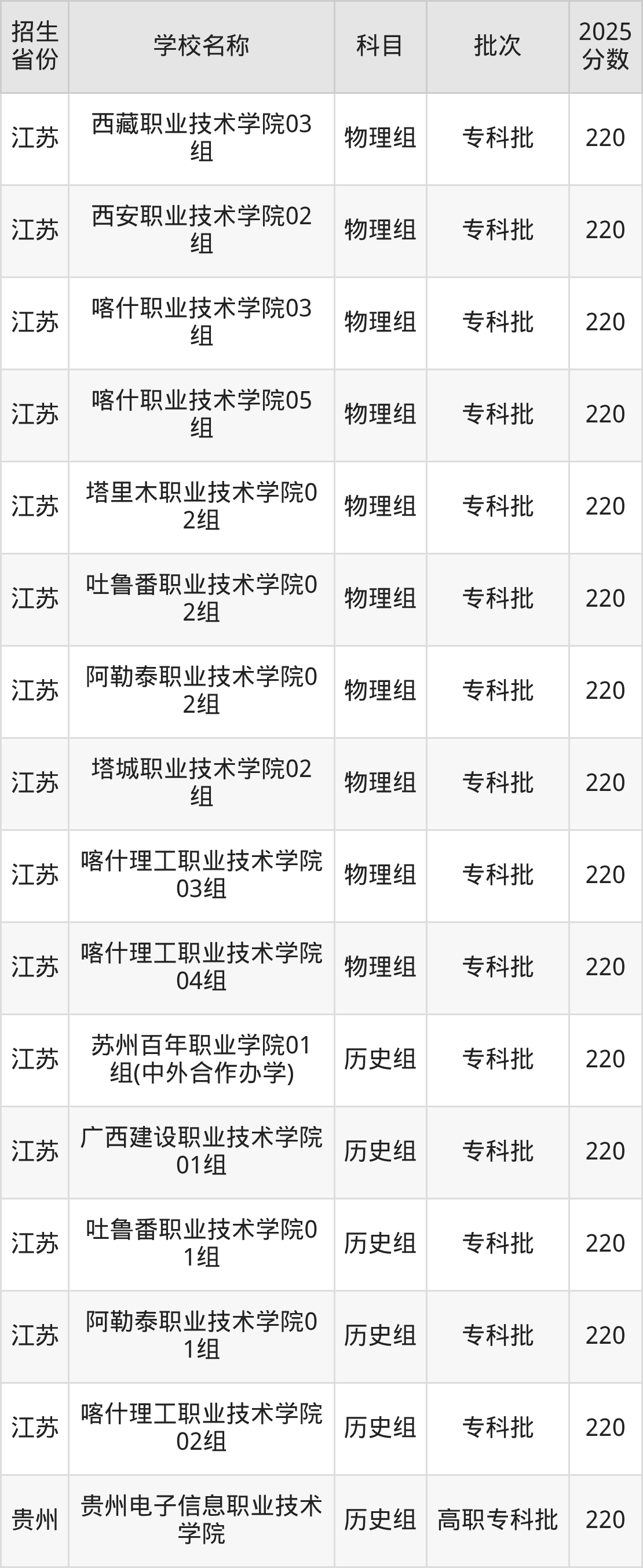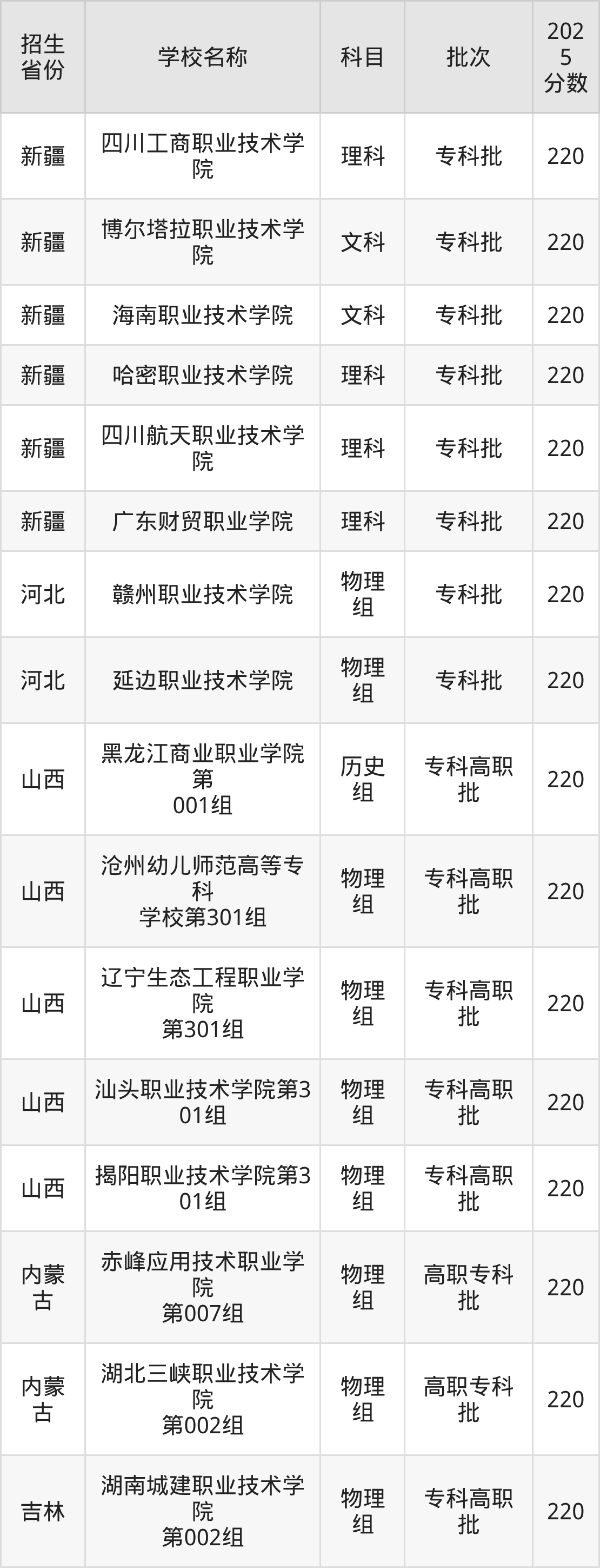 二、各省220分的公办专科大学名单