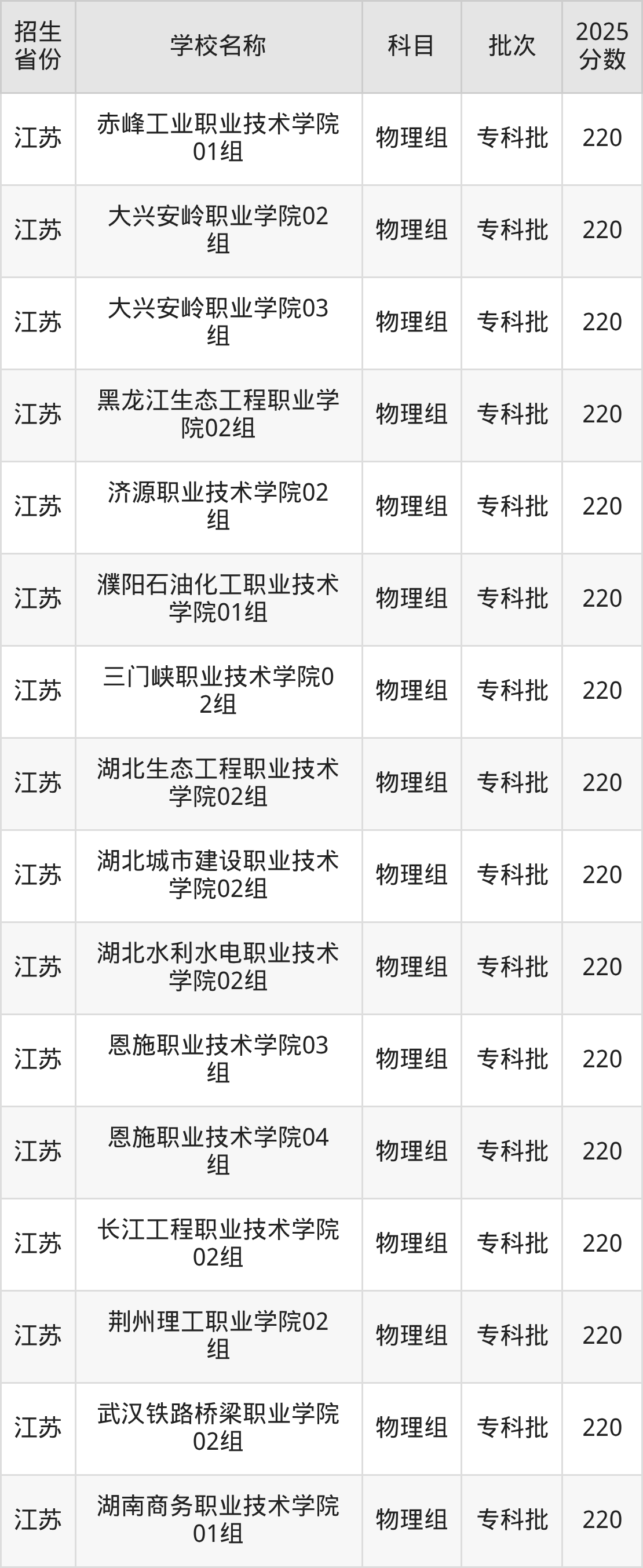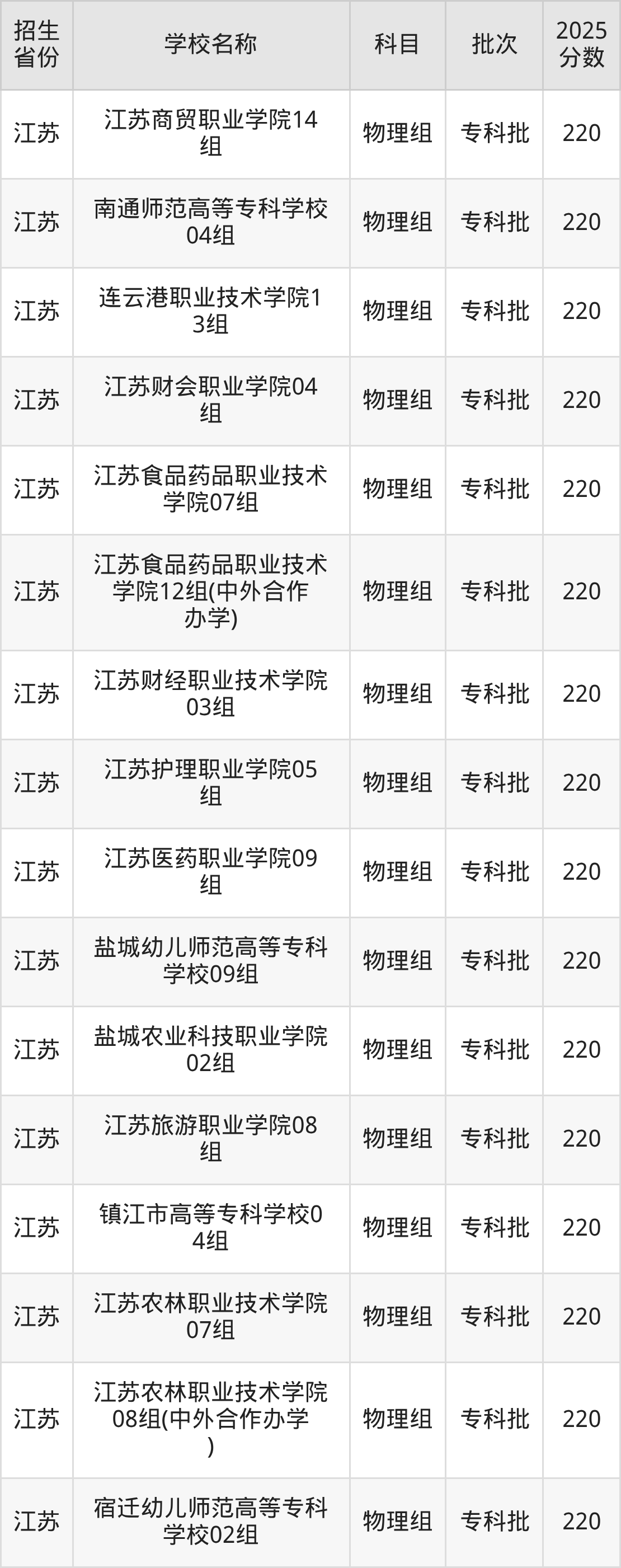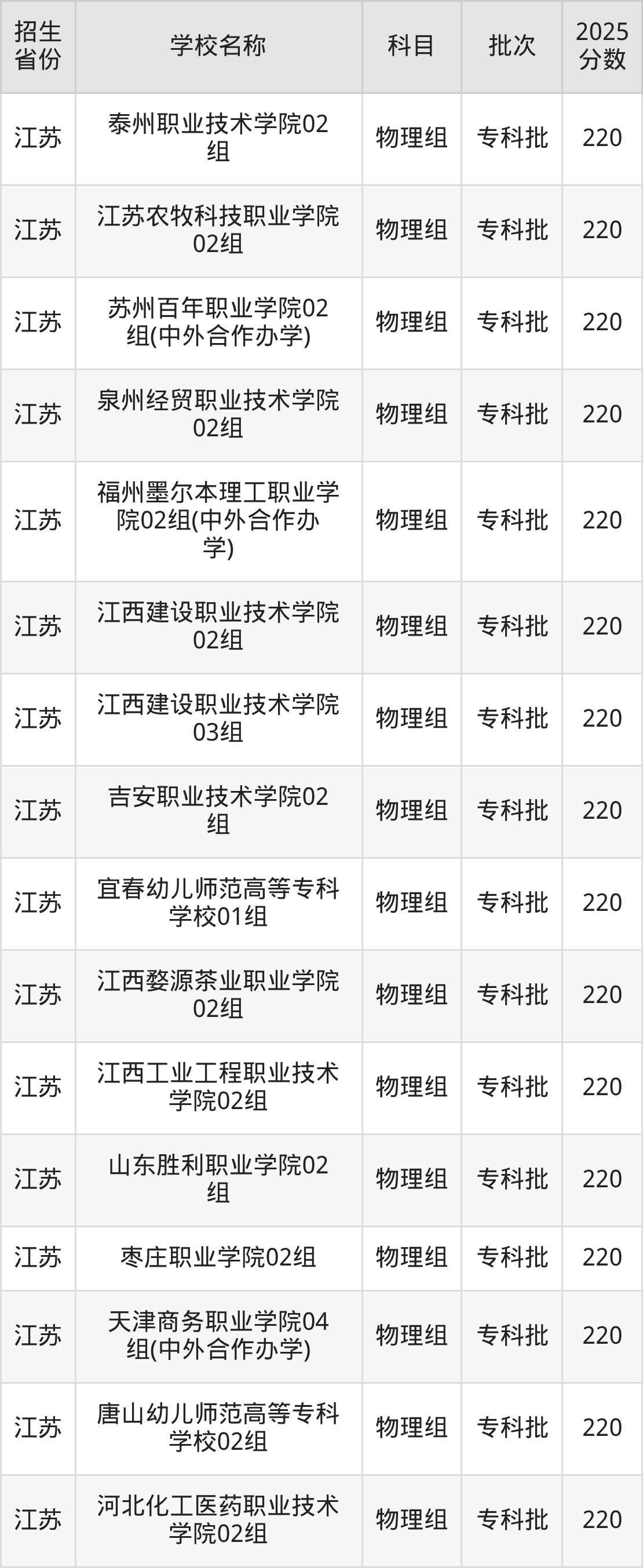 二、各省220分的公办专科大学名单