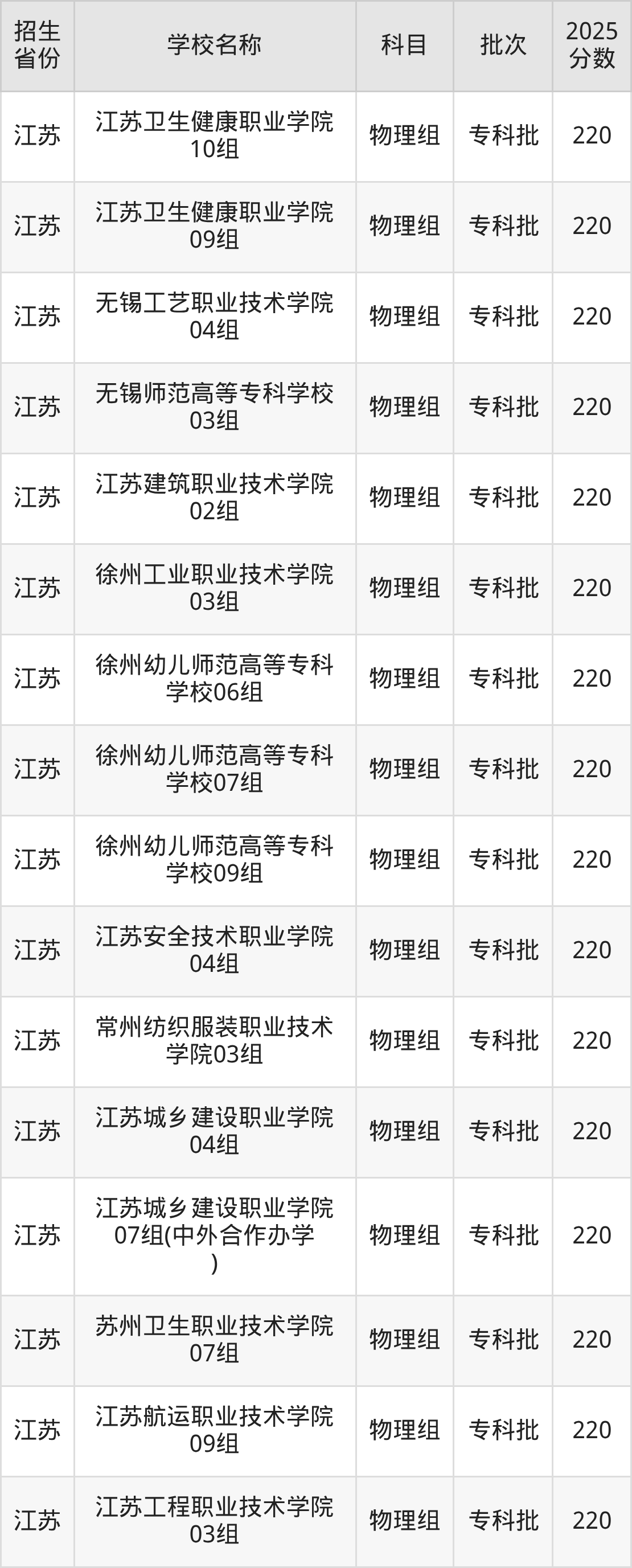 江苏省物理组分数线是220分的公办专科大学有:江苏卫生健康职业学院、无锡工艺职业技术学院、无锡师范高等专科学校、江苏建筑职业技术学院、徐州工业职业技术学院、徐州幼儿师范高等专科学校、江苏安全技术职业学院、常州纺织服装职业技术学院、江苏城乡建设职业学院、苏州卫生职业技术学院。