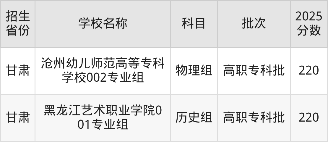 甘肃省物理组分数线是220分的公办专科大学有:沧州幼儿师范高等专科学校。