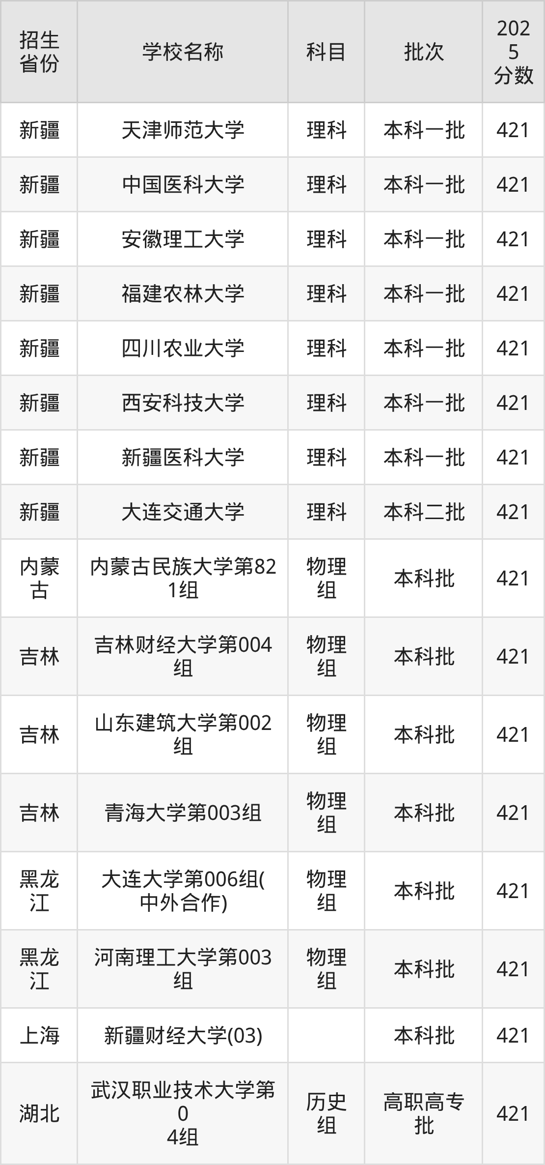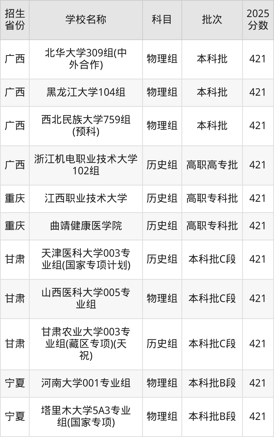 筛选全国各省2025年录取分数线为421分的重点大学如下: