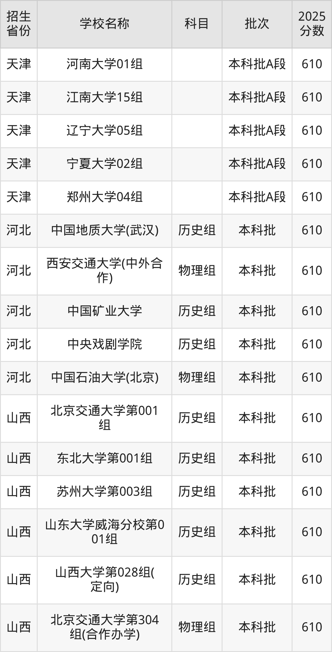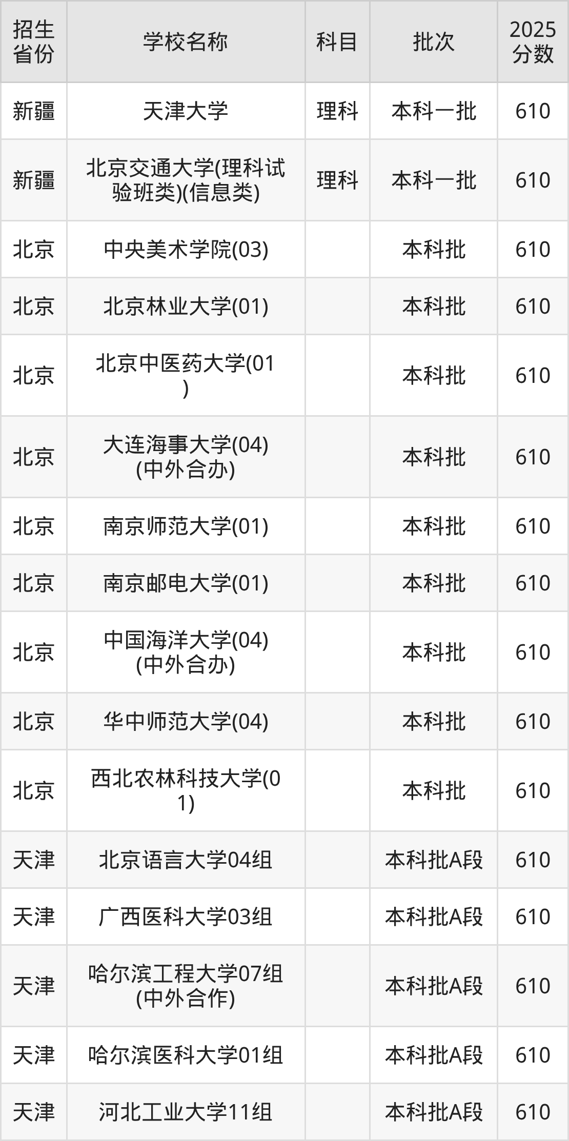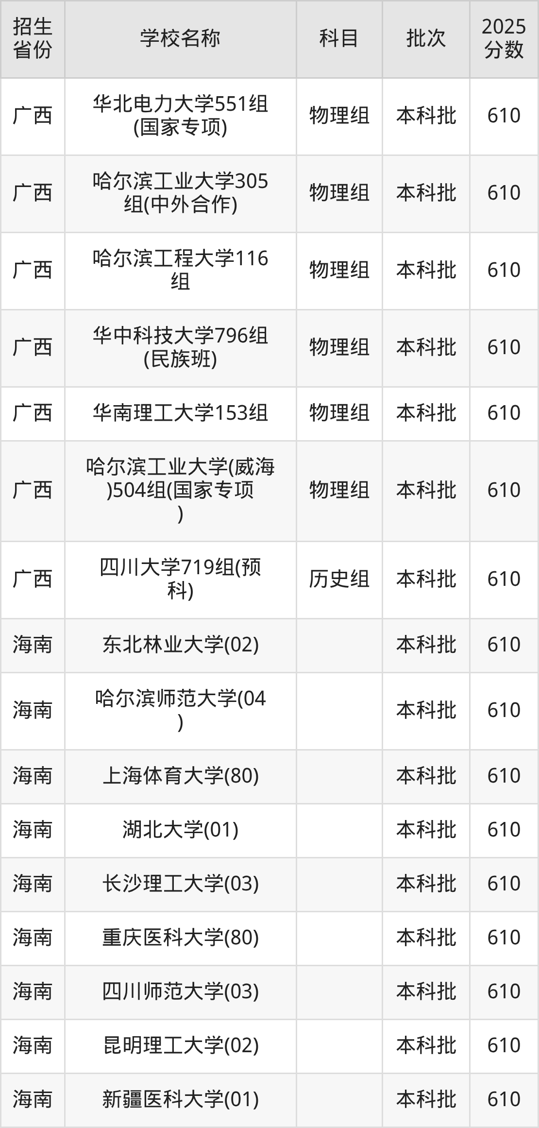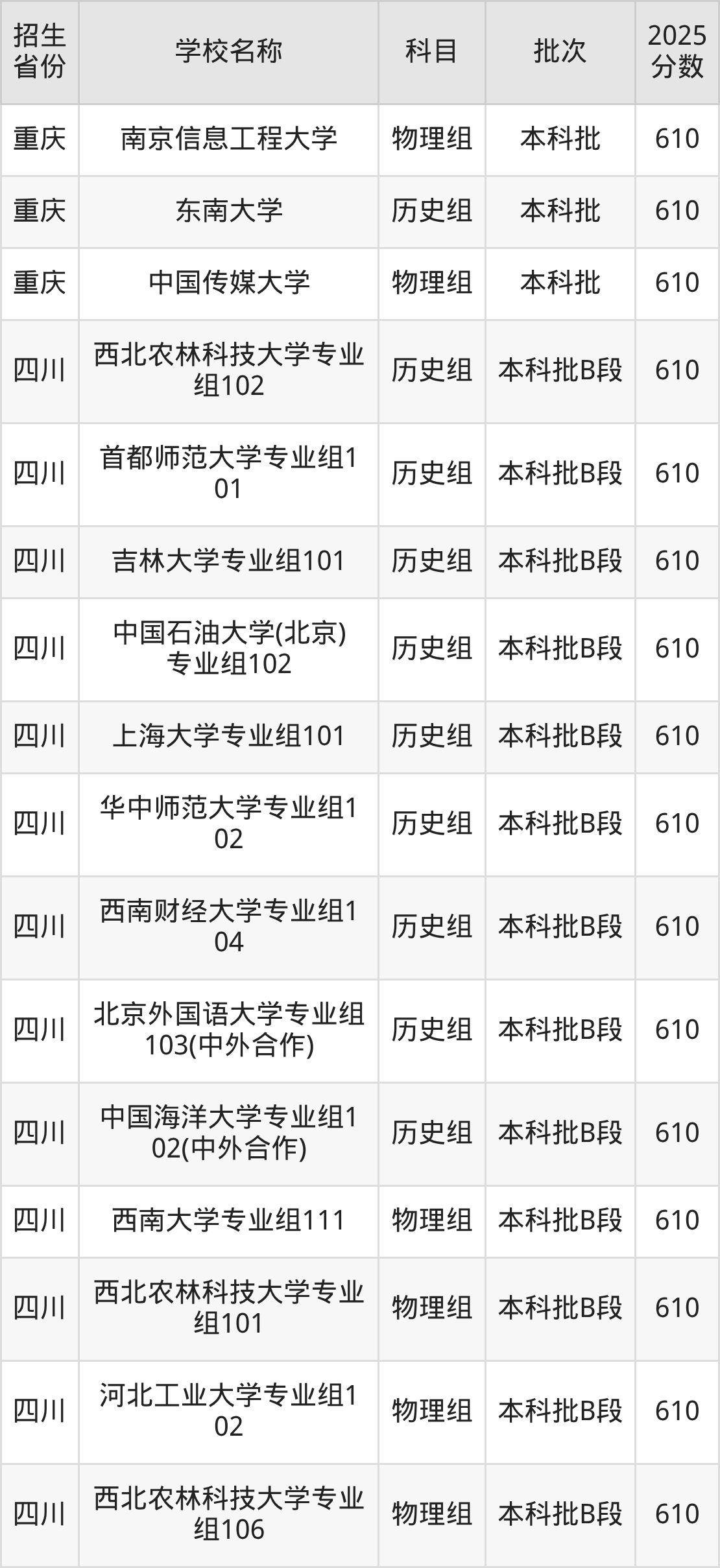 筛选全国各省2025年录取分数线为610分的重点大学如下: