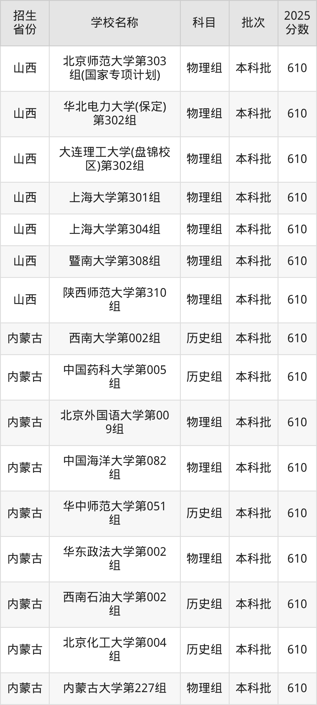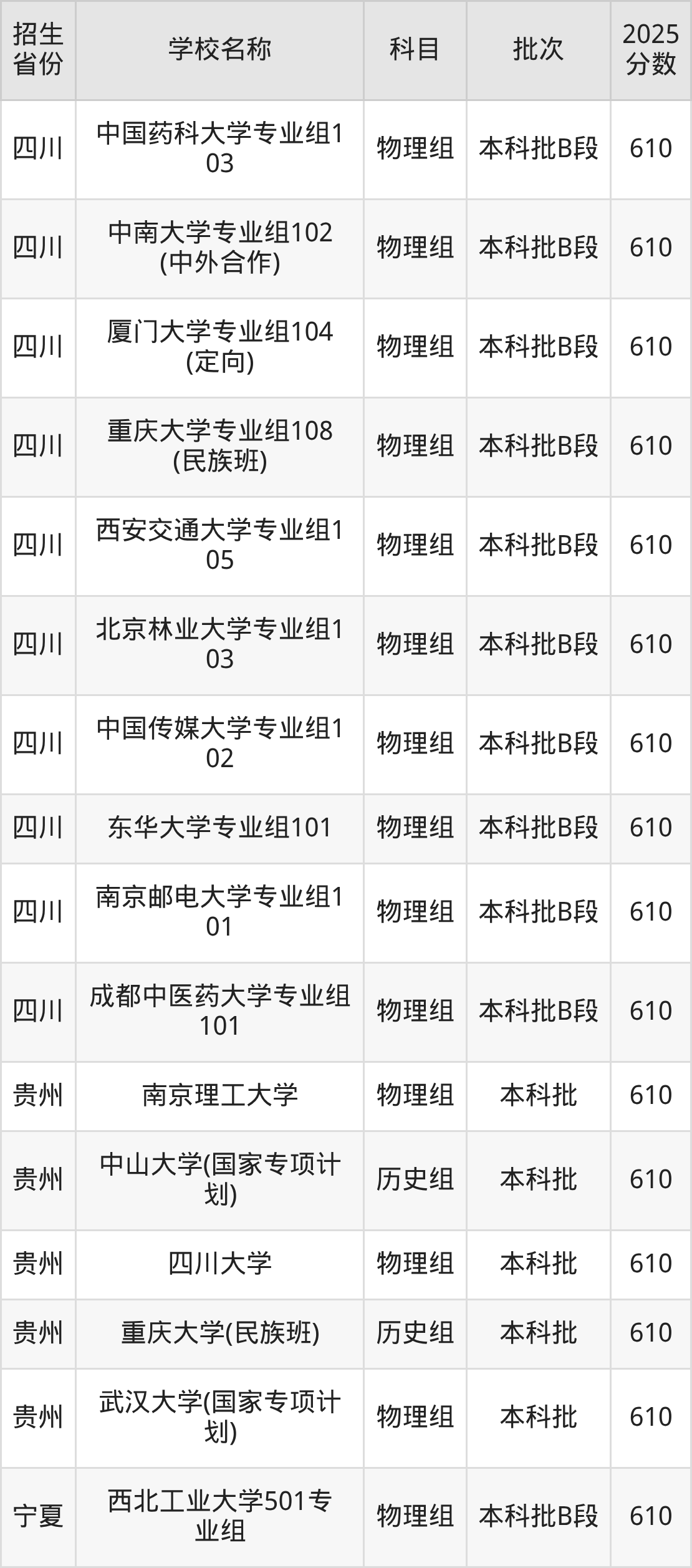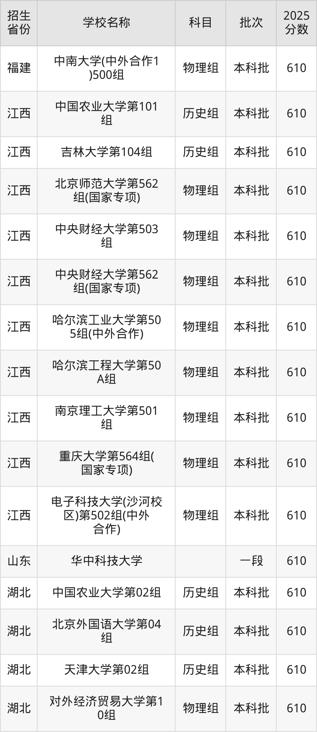 筛选全国各省2025年录取分数线为610分的重点大学如下: