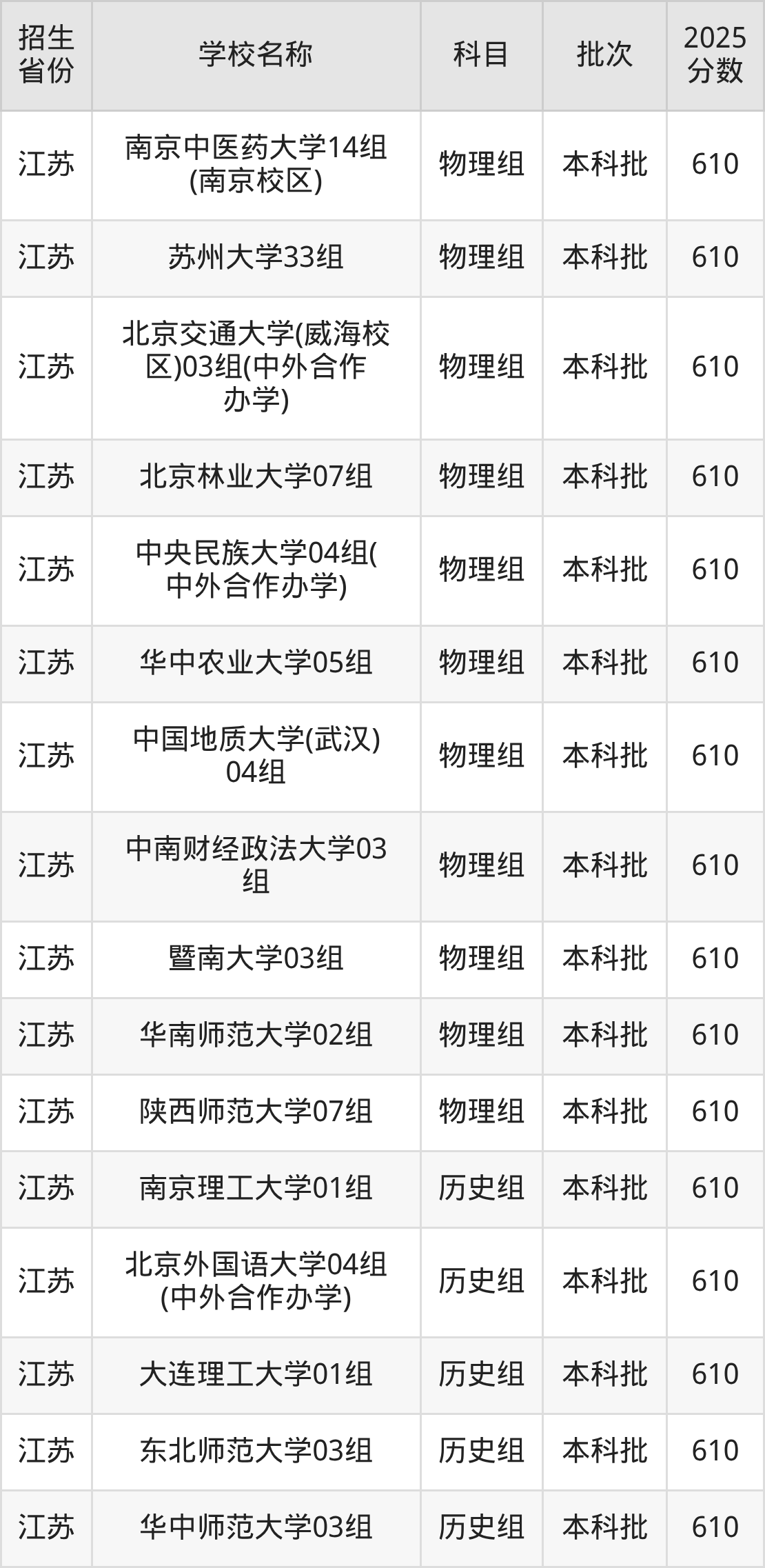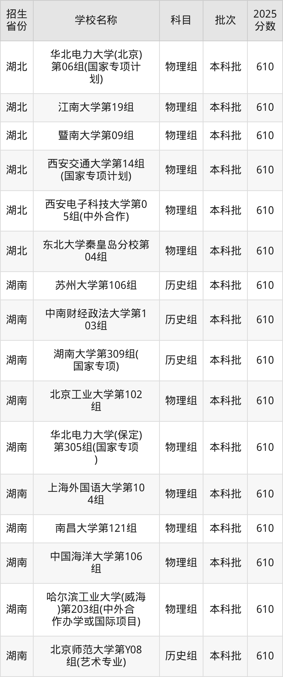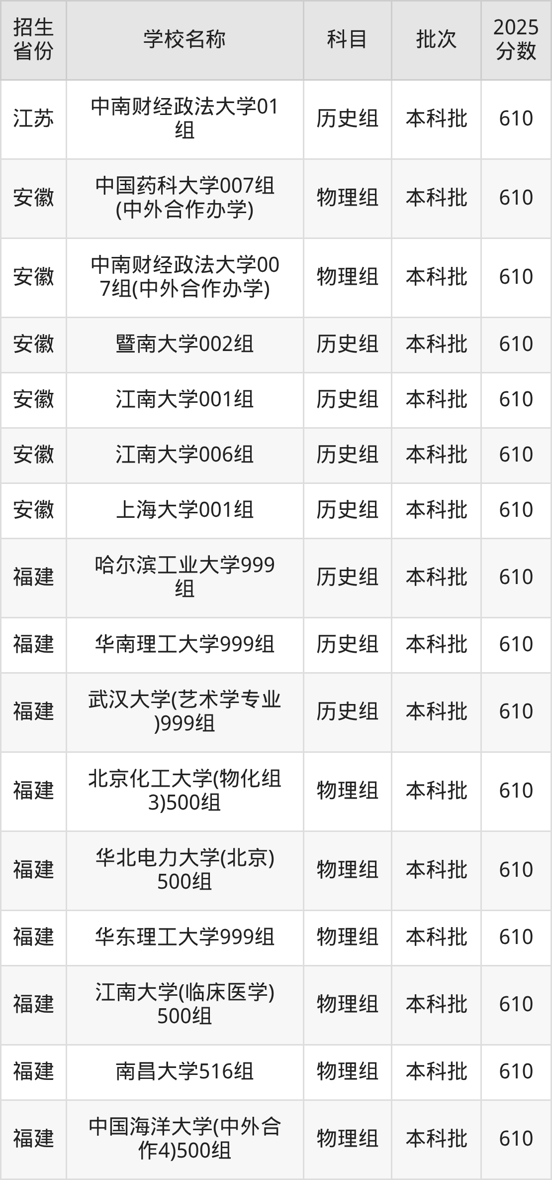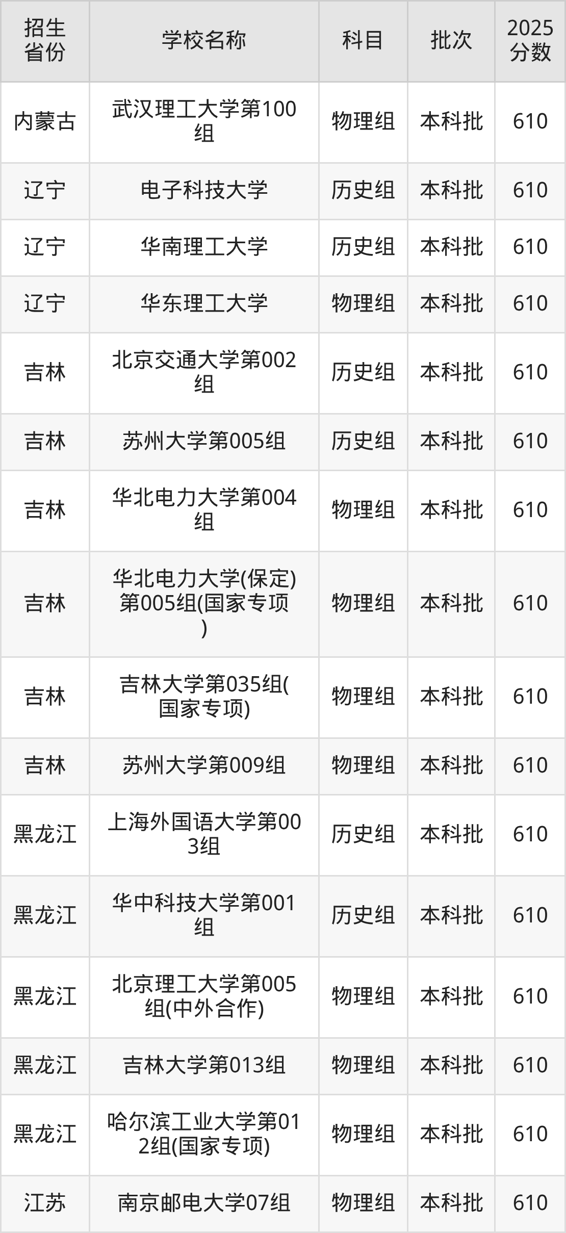 筛选全国各省2025年录取分数线为610分的重点大学如下: