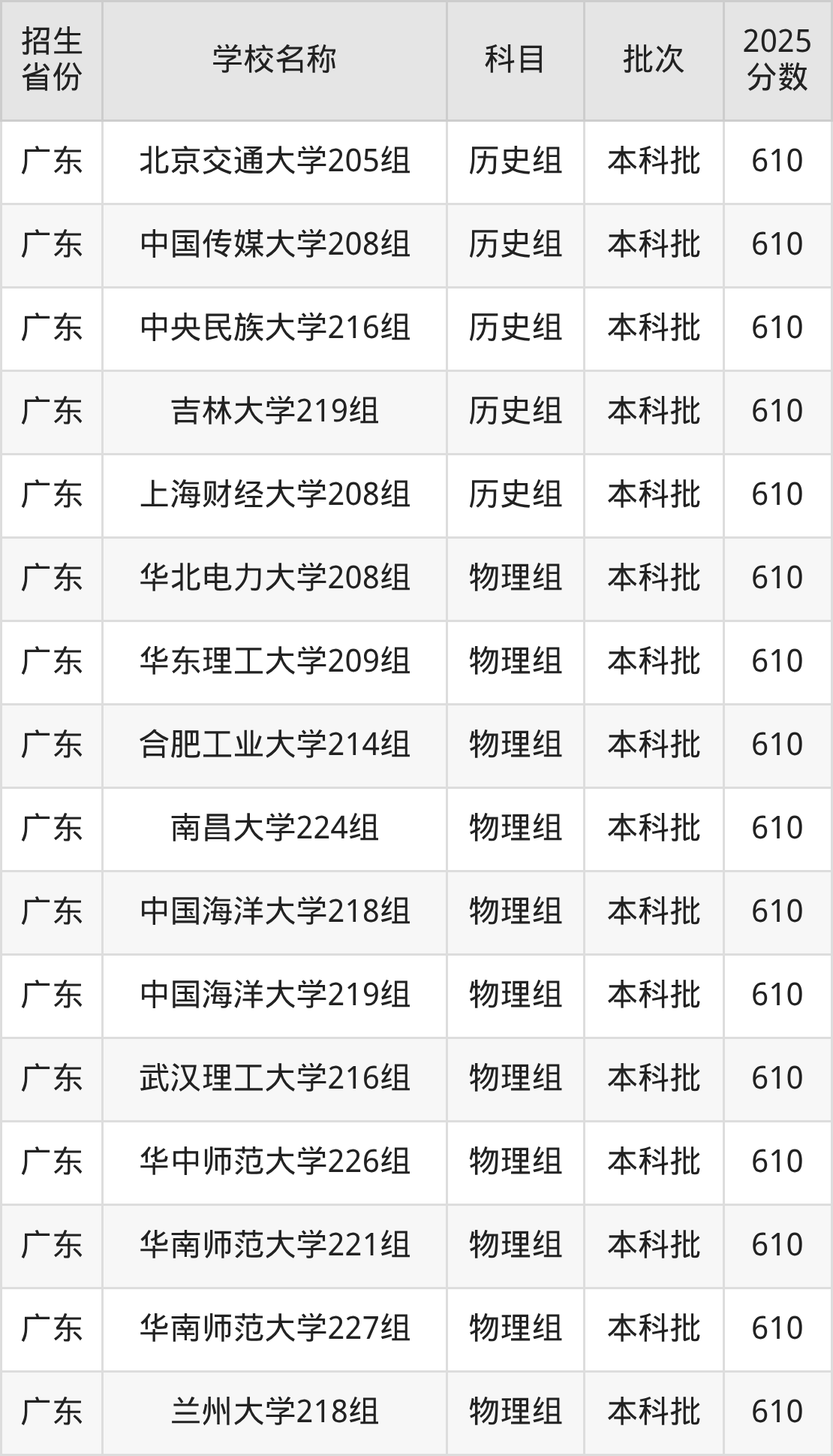 广东省历史组分数线是610分的重点大学有:北京交通大学、中国传媒大学、中央民族大学、吉林大学、上海财经大学。