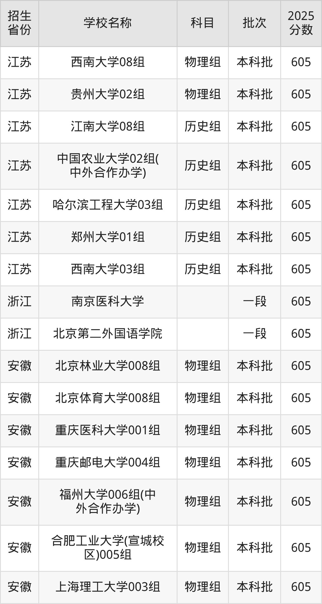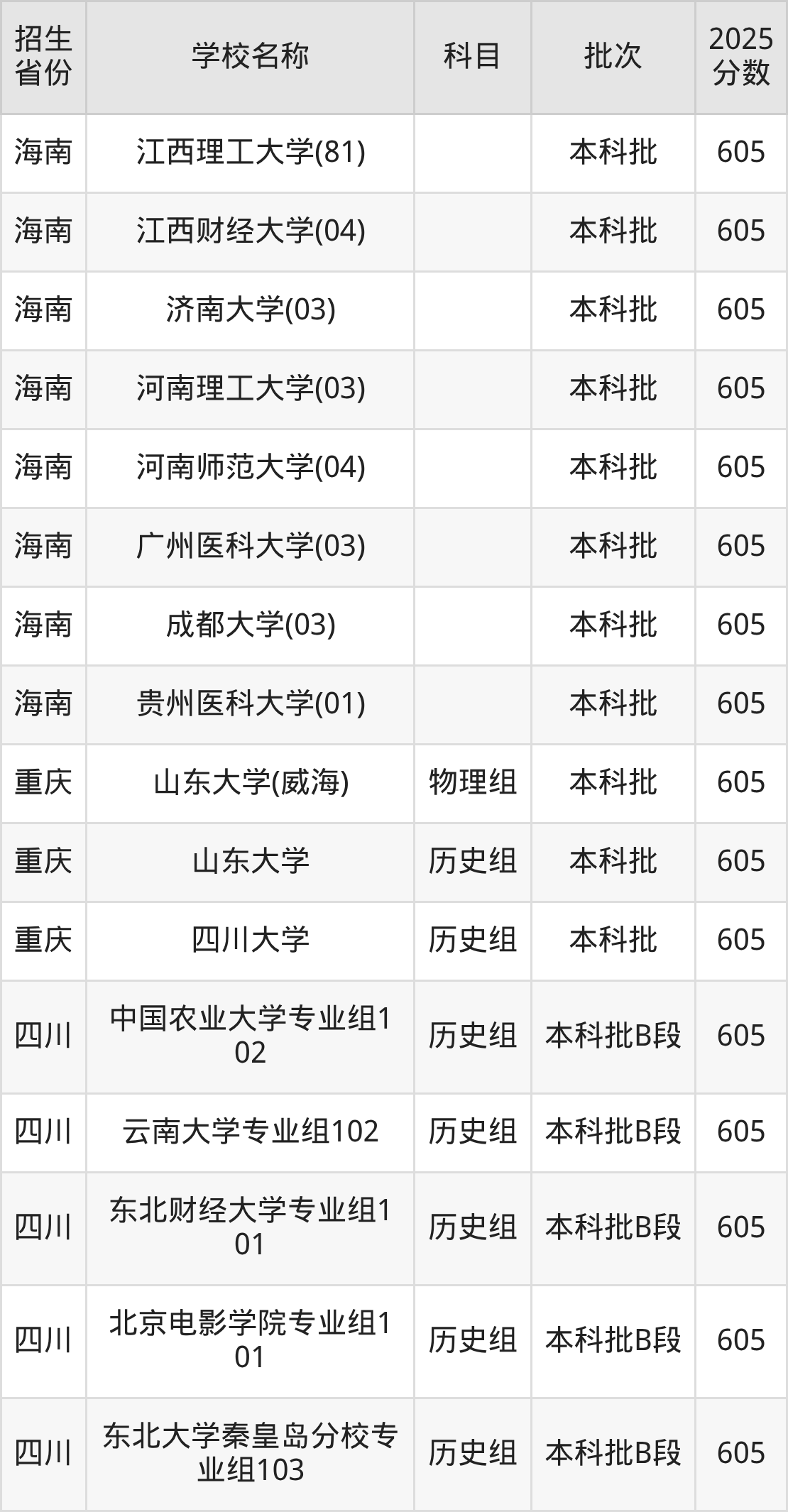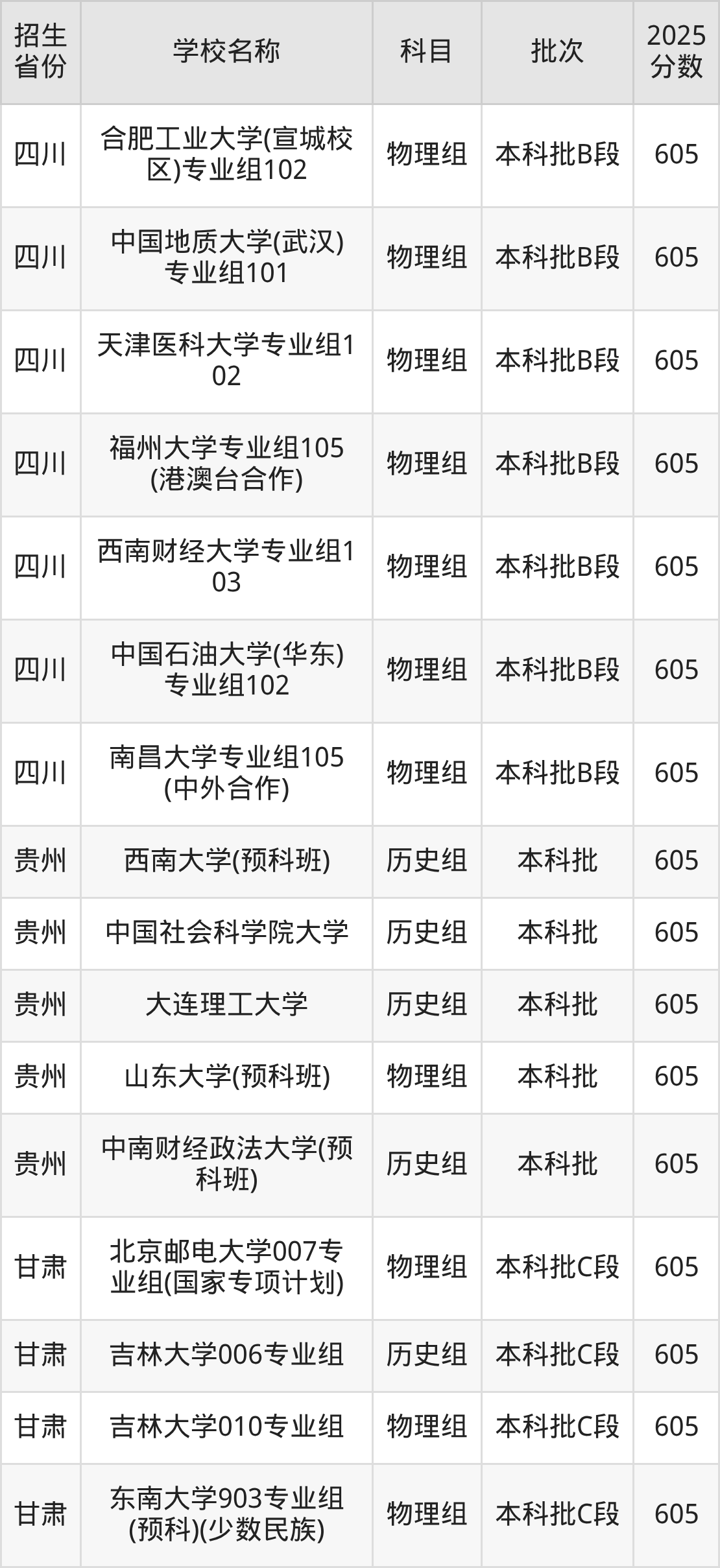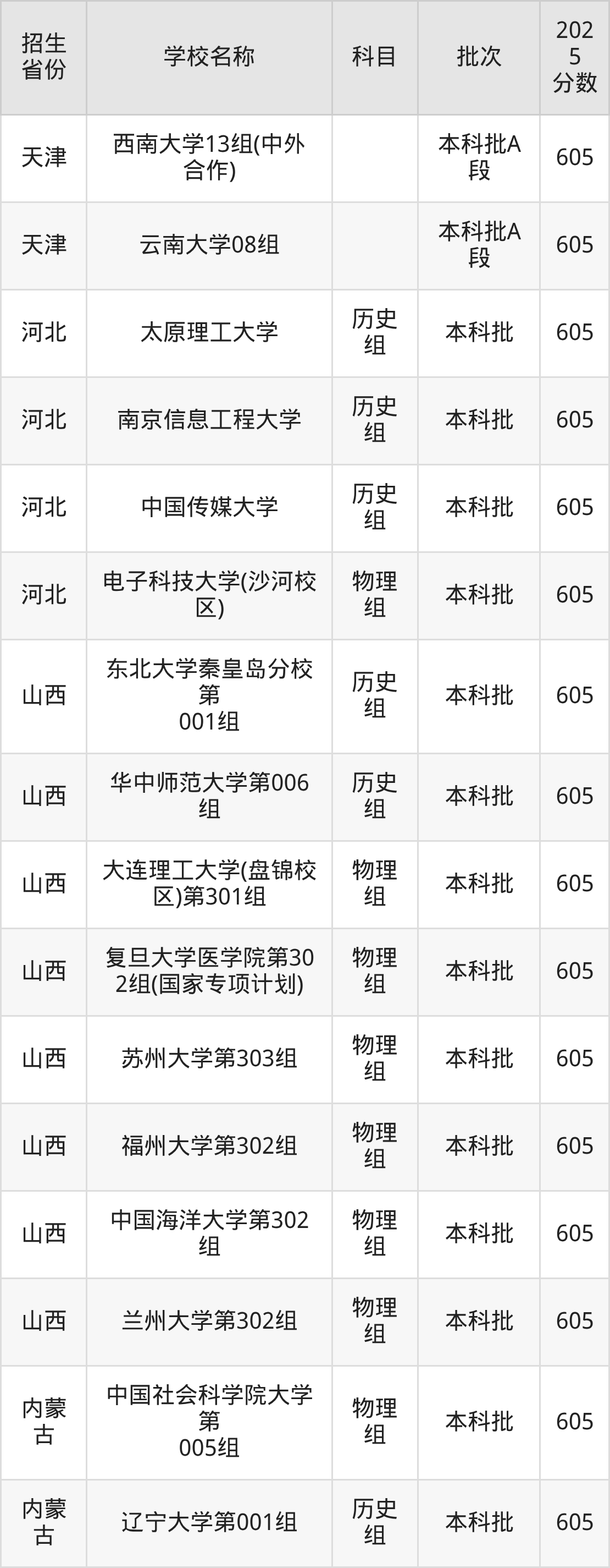 筛选全国各省2025年录取分数线为605分的重点大学如下: