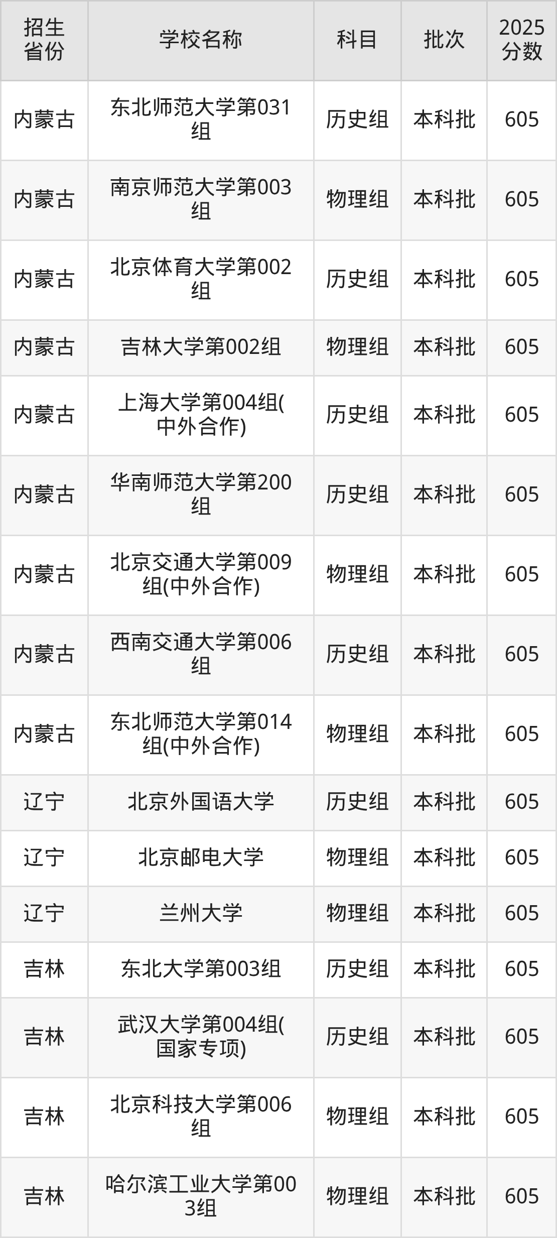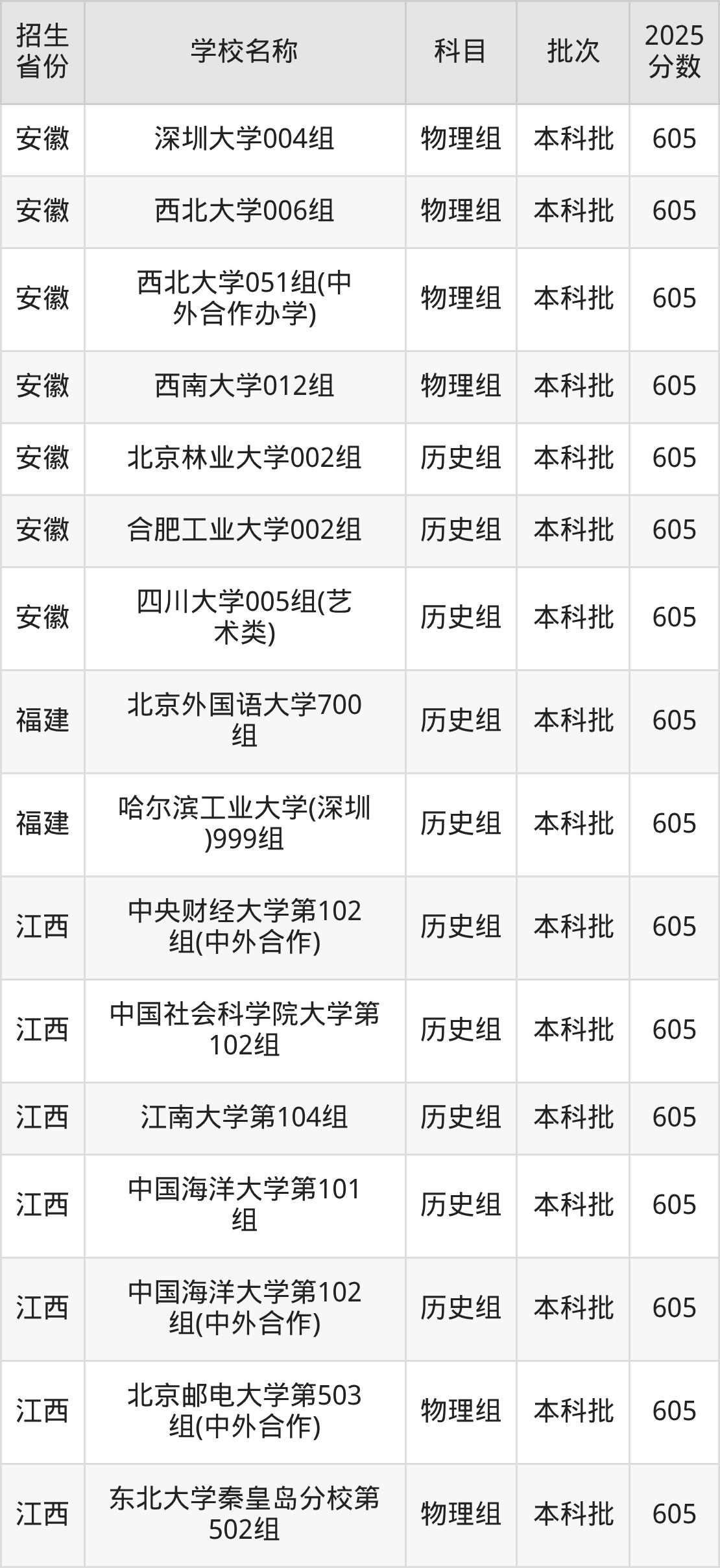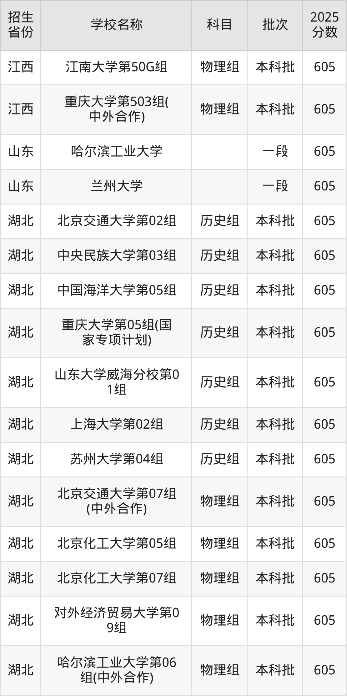 筛选全国各省2025年录取分数线为605分的重点大学如下: