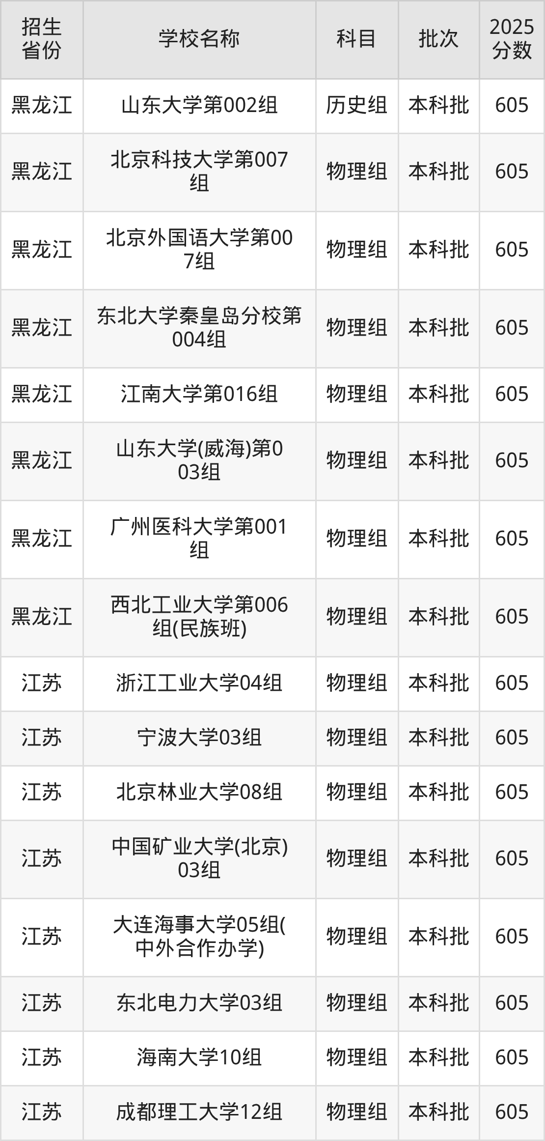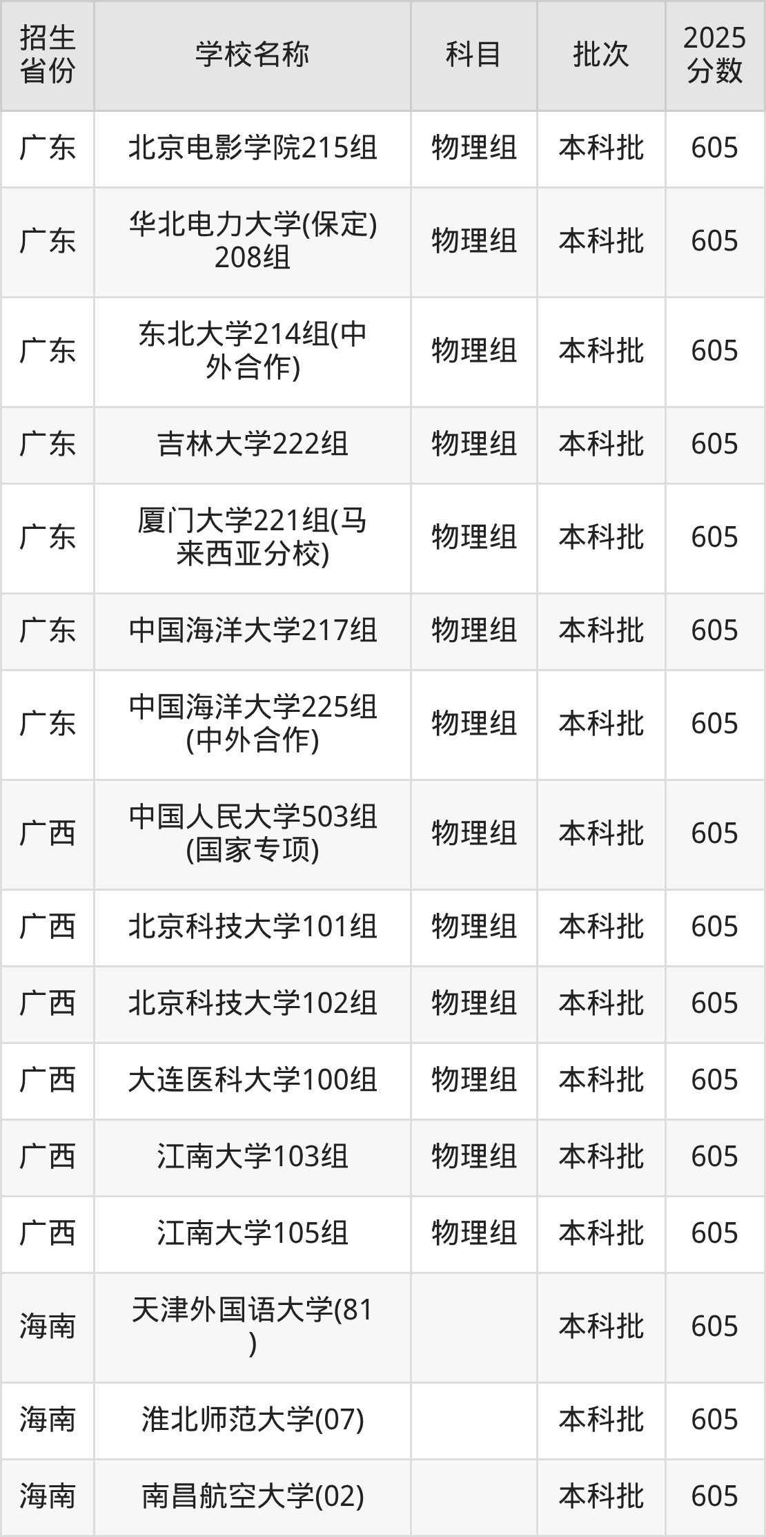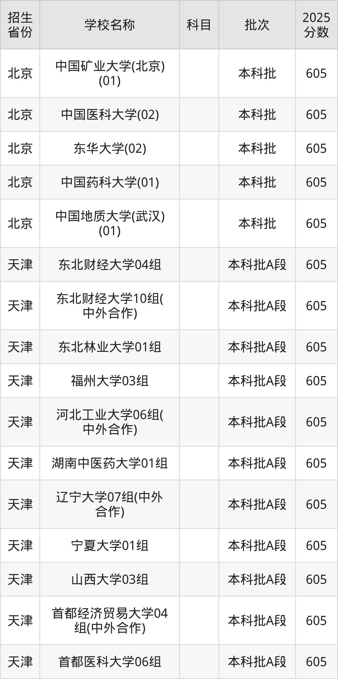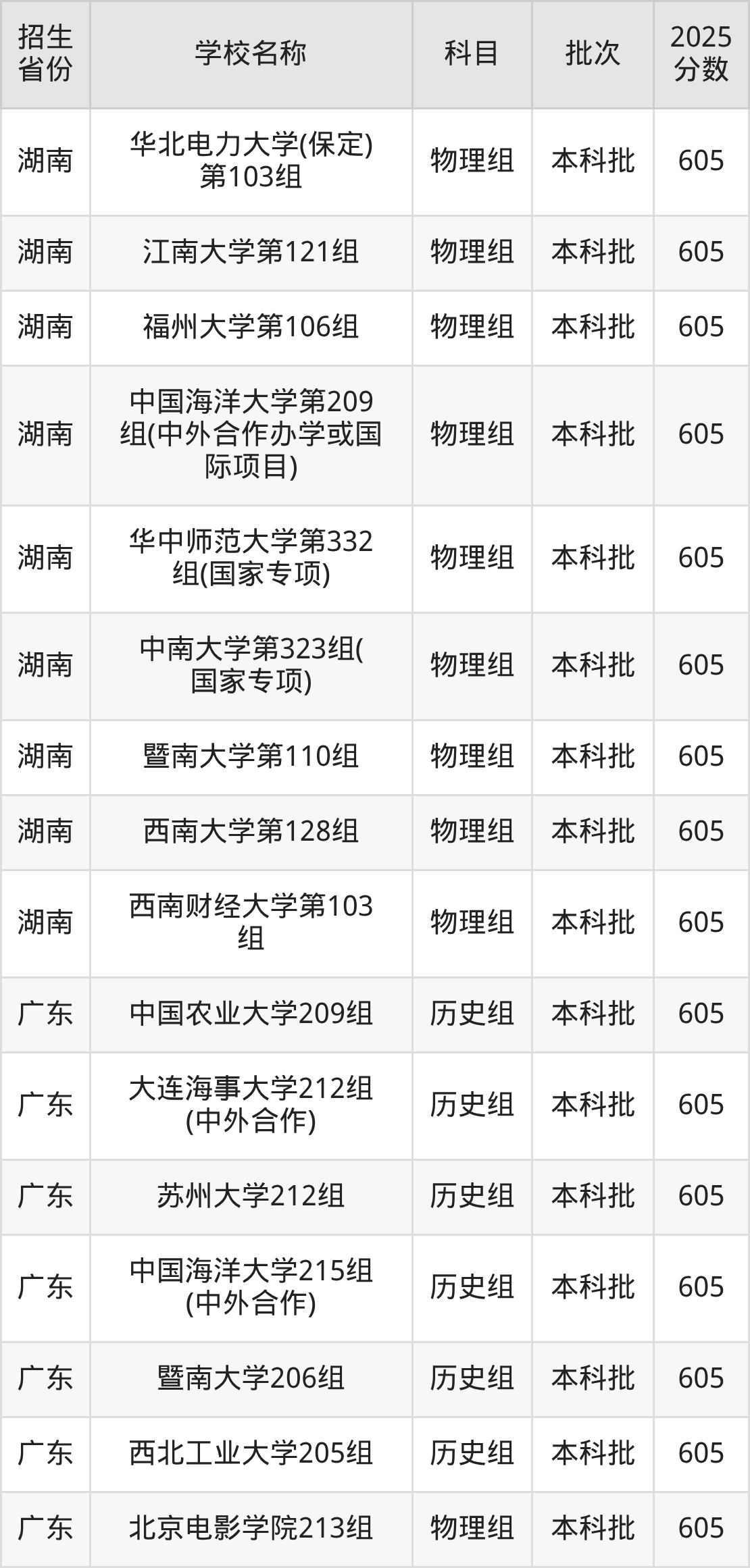 筛选全国各省2025年录取分数线为605分的重点大学如下: