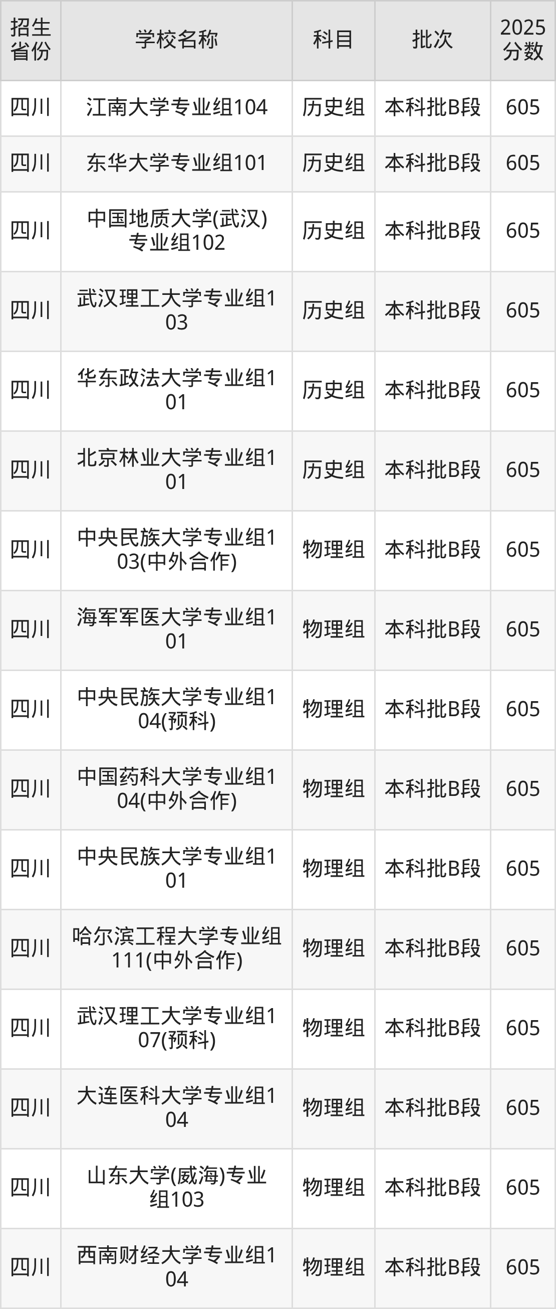 四川省历史组分数线是605分的重点大学有:中国农业大学、云南大学、东北财经大学、北京电影学院、东北大学秦皇岛分校、江南大学、东华大学、中国地质大学(武汉)、武汉理工大学、华东政法大学。