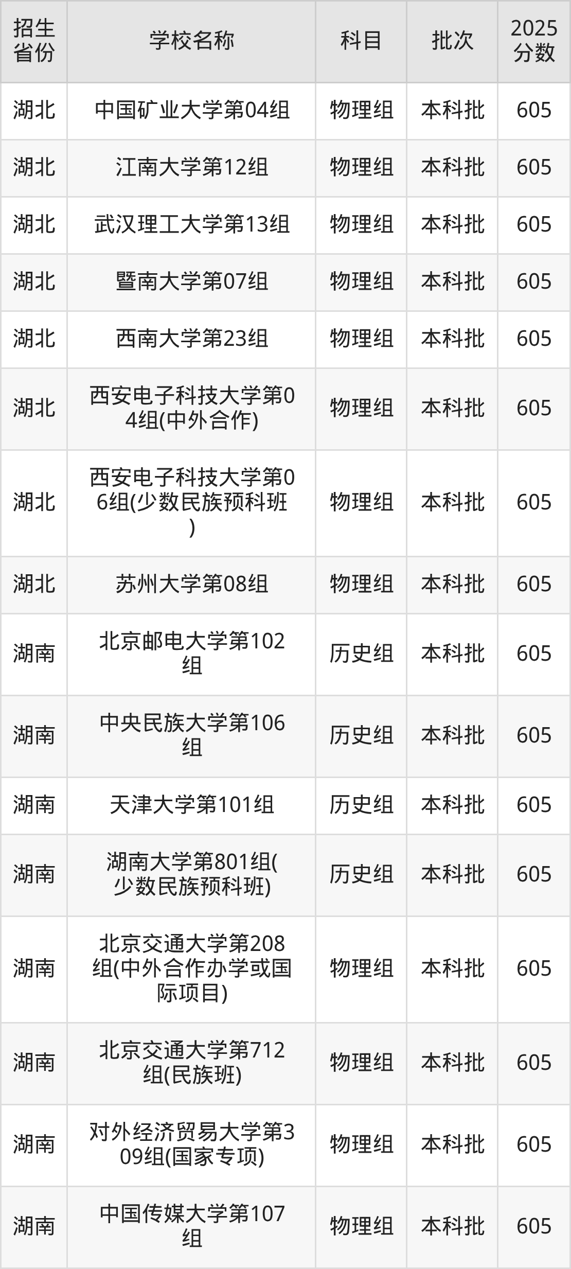 湖南省历史组分数线是605分的重点大学有:北京邮电大学、中央民族大学、天津大学、湖南大学。
