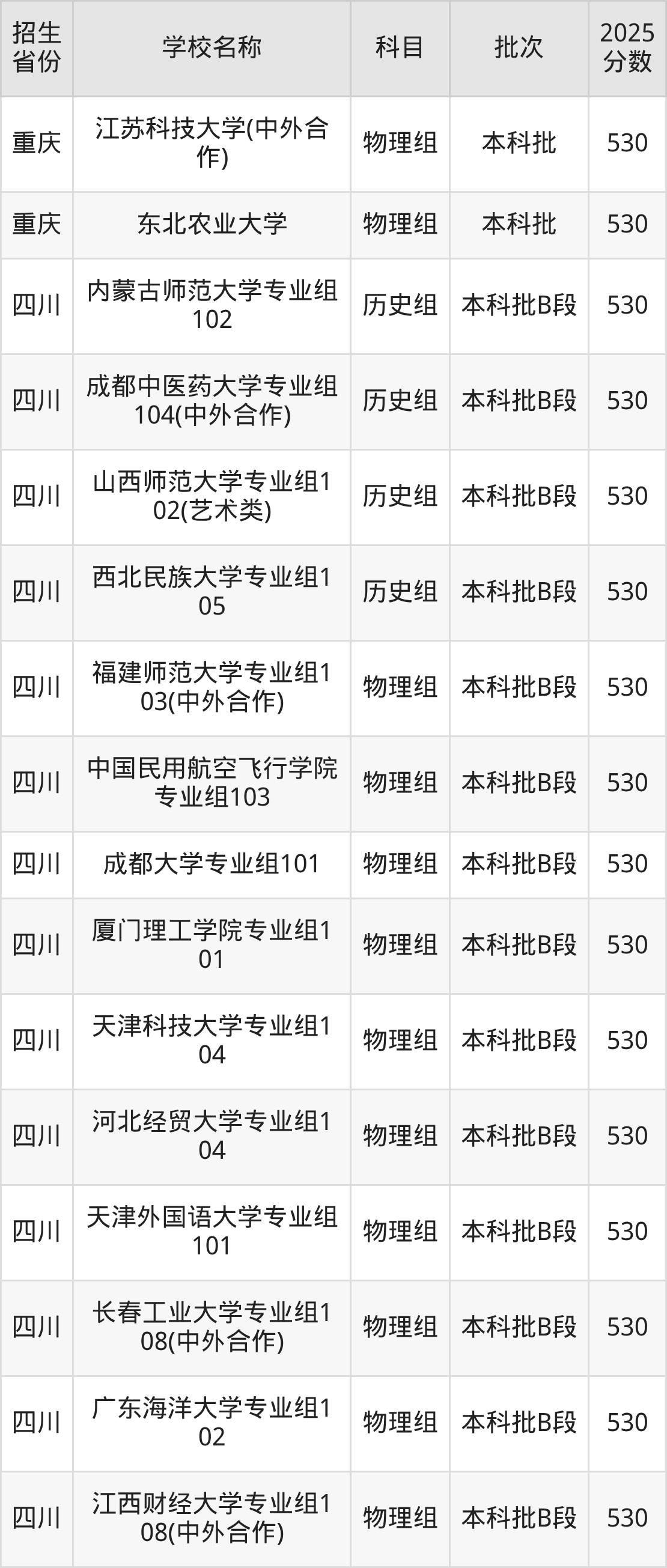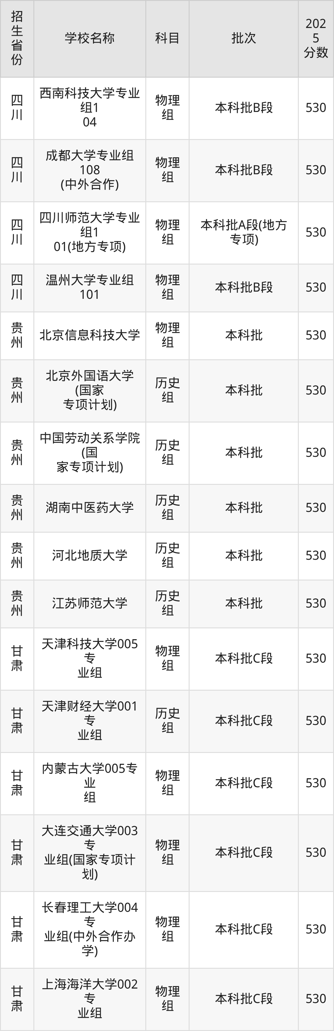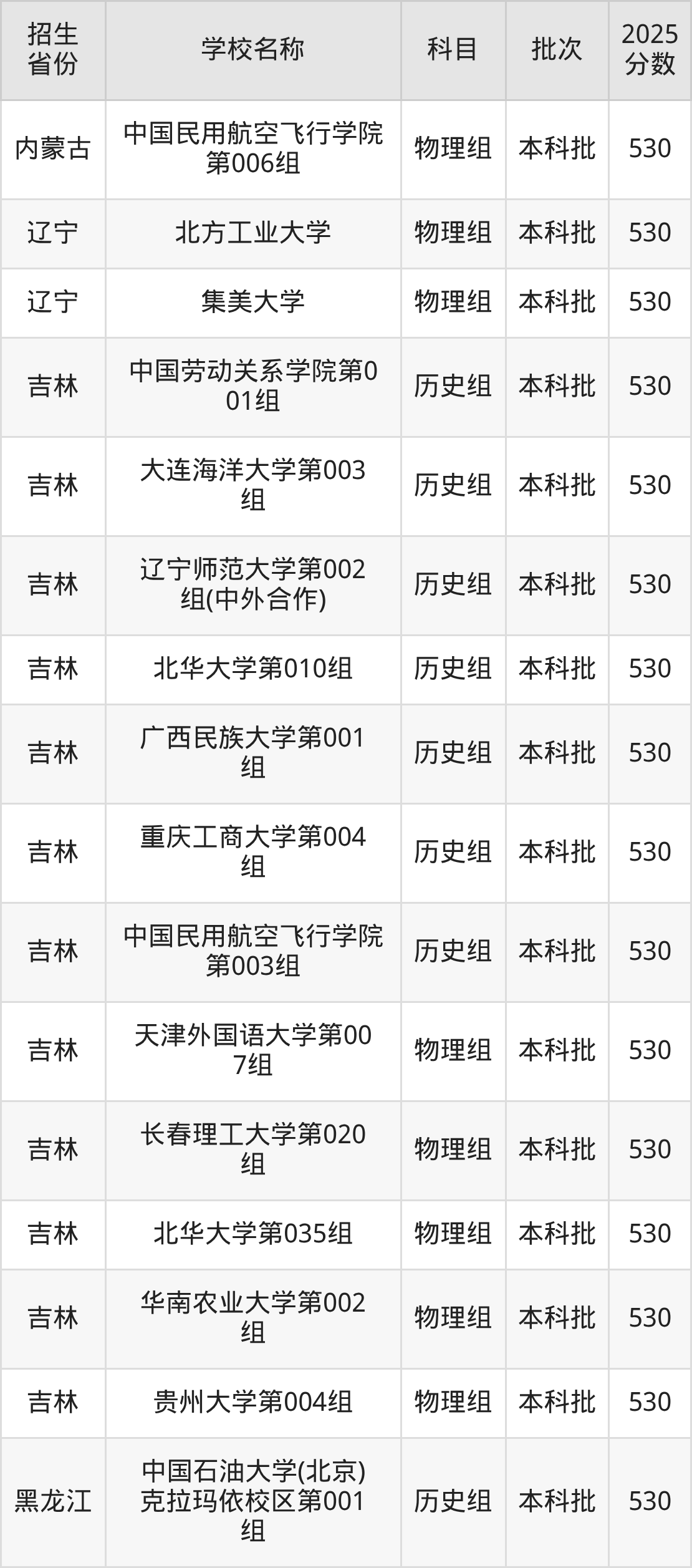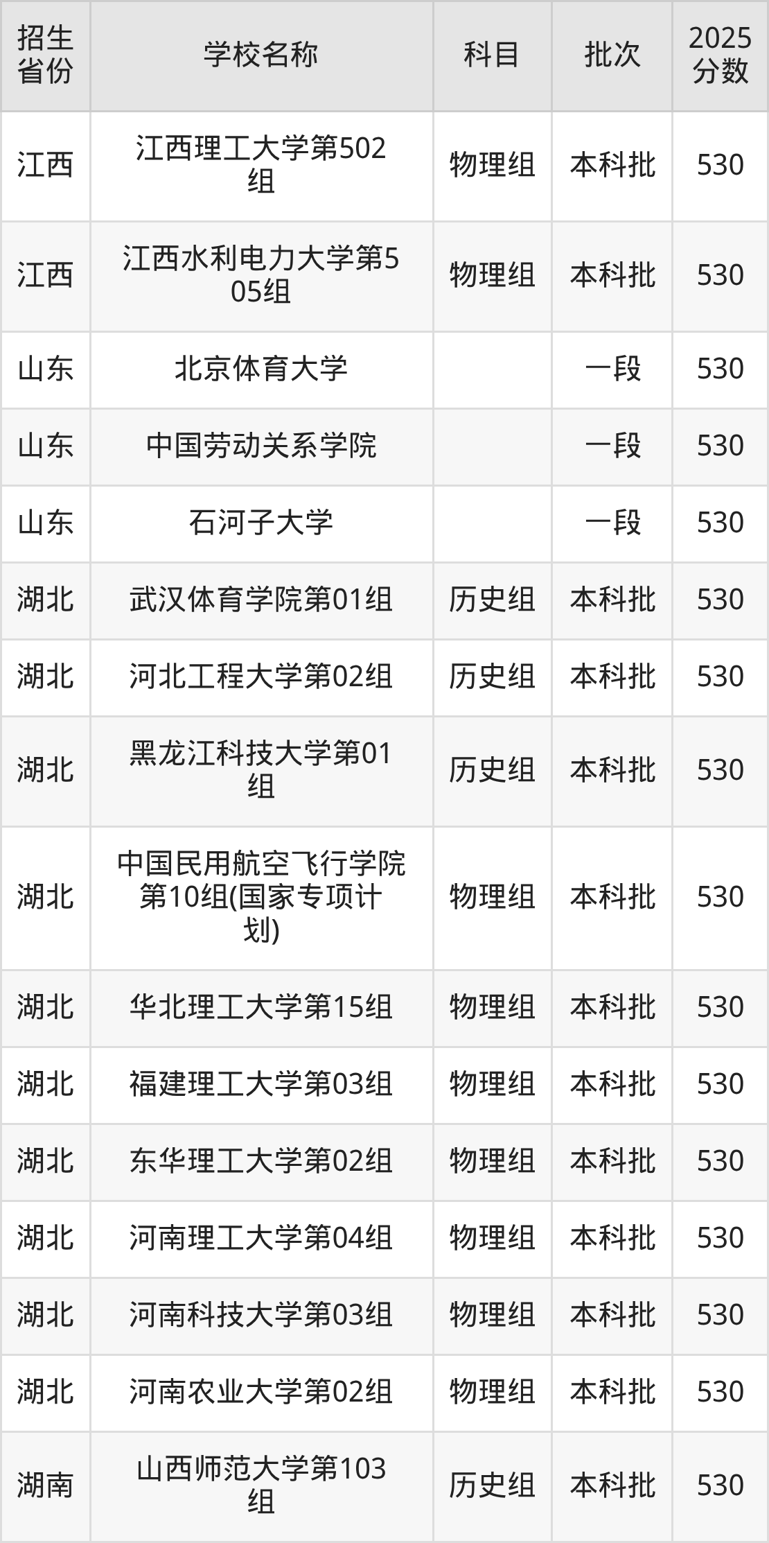 筛选全国各省2025年录取分数线为530分的重点大学如下: