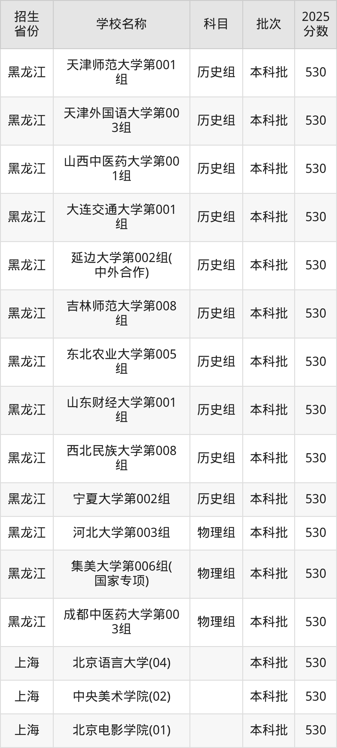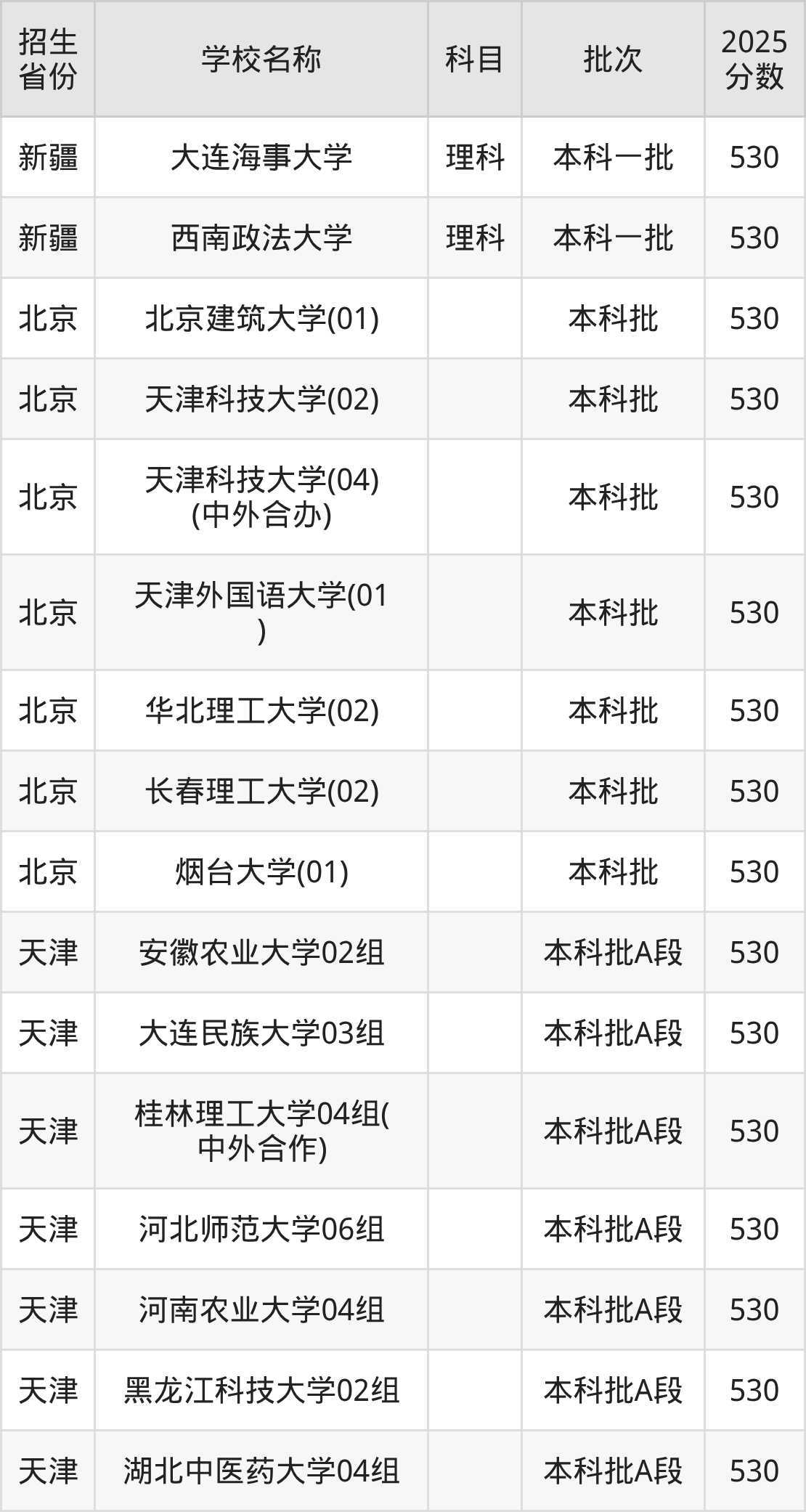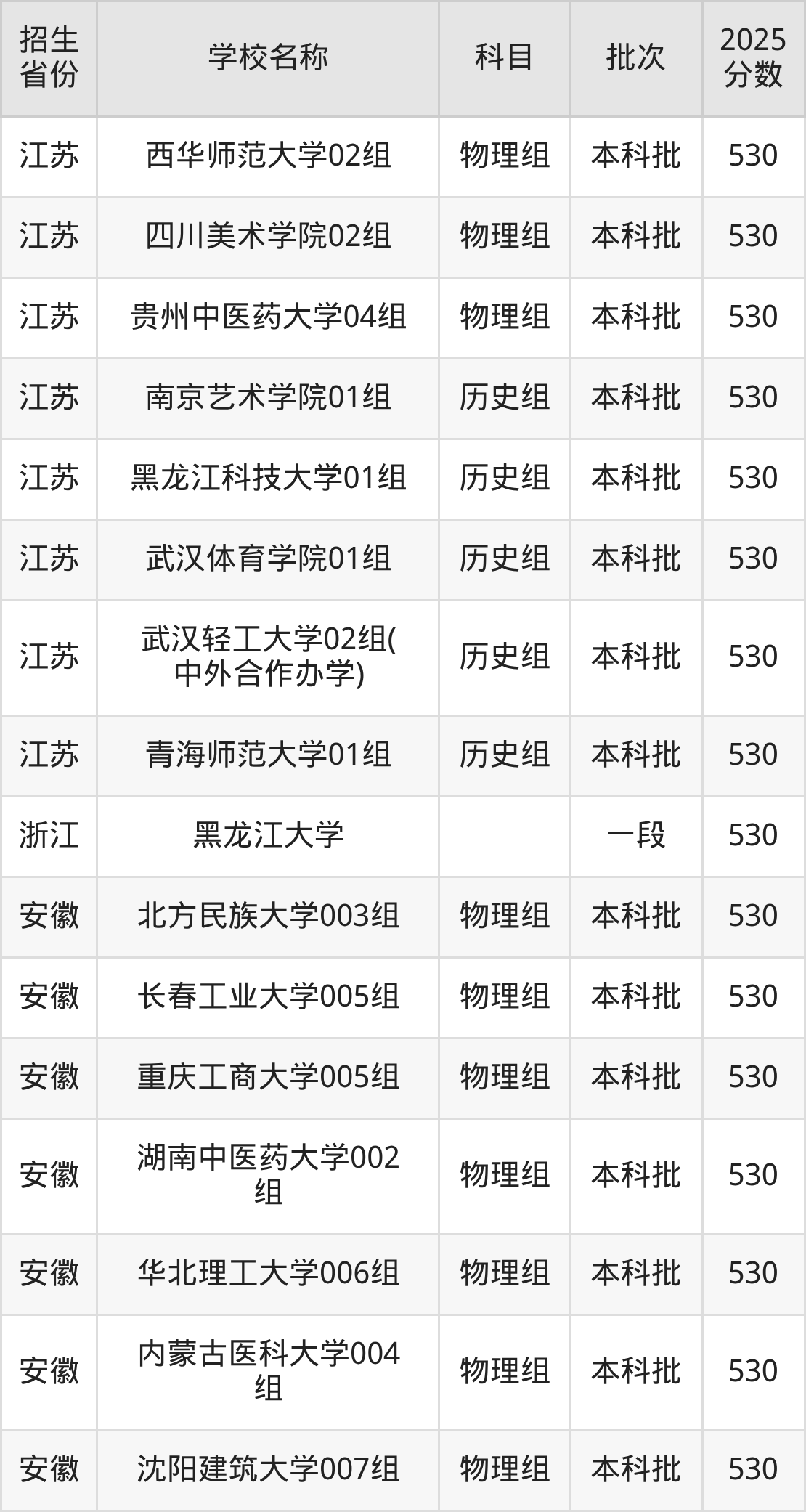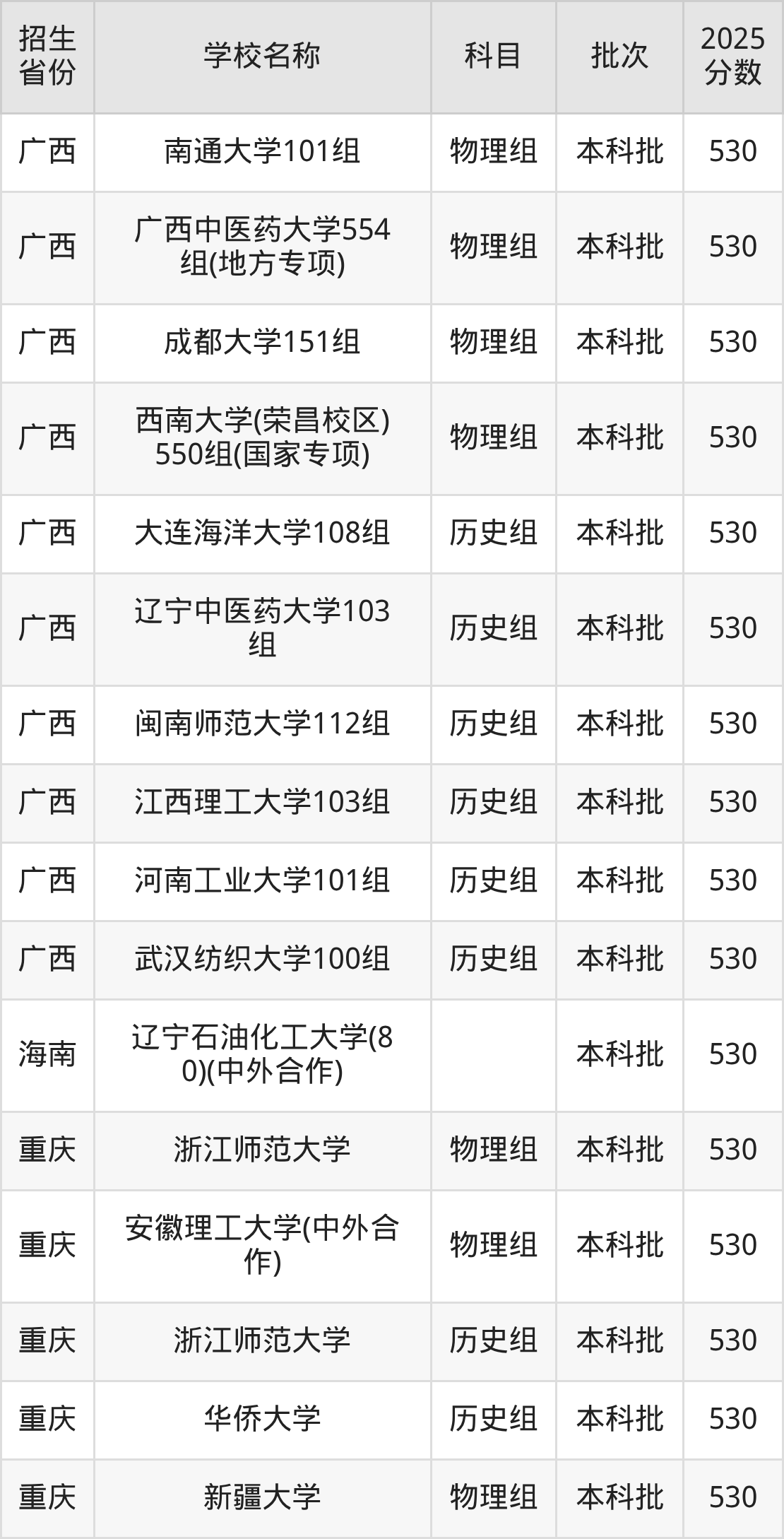 筛选全国各省2025年录取分数线为530分的重点大学如下: